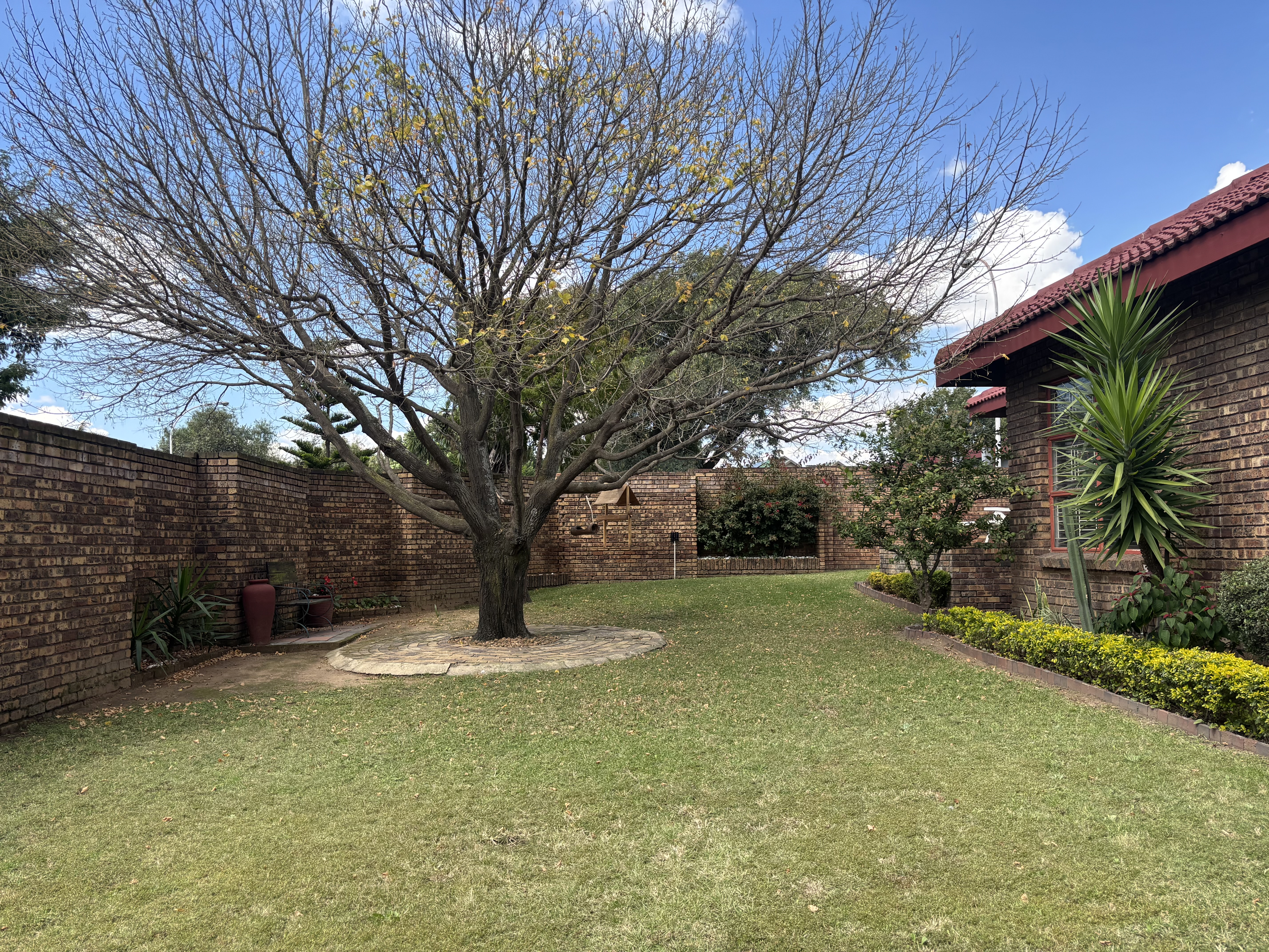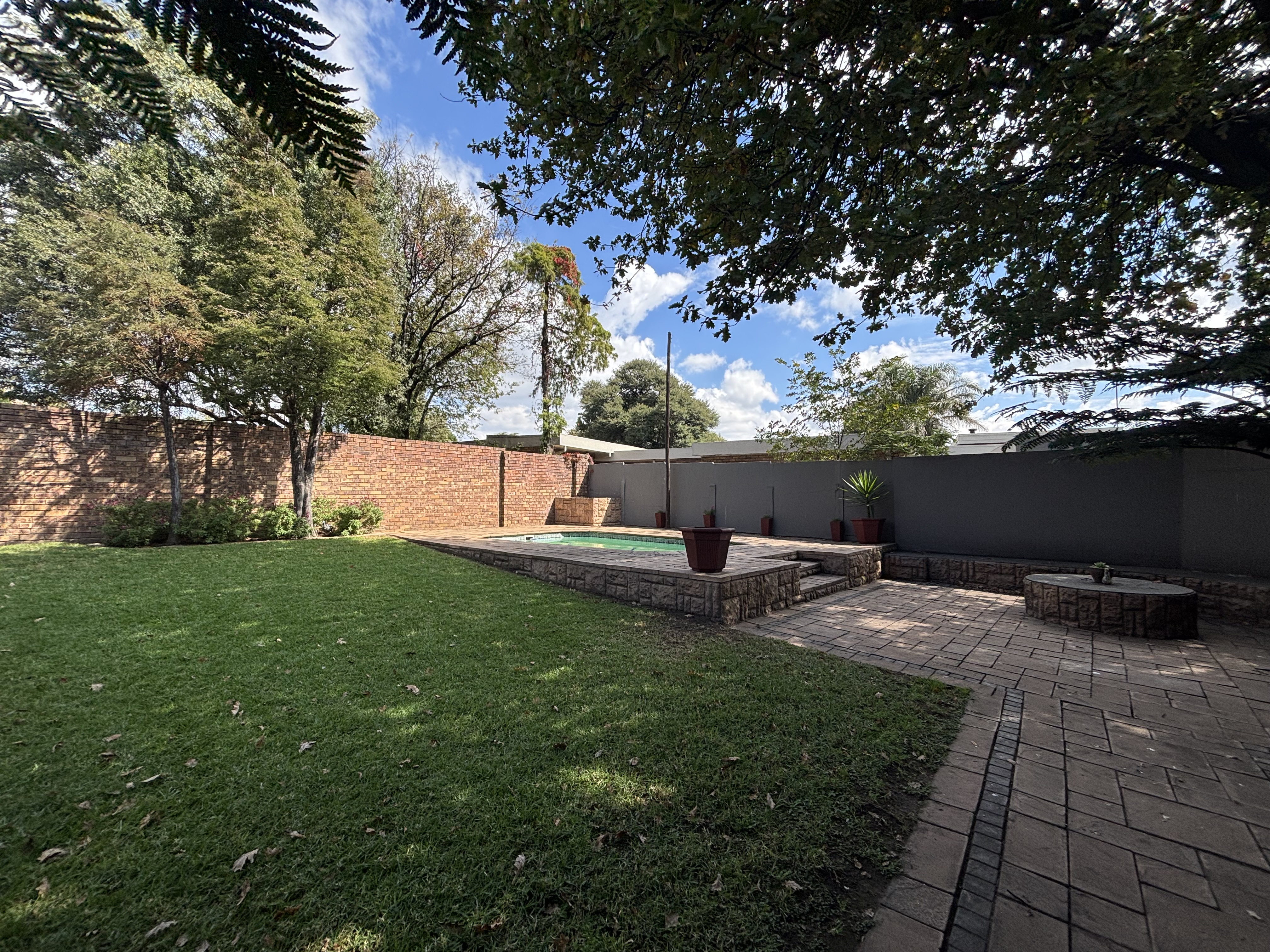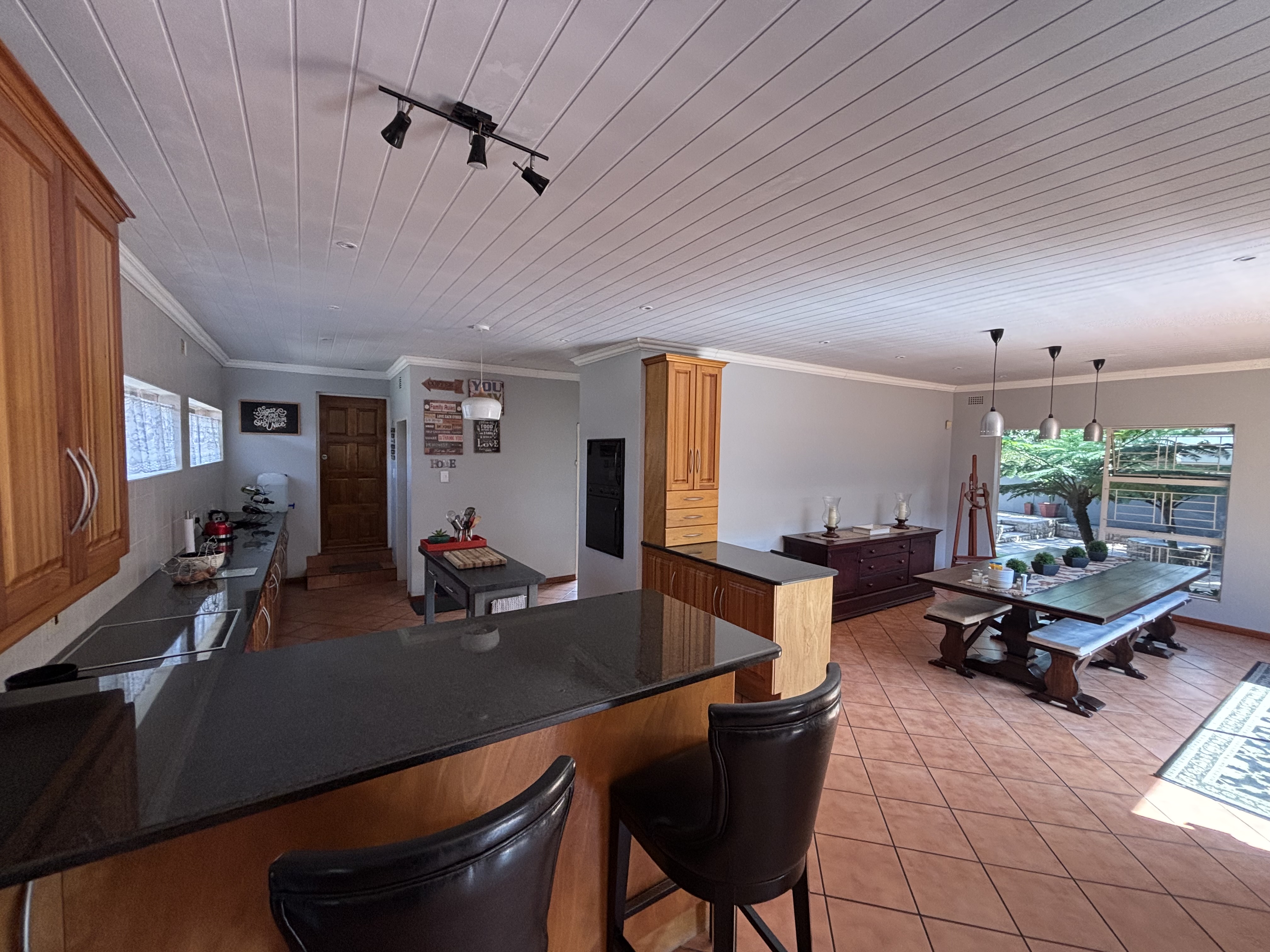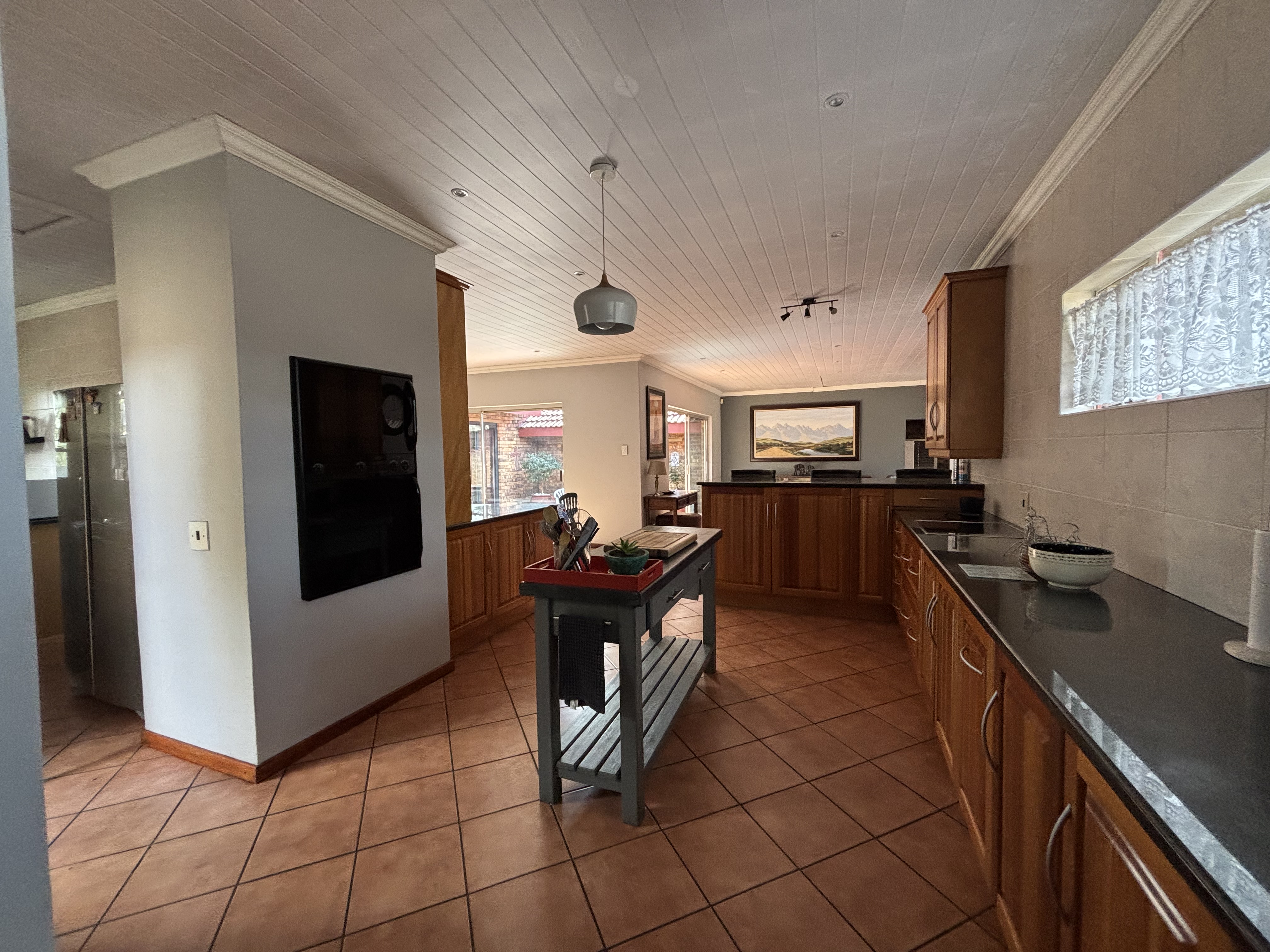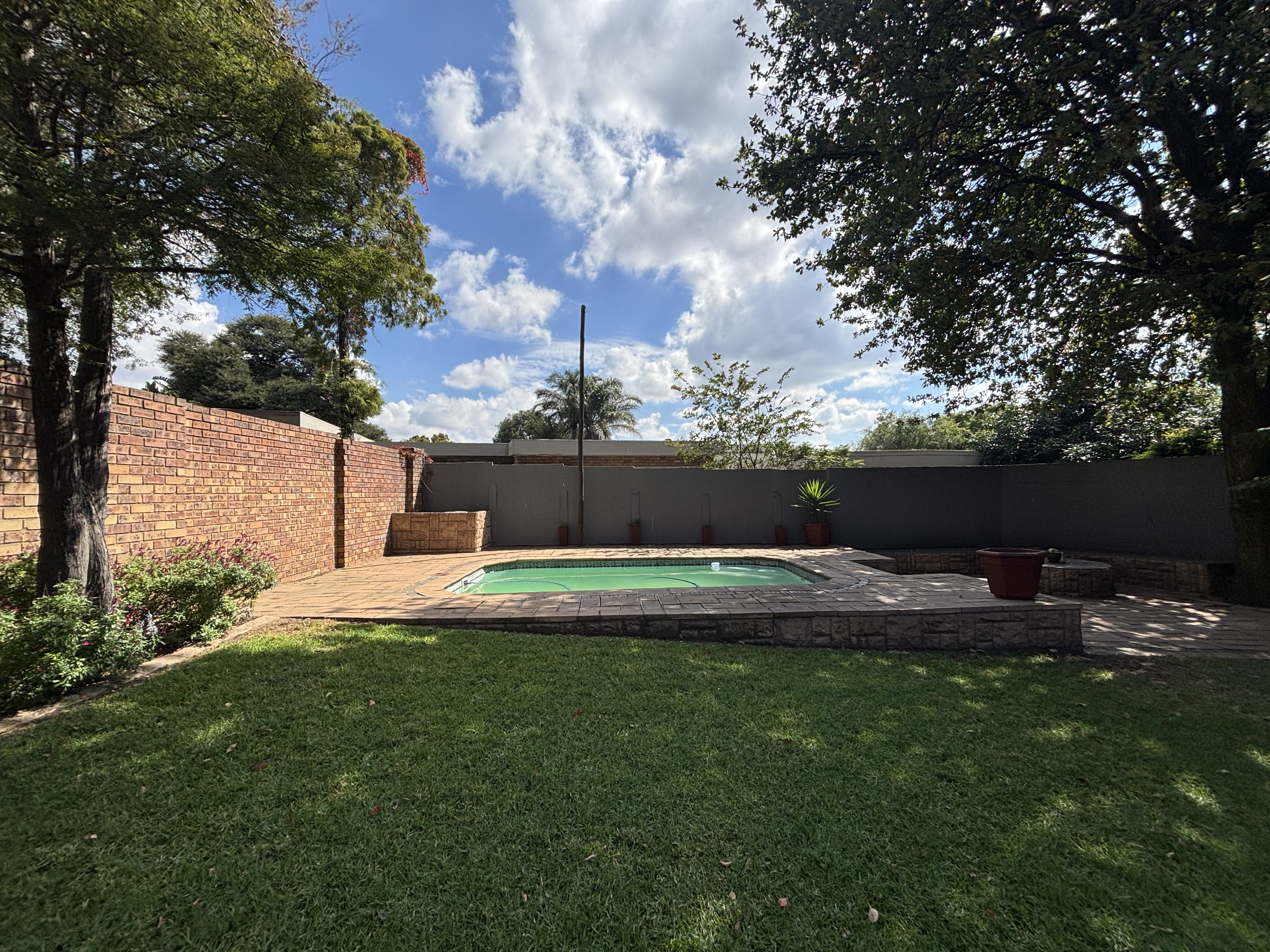A private patio is centrally positioned, accessible via sliding doors from both the living and dining areas. The enclosed entertainment space, complete with a built-in braai, is perfect for hosting gatherings during the winter months. This area seamlessly extends to the back garden, which features a lovely pool and boma area. The property also includes a double garage and carports for added convenience.
