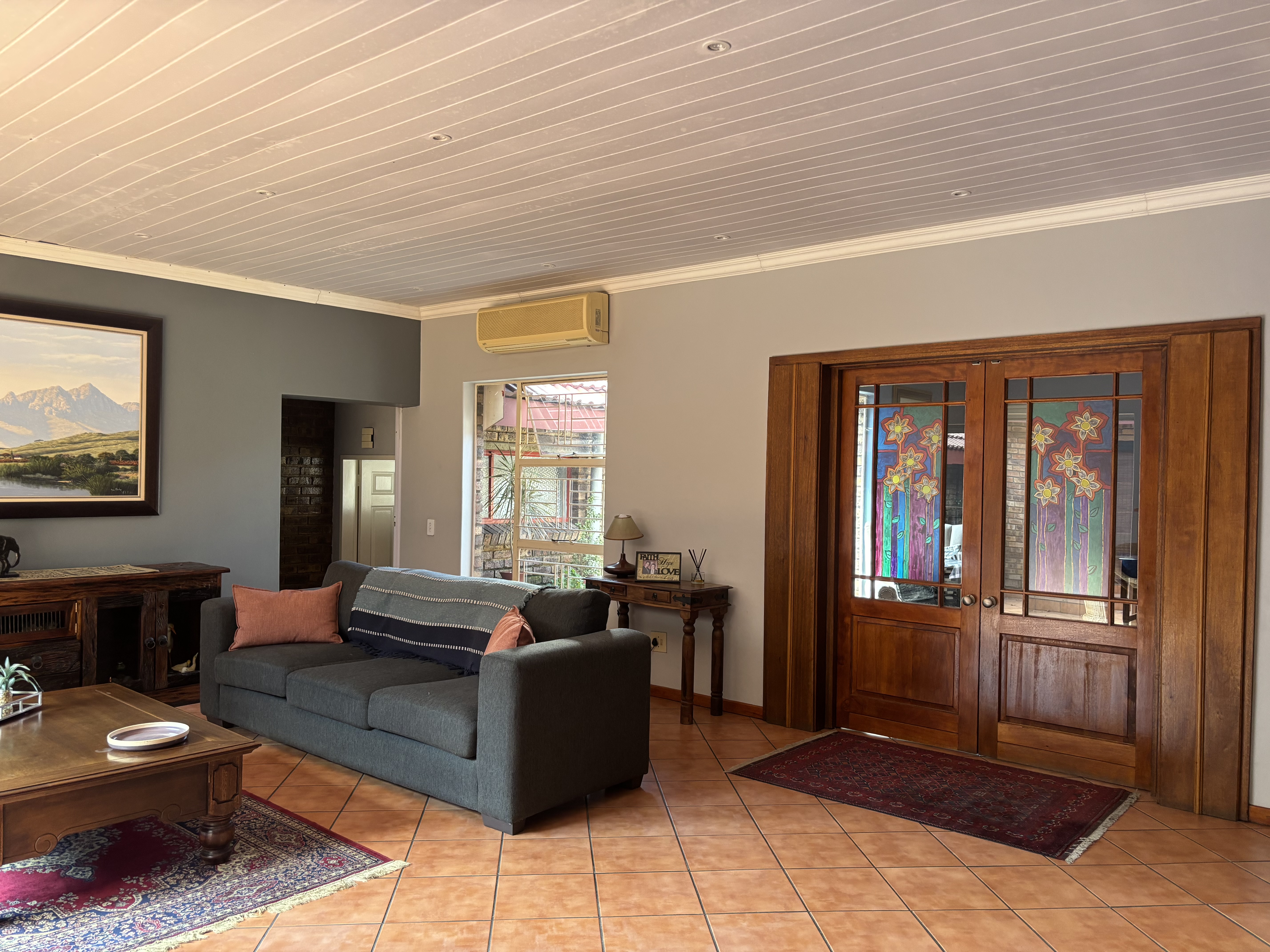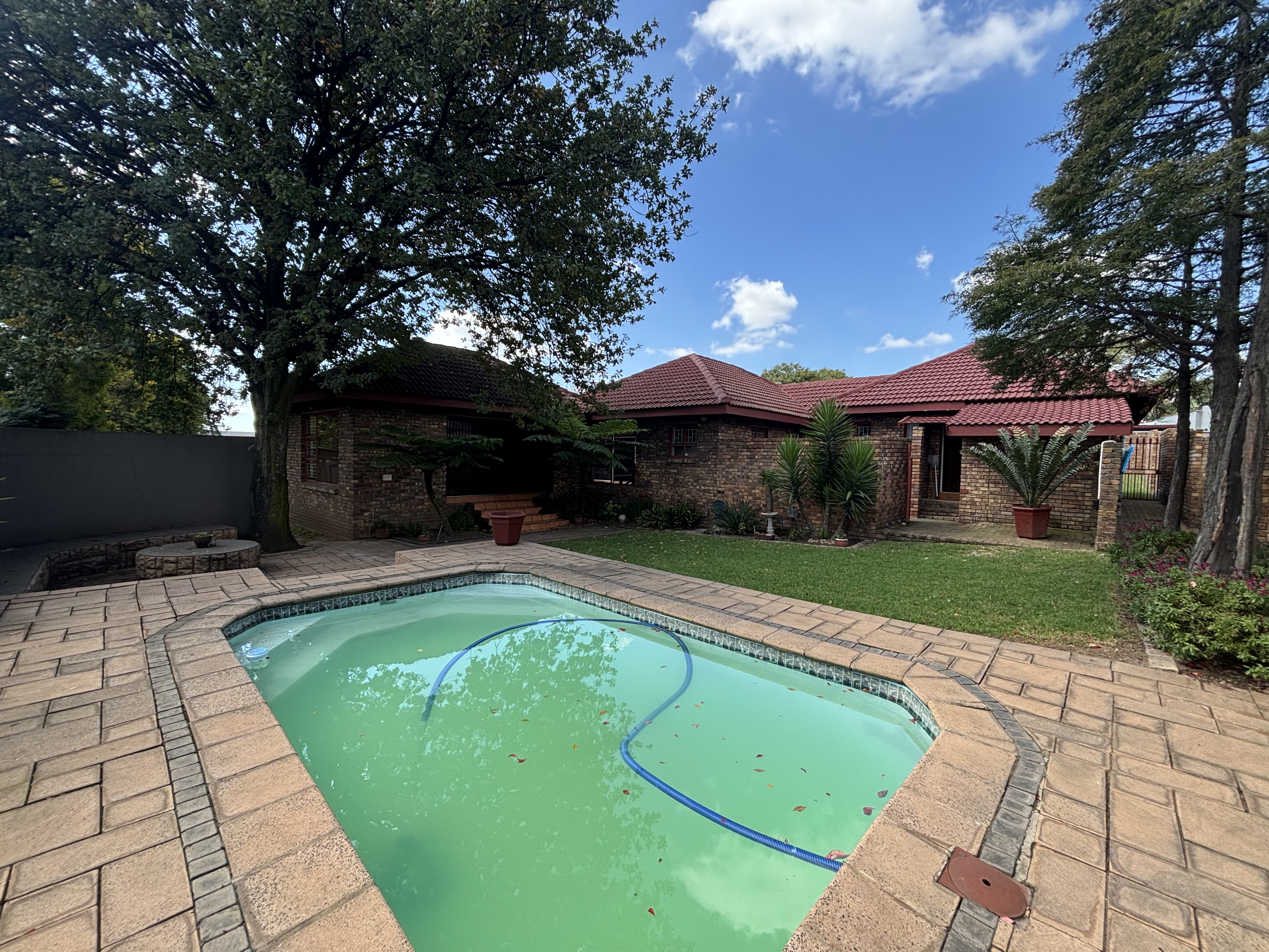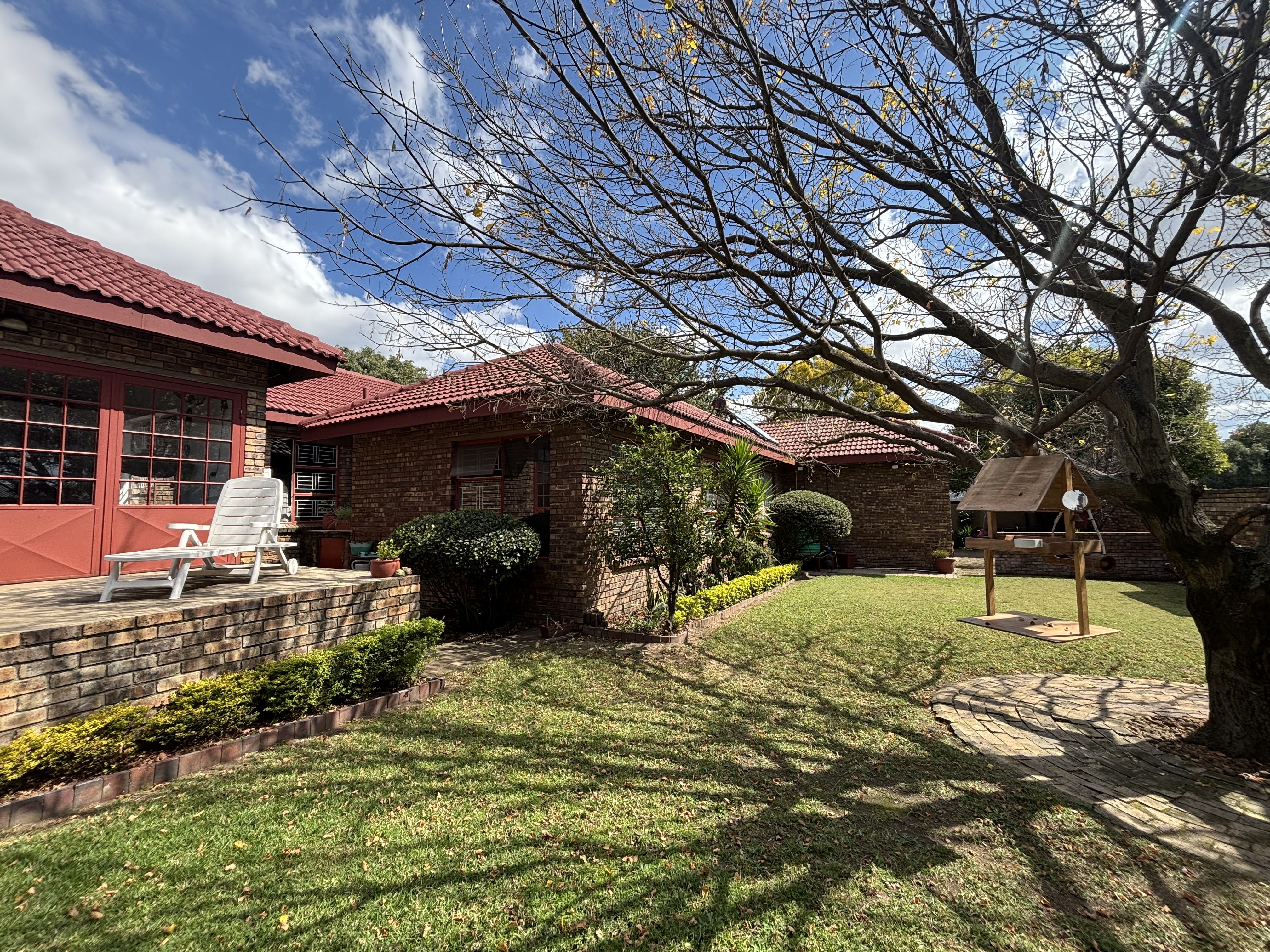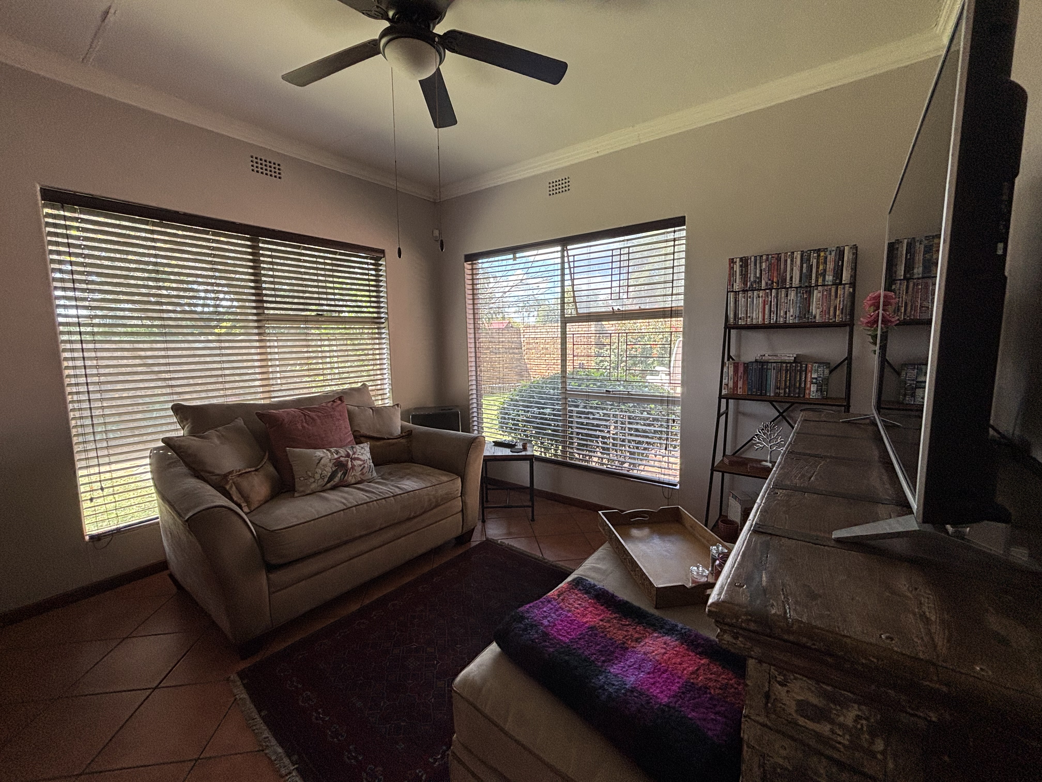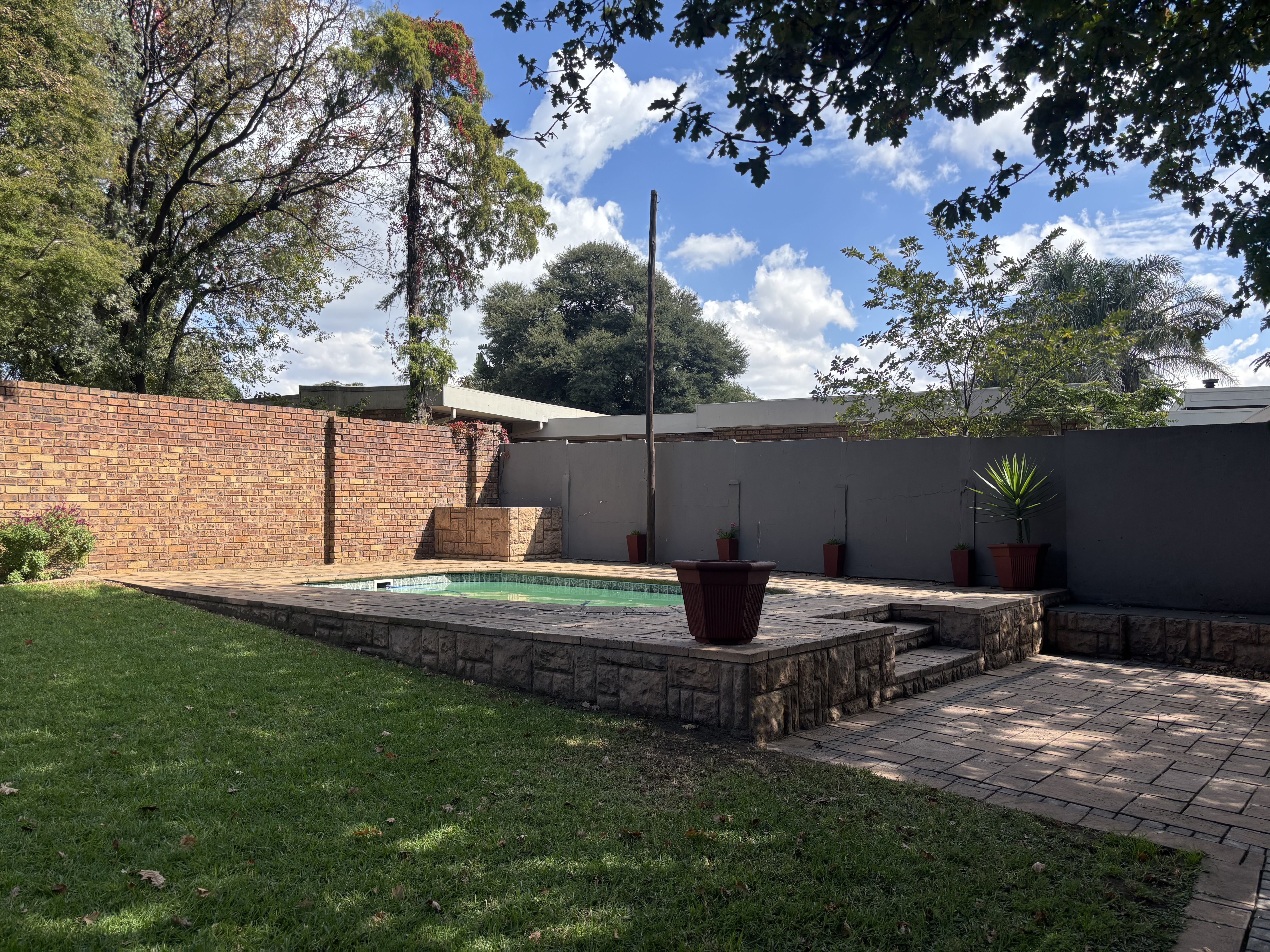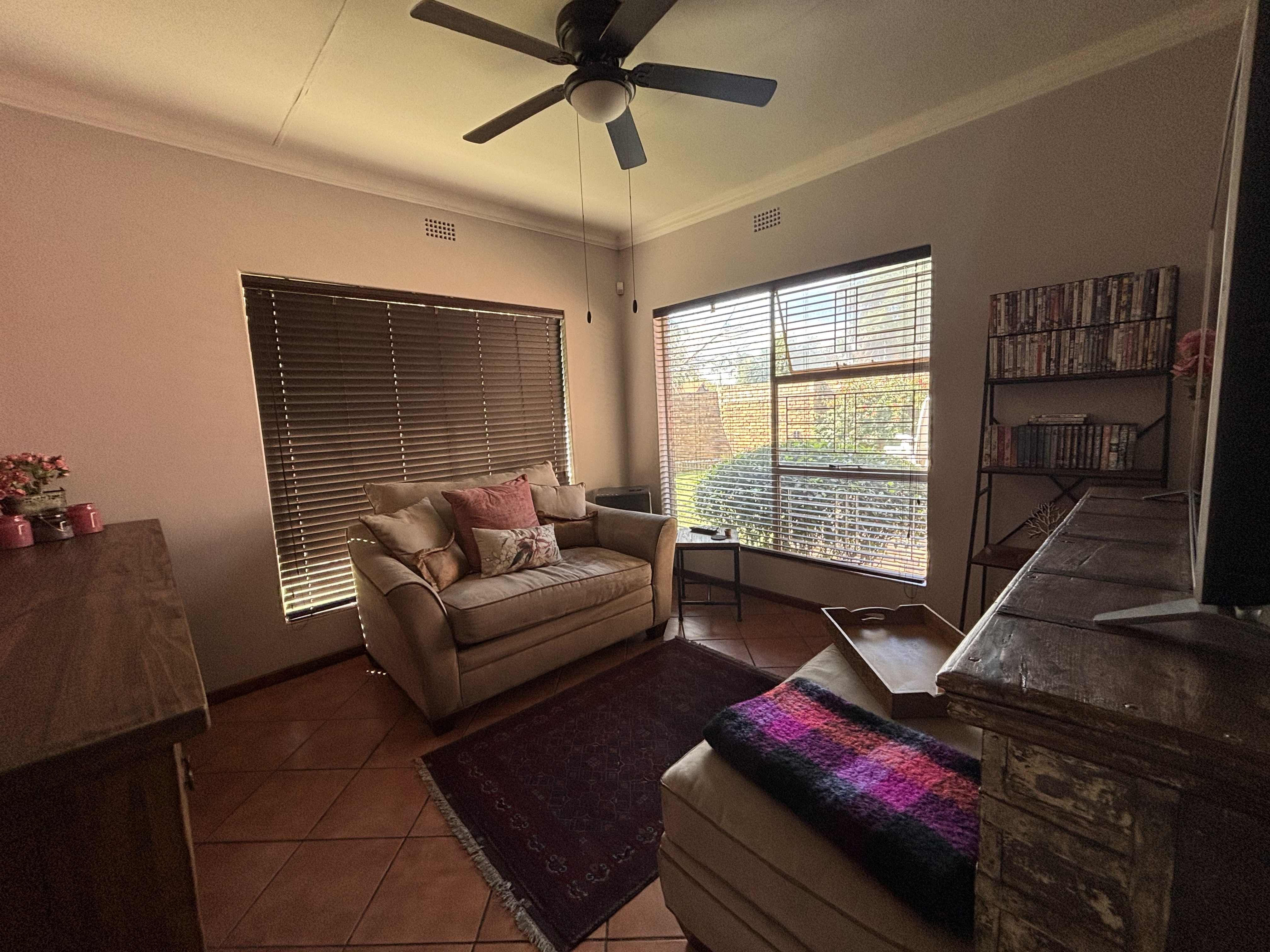 A private patio is centrally positioned, accessible via sliding doors from both the living and dining areas. The enclosed entertainment space, complete with a built-in braai, is perfect for hosting gatherings during the winter months. This area seamlessly extends to the back garden, which features a lovely pool and boma area. The property also includes a double garage and carports for added convenience.