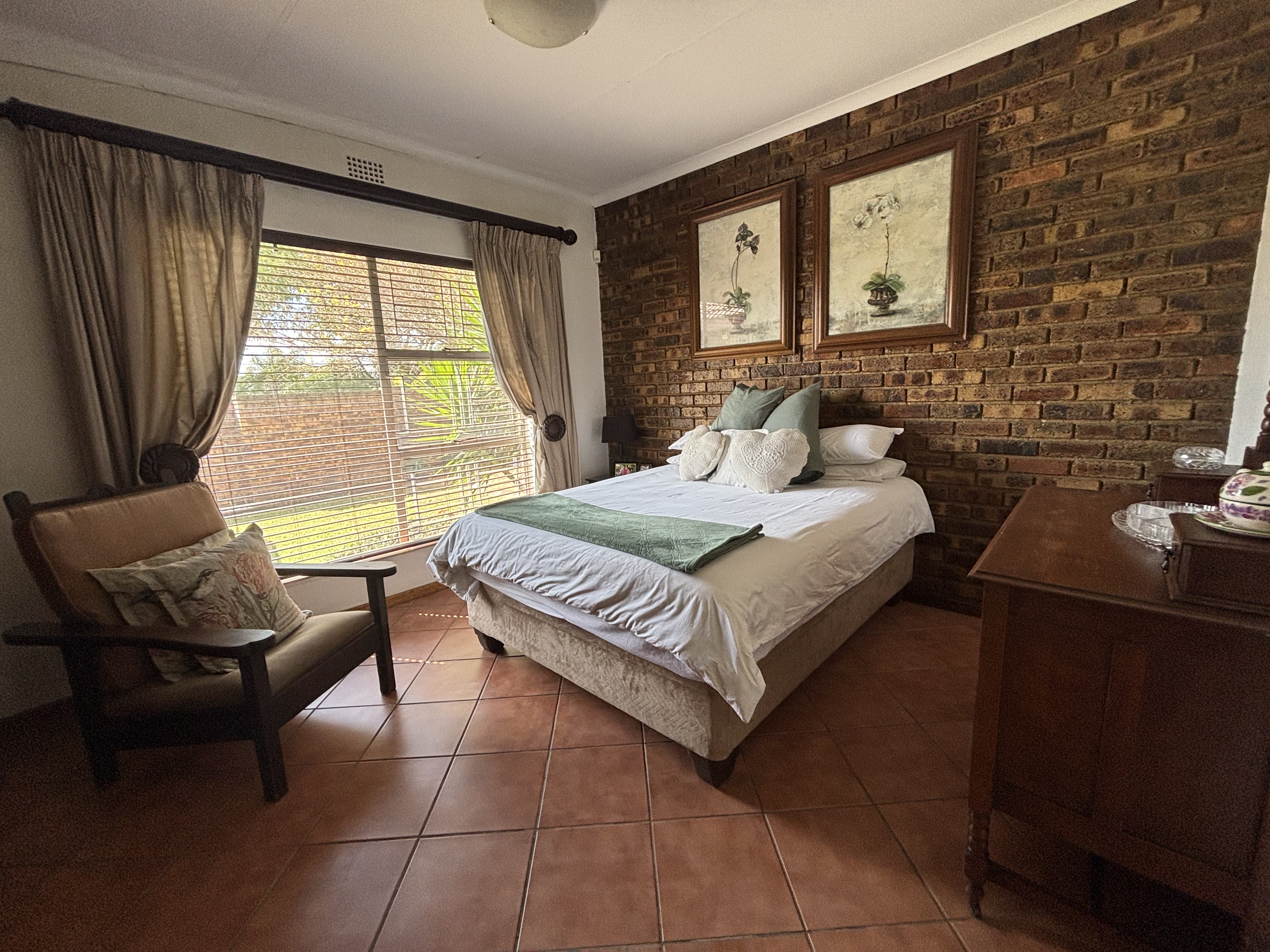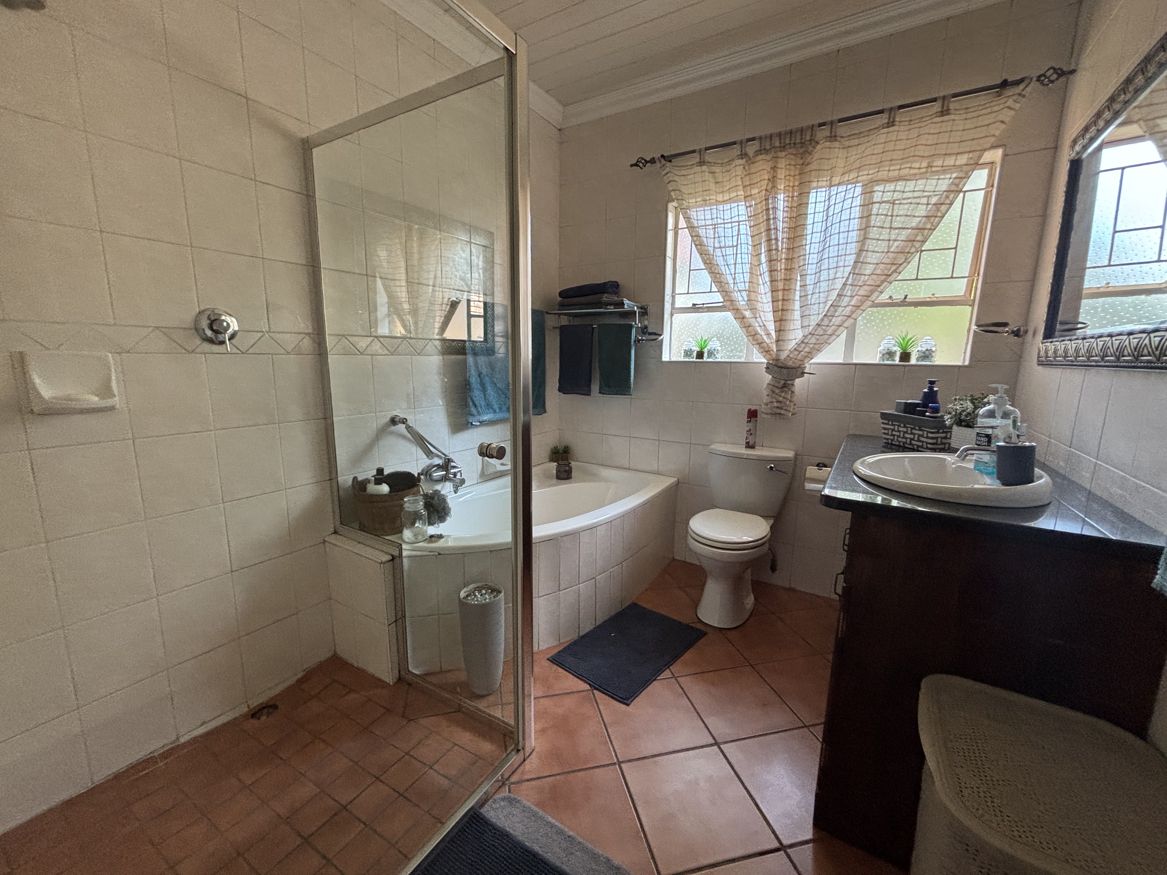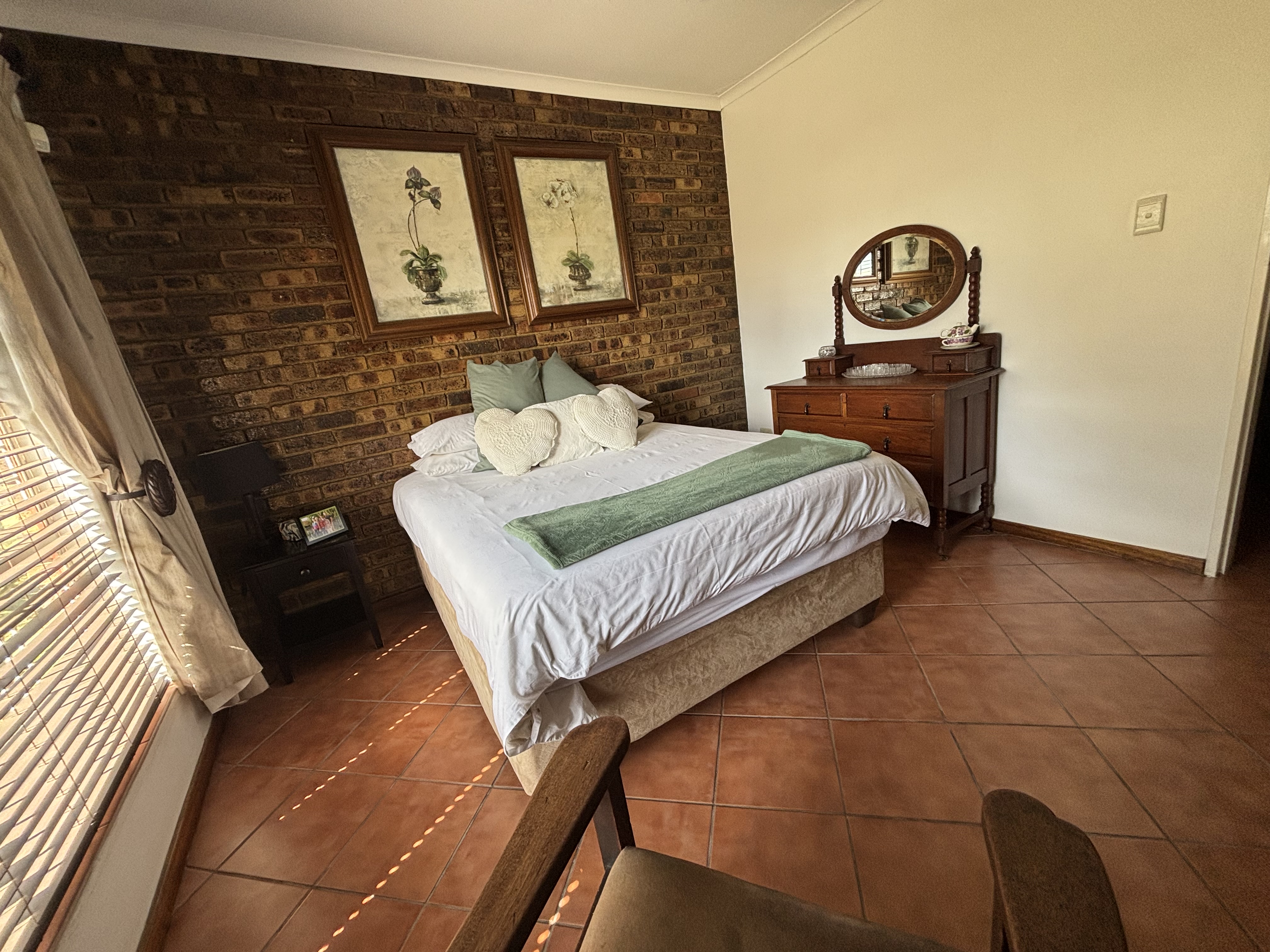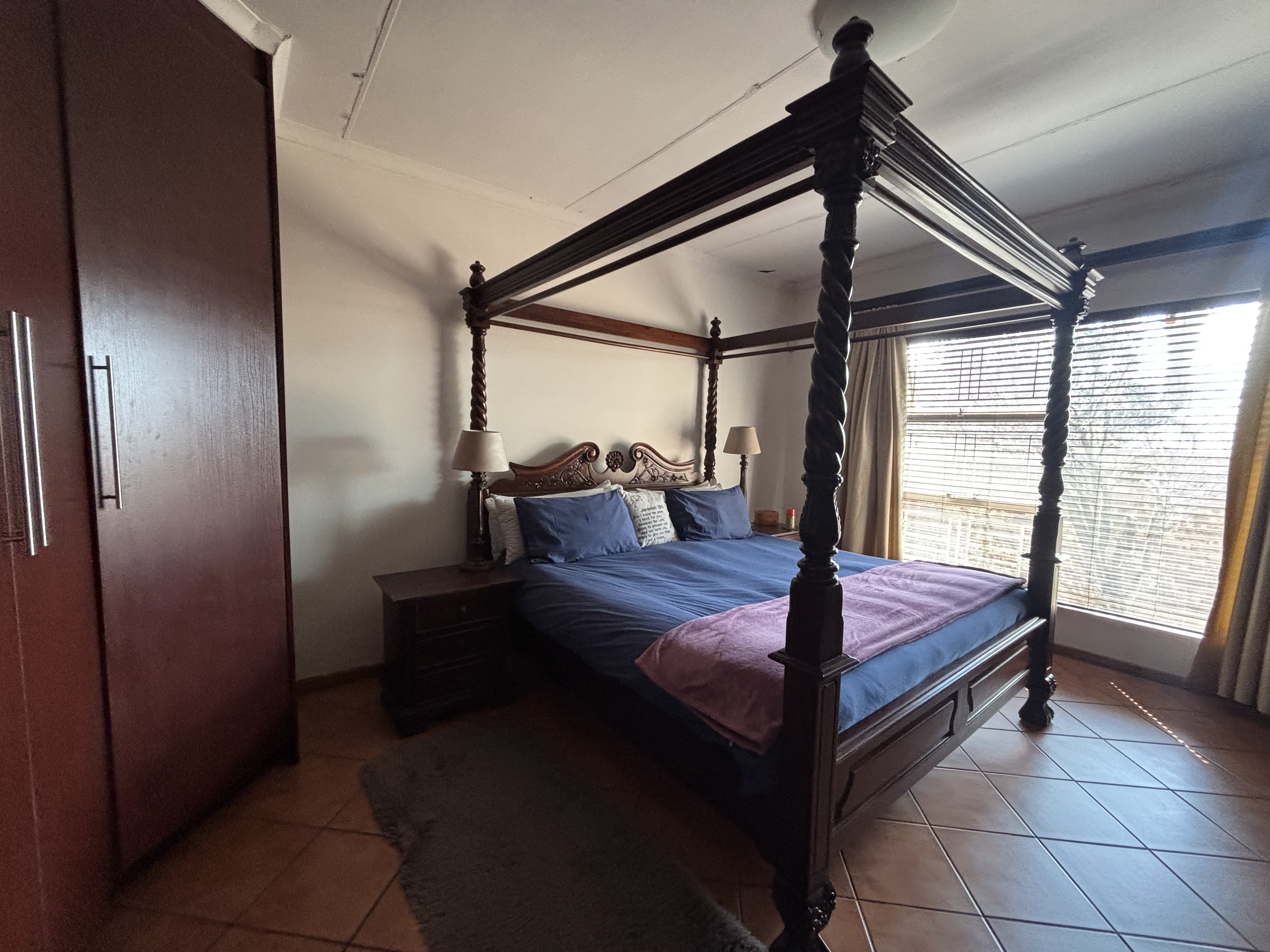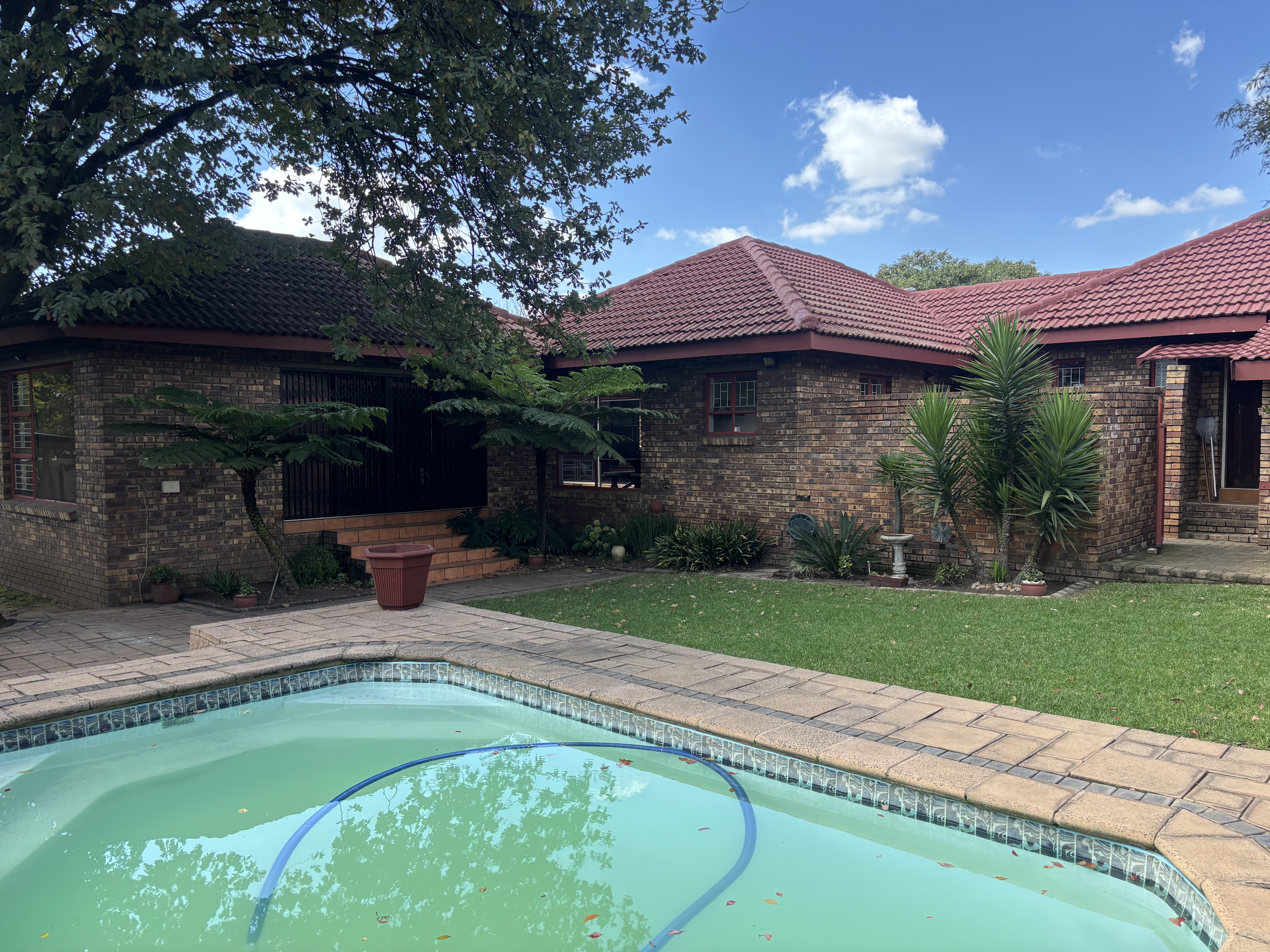 A private patio is centrally positioned, accessible via sliding doors from both the living and dining areas. The enclosed entertainment space, complete with a built-in braai, is perfect for hosting gatherings during the winter months. This area seamlessly extends to the back garden, which features a lovely pool and boma area. The property also includes a double garage and carports for added convenience.