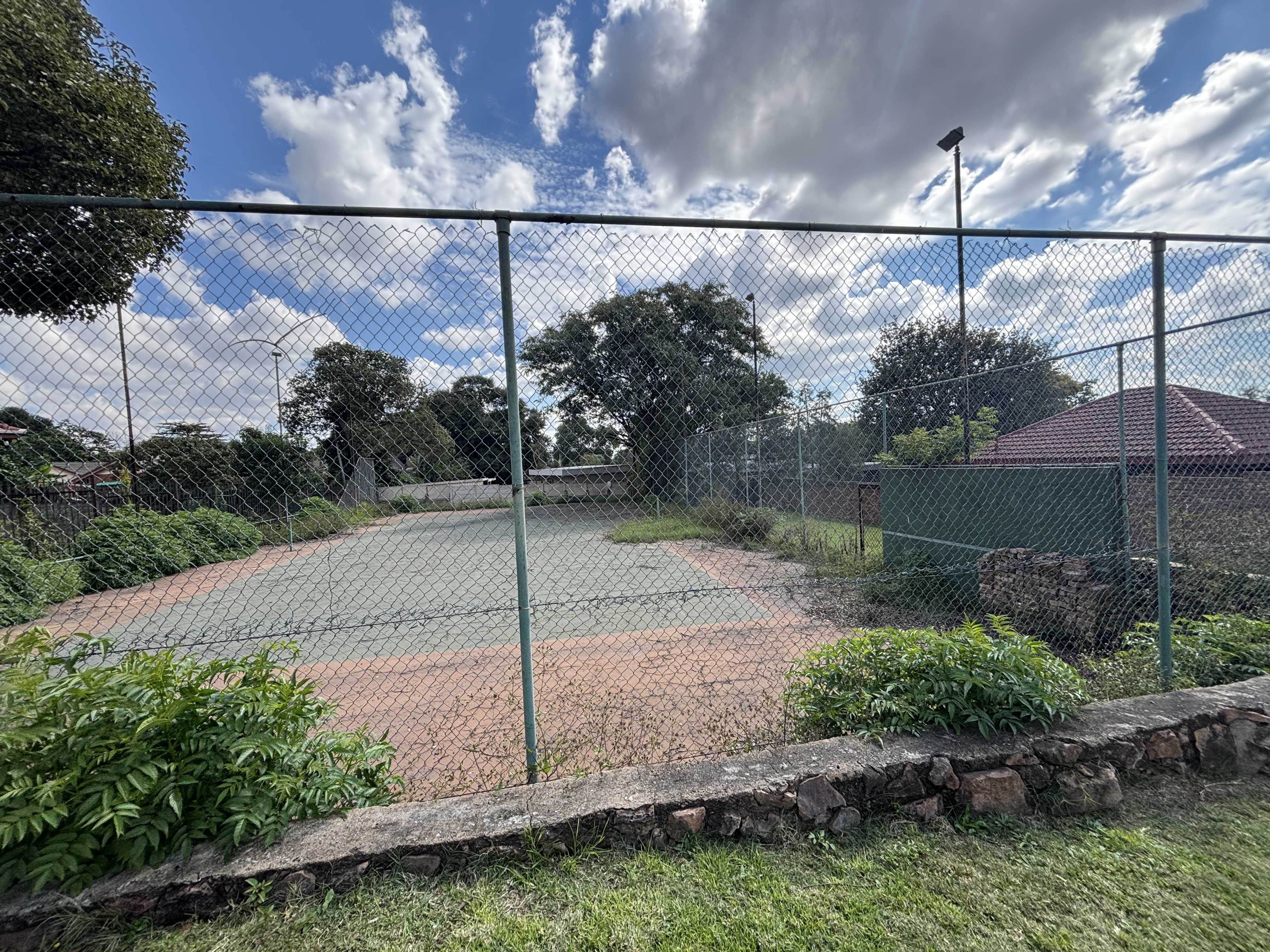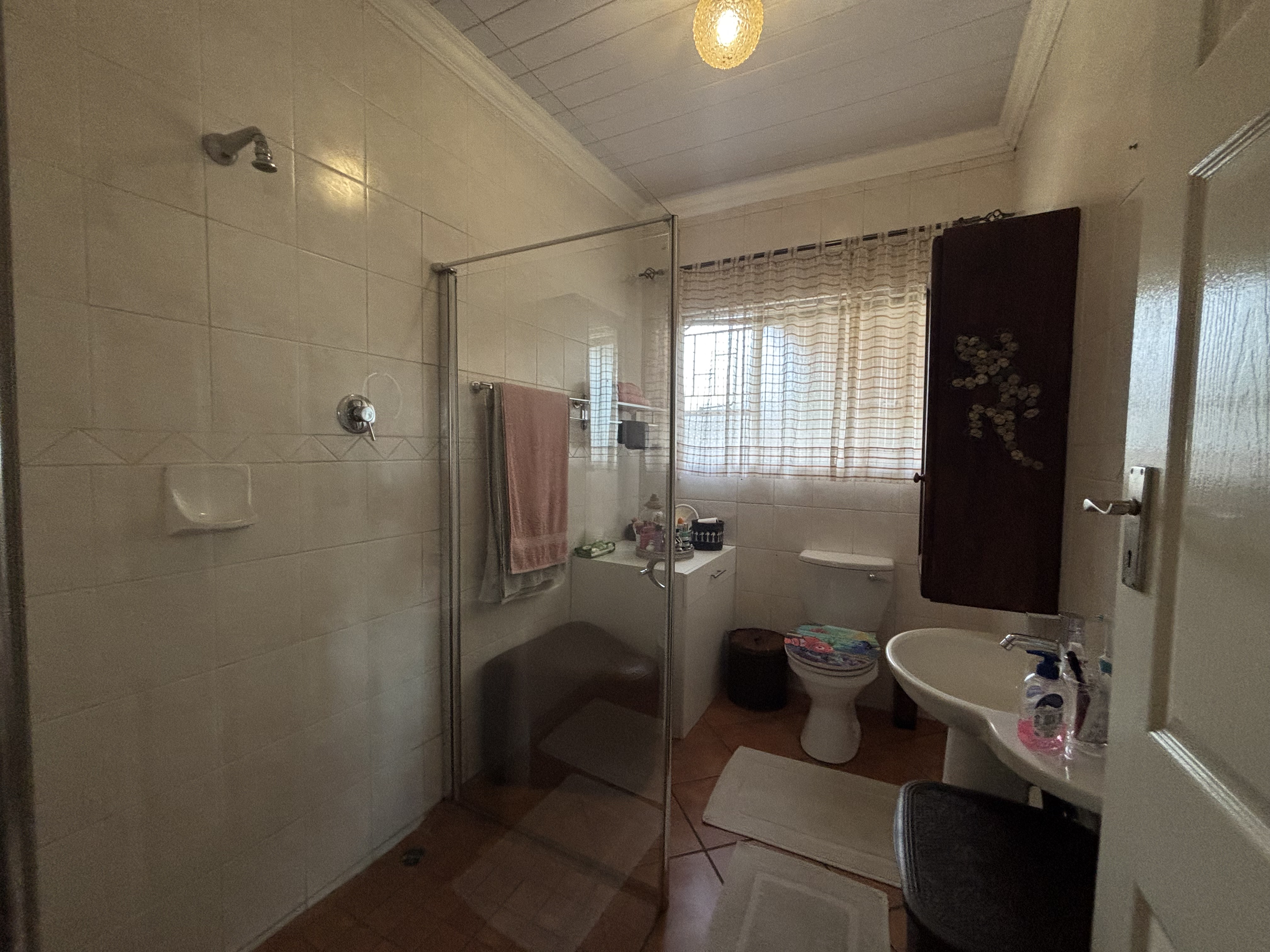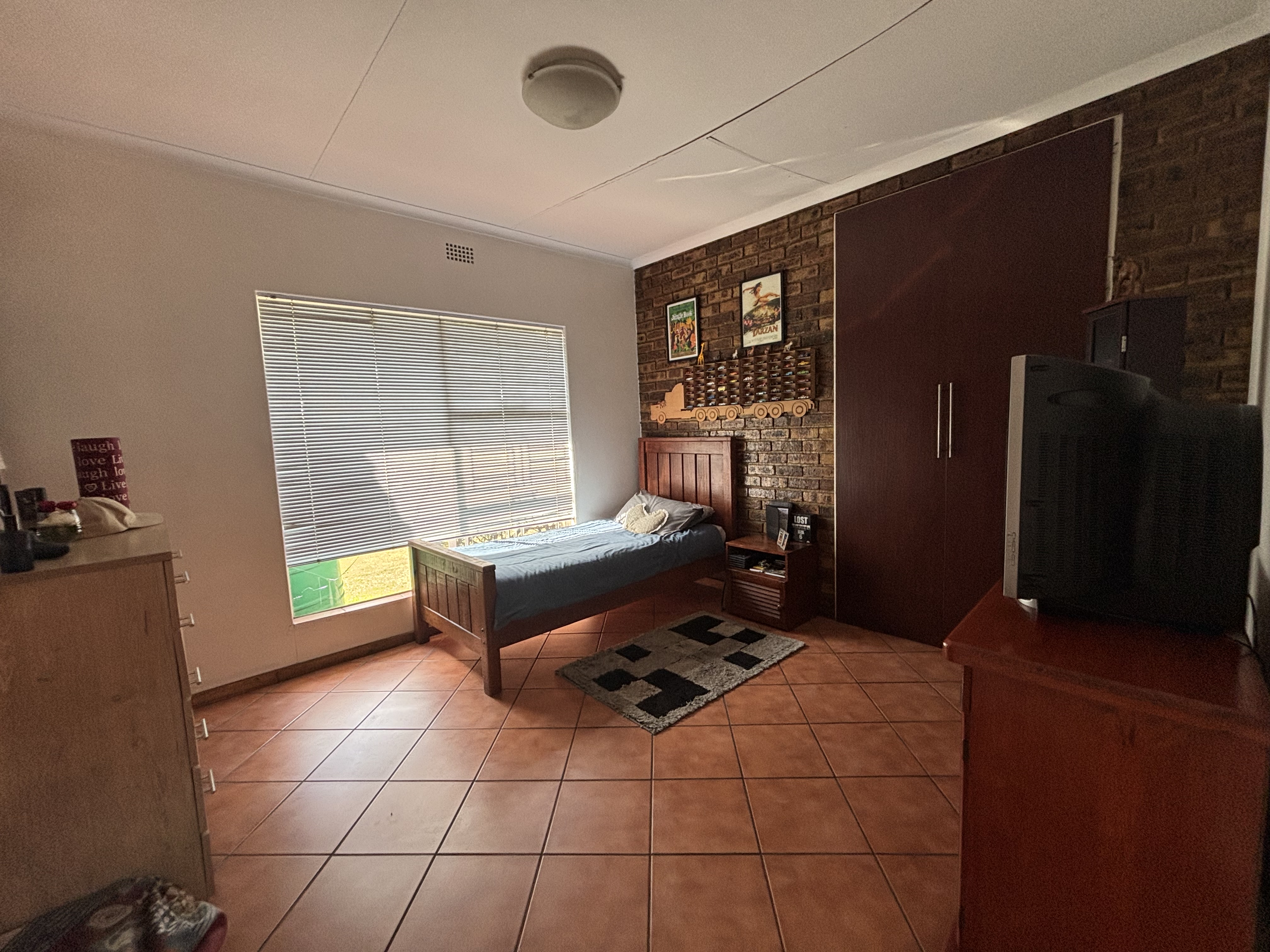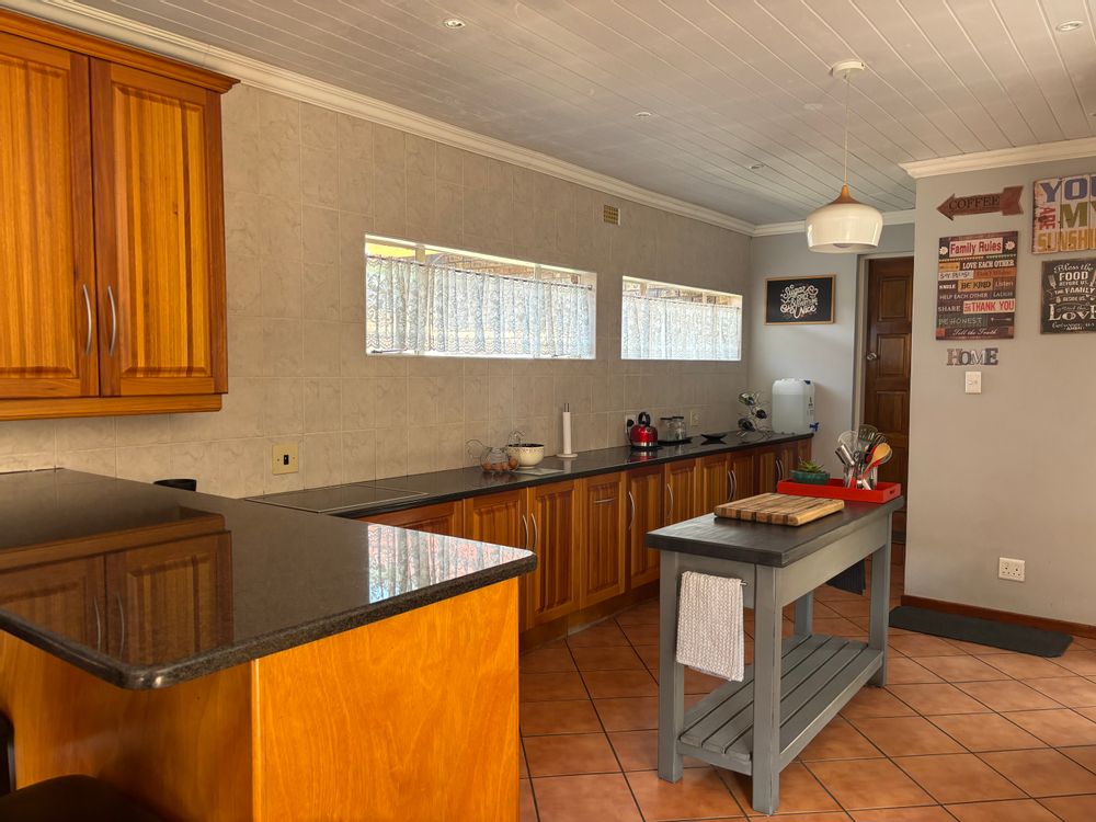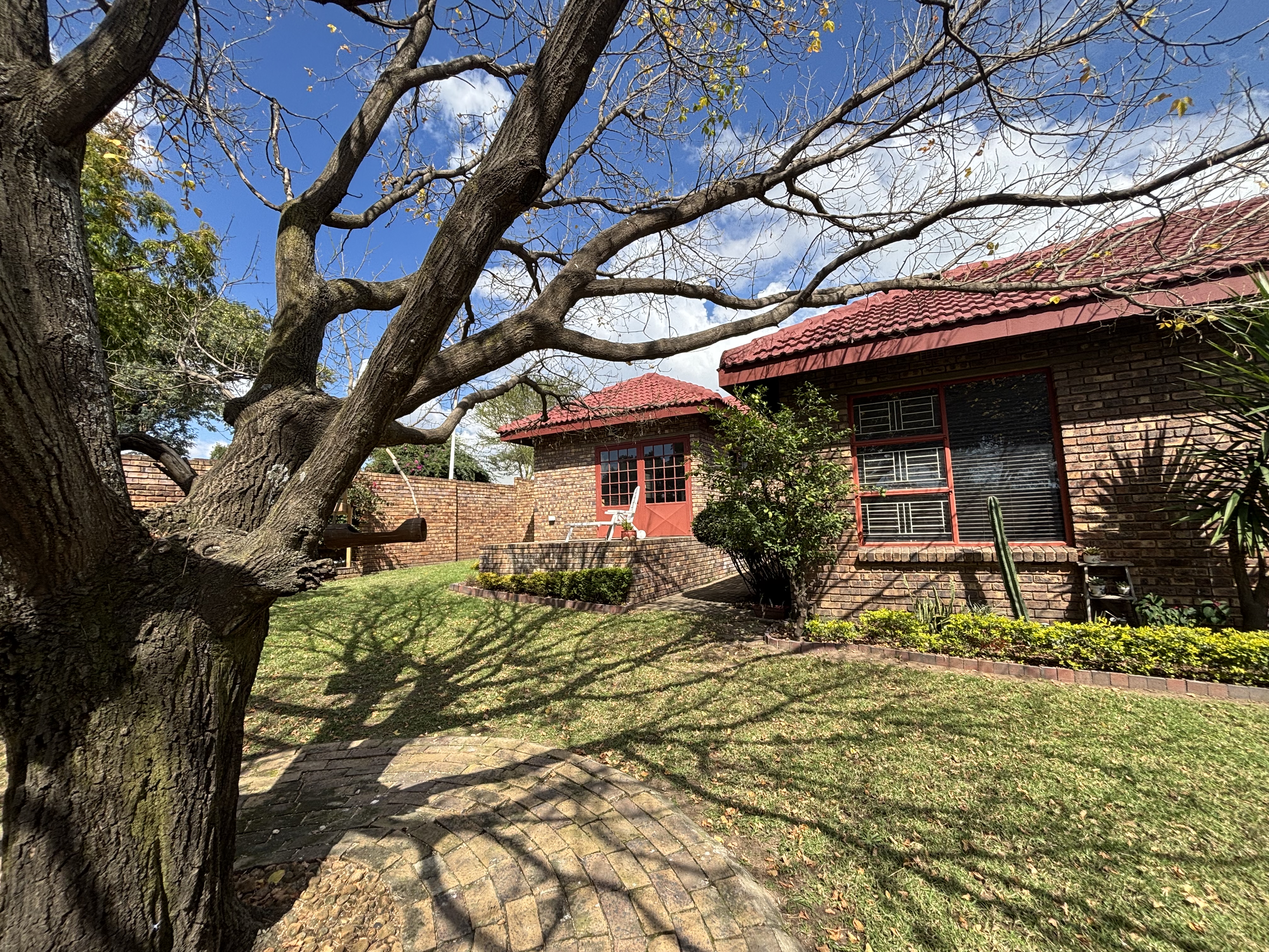 A private patio is centrally positioned, accessible via sliding doors from both the living and dining areas. The enclosed entertainment space, complete with a built-in braai, is perfect for hosting gatherings during the winter months. This area seamlessly extends to the back garden, which features a lovely pool and boma area. The property also includes a double garage and carports for added convenience.