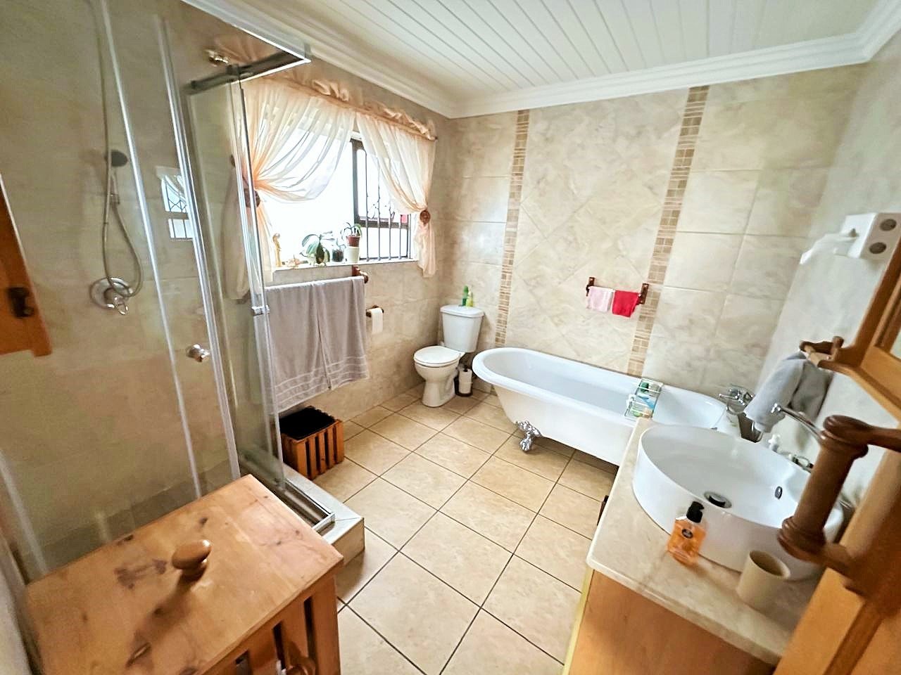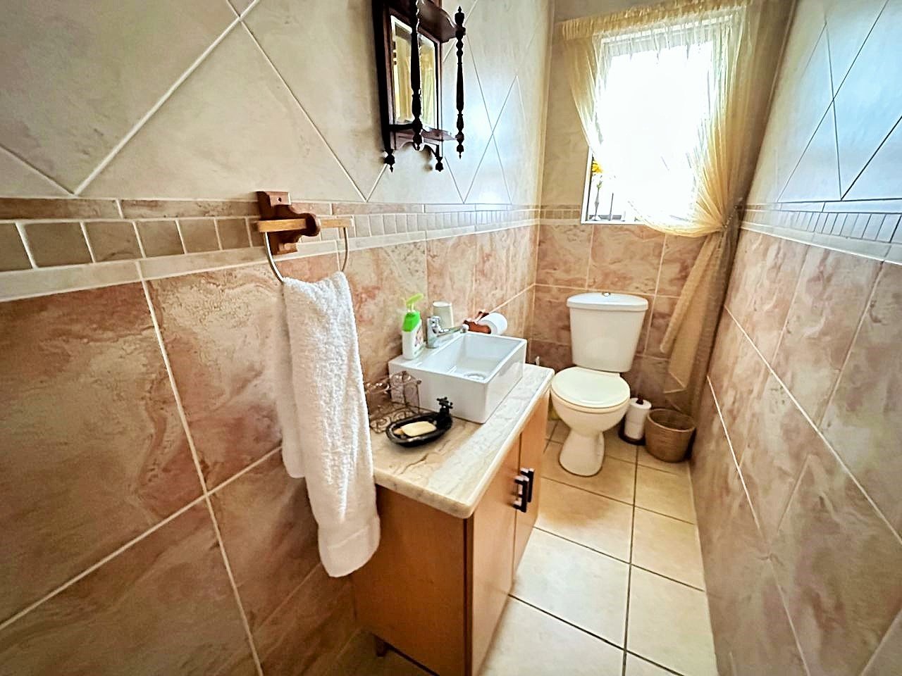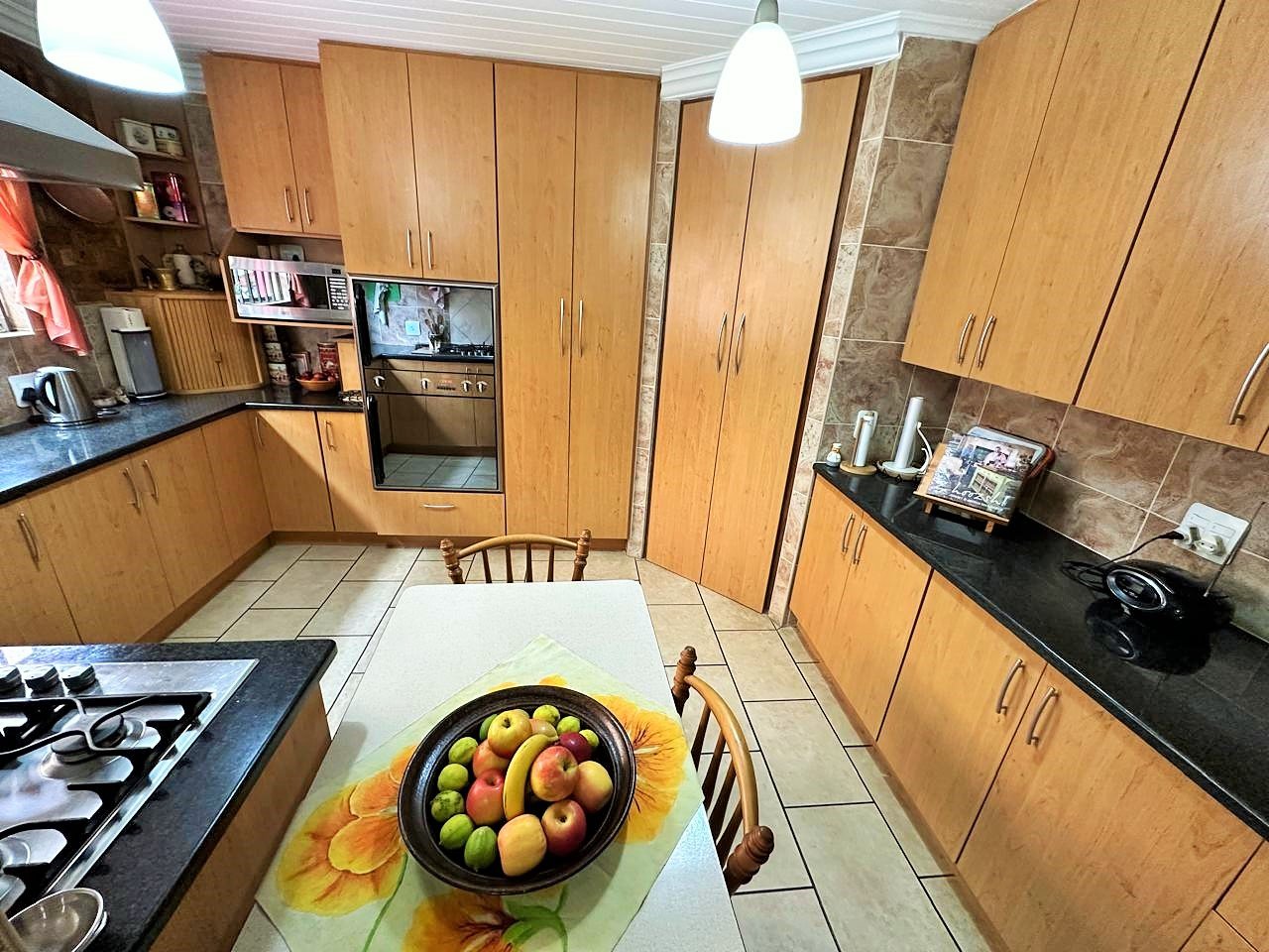 The downstairs section boasts an impressive kitchen with granite tops, floor-to-ceiling cupboards, a separate scullery that will accommodate all your appliances, as well as a huge main bedroom with a walk-in-closet and a full en-suite bathroom (heaters). Also find a guest toilet and study that could double as a fourth bedroom.