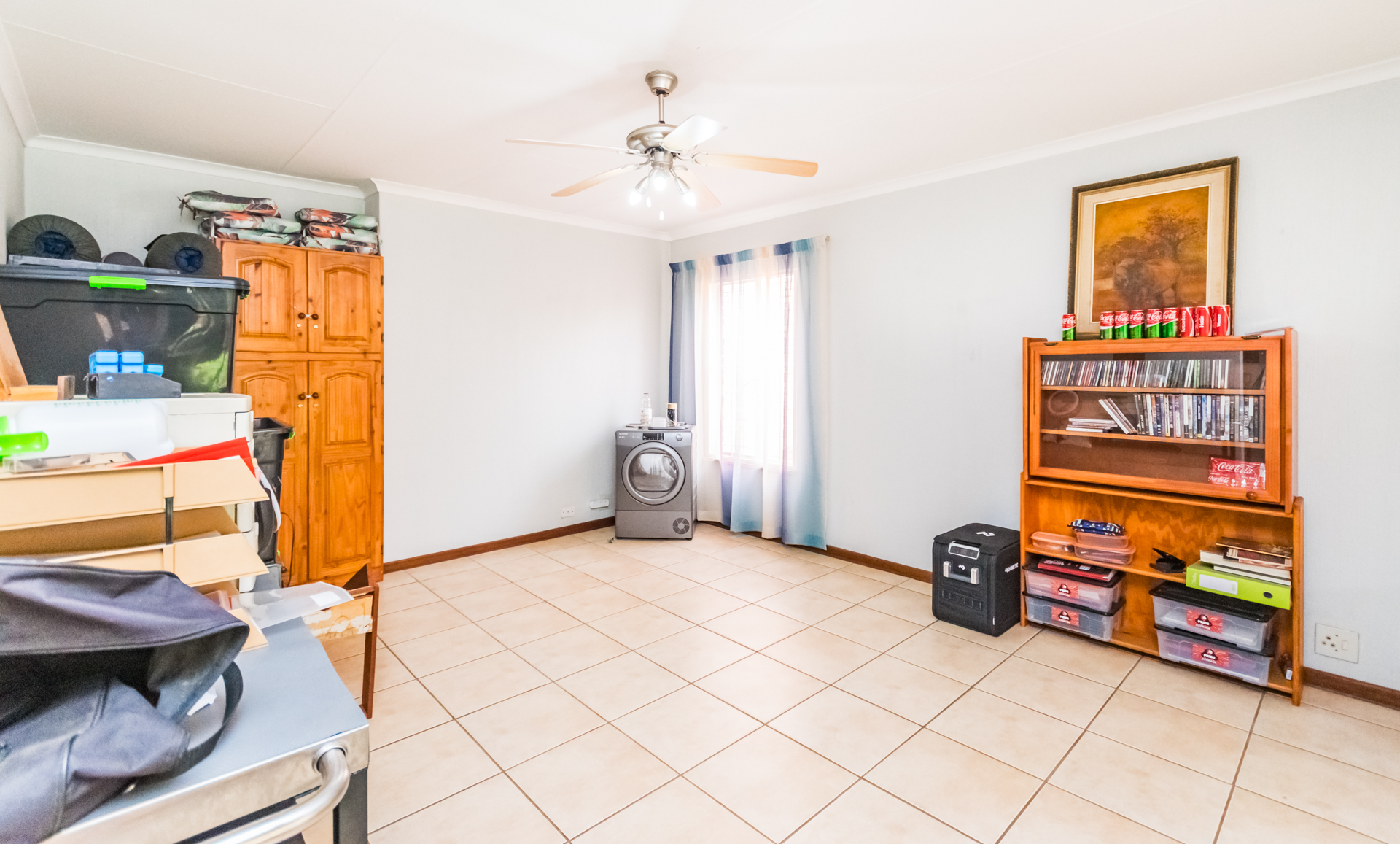 Inside, the property offers two comfortable living areas, both fitted with ceiling fans. One of the lounges opens via sliding doors onto a covered entertainment patio with a louvre roof, overlooking a pet-friendly garden. A separate dining room links the two living spaces, creating a seamless flow. The kitchen is well appointed with granite countertops, pantry cupboard, ample cupboard space, a separate scullery, and an oven with a gas hob.