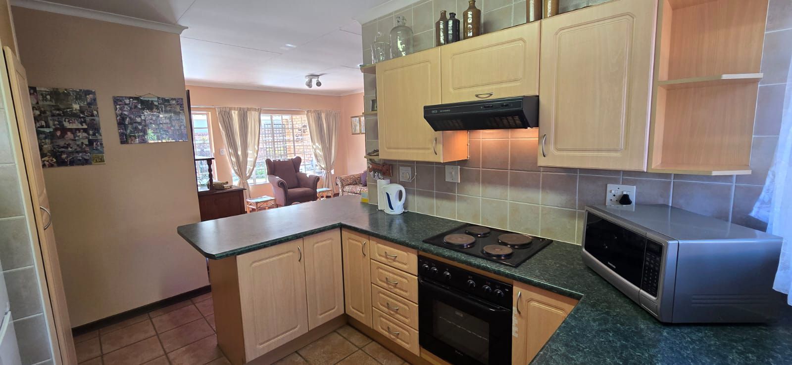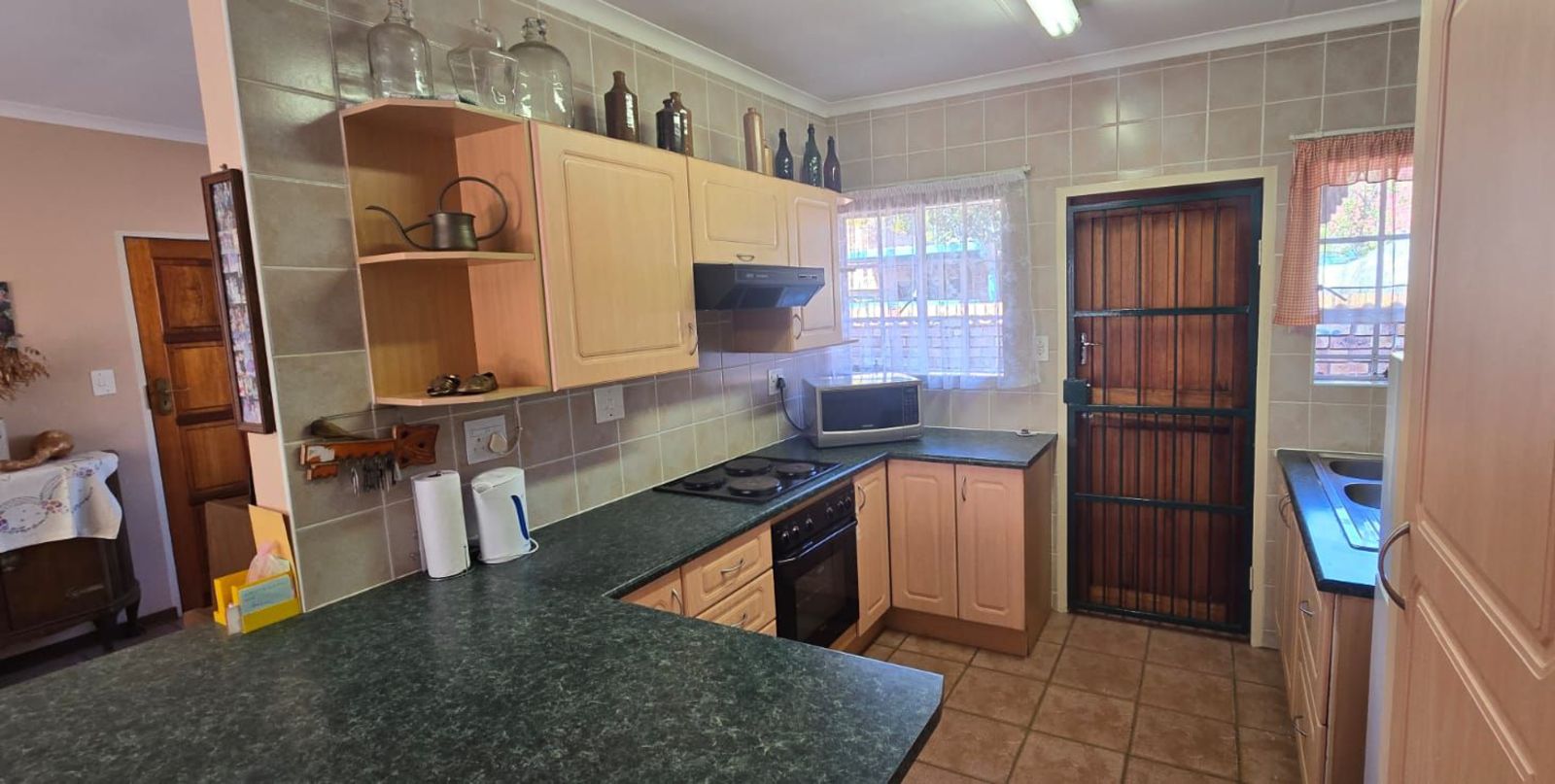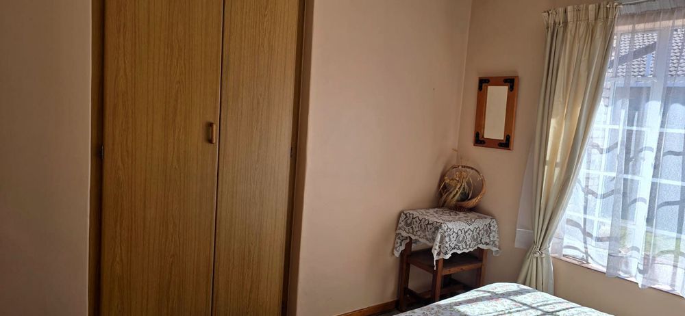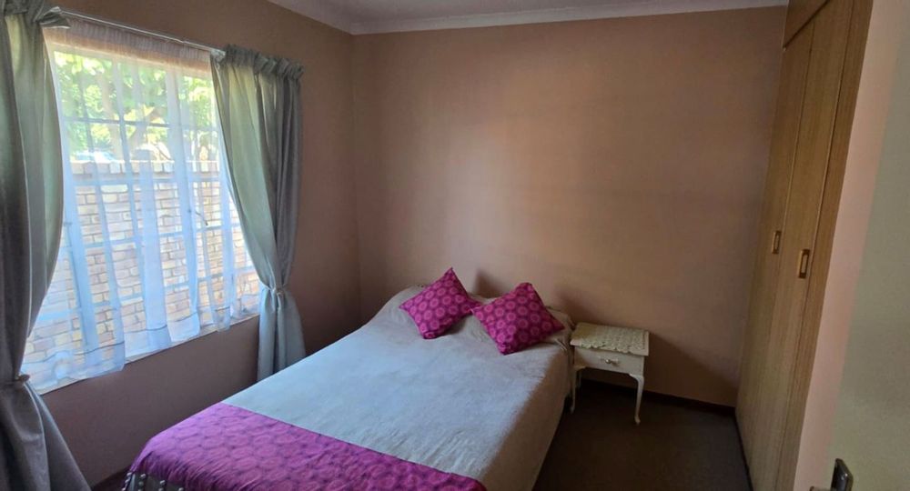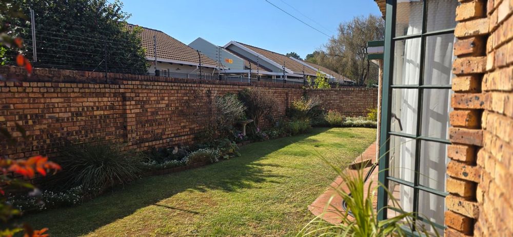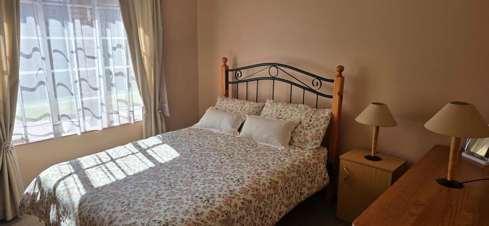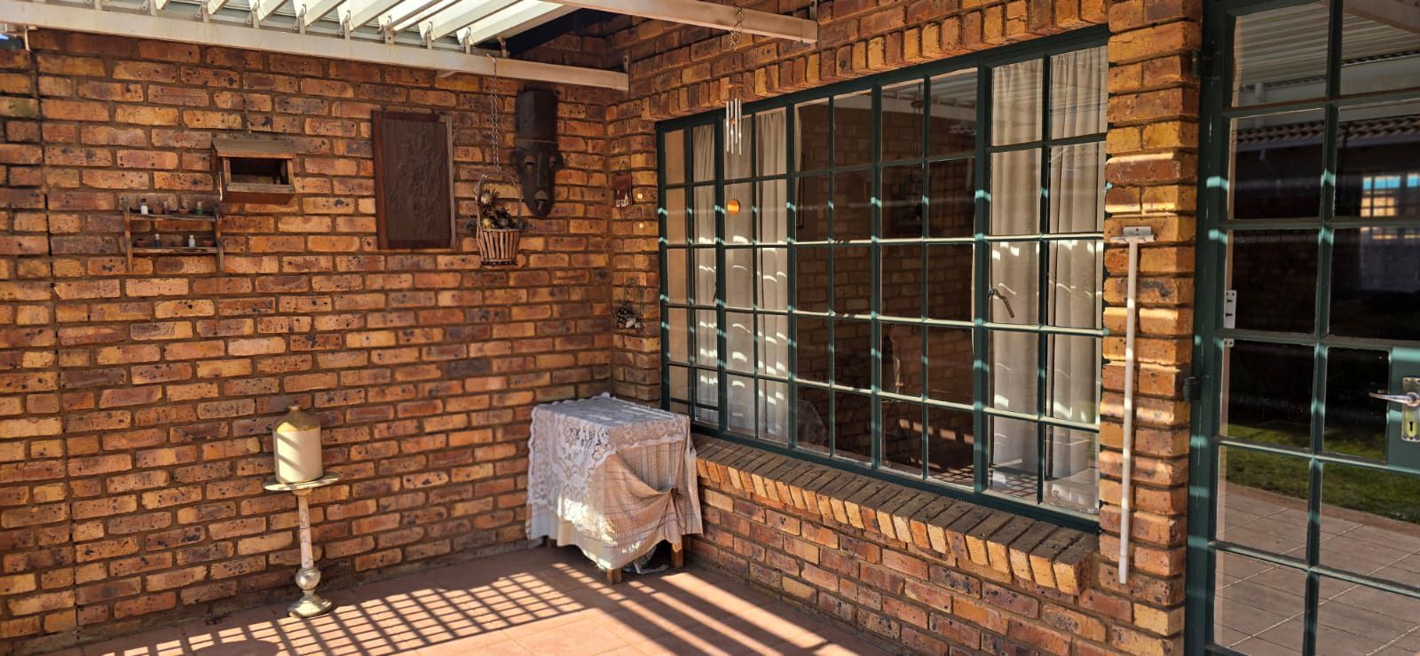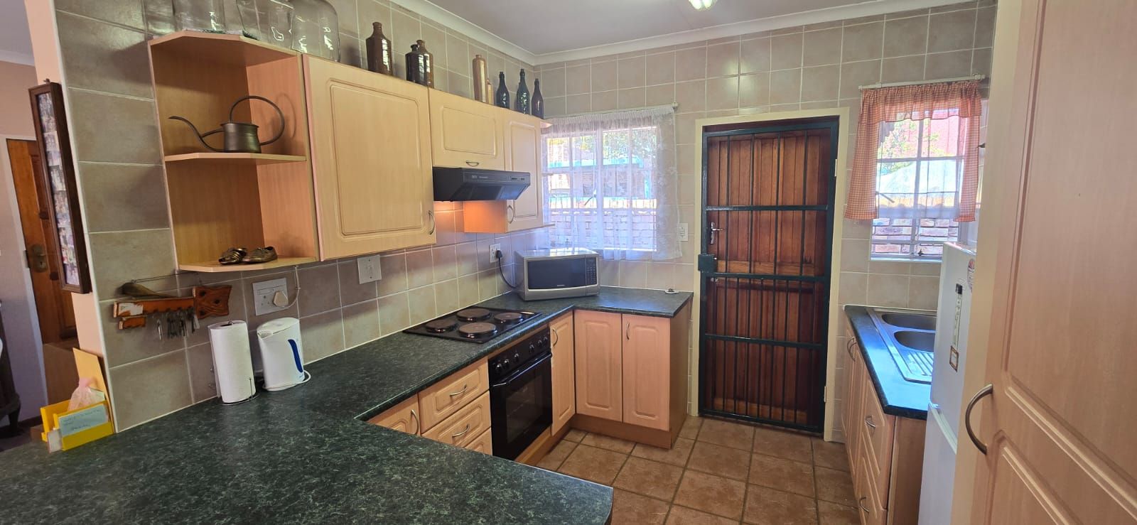This delightful home offers three comfortable bedrooms, each with carpeted flooring and built-in cupboards. The main bedroom boasts an en-suite bathroom, and there's a second full bathroom, both beautifully tiled to the roof with a basin, toilet, and bath. The French Cottage windows and doors open gracefully onto a veranda, secured discreetly with Trelidor gates and burglar bars that complement the home's aesthetic.