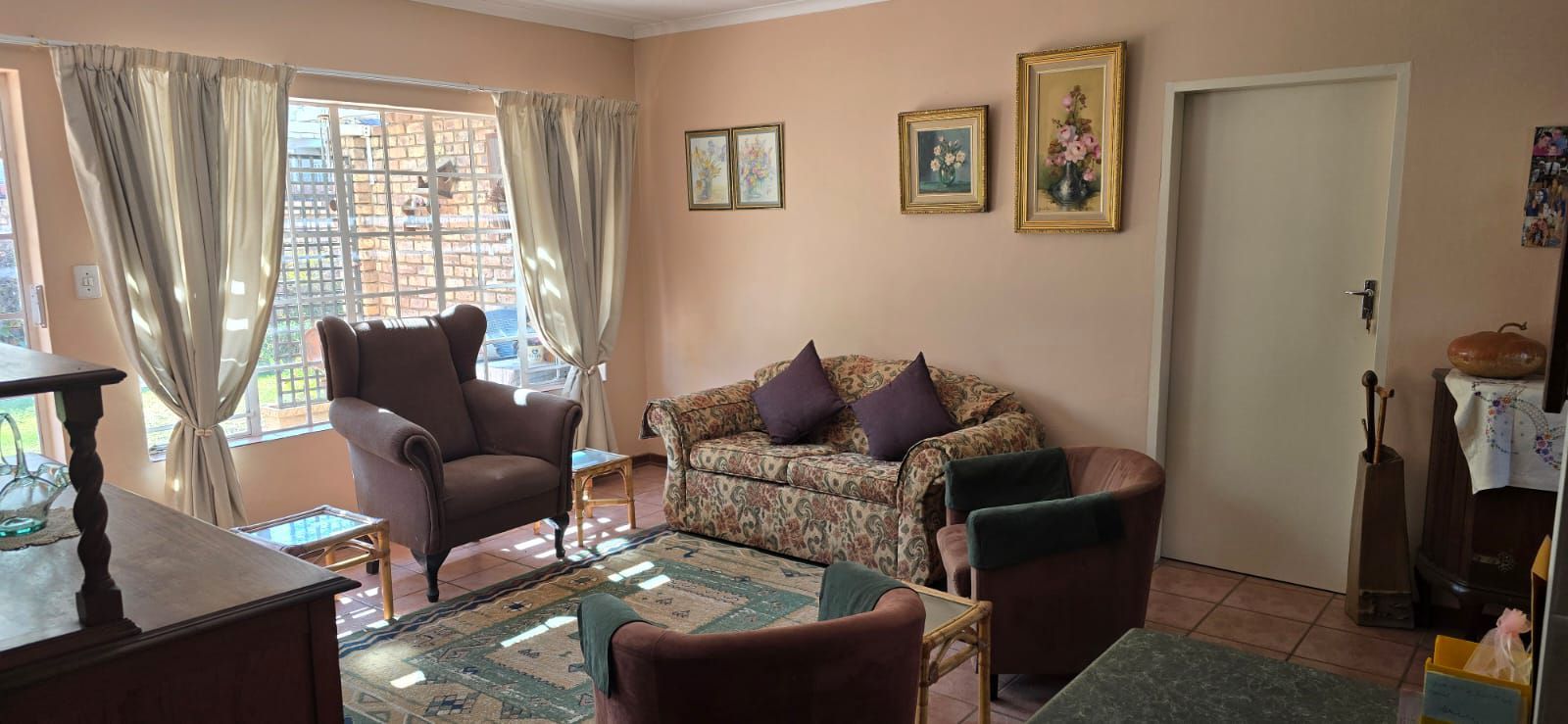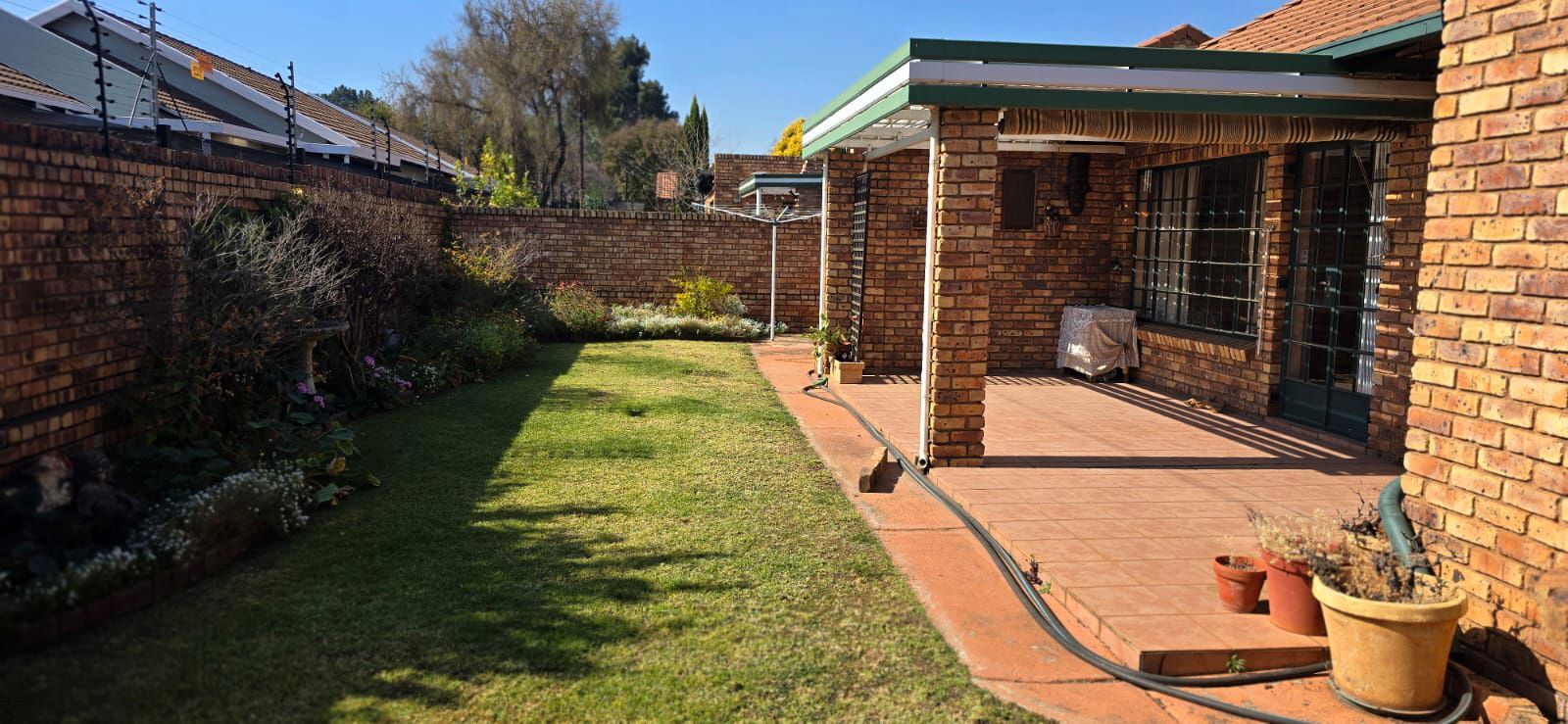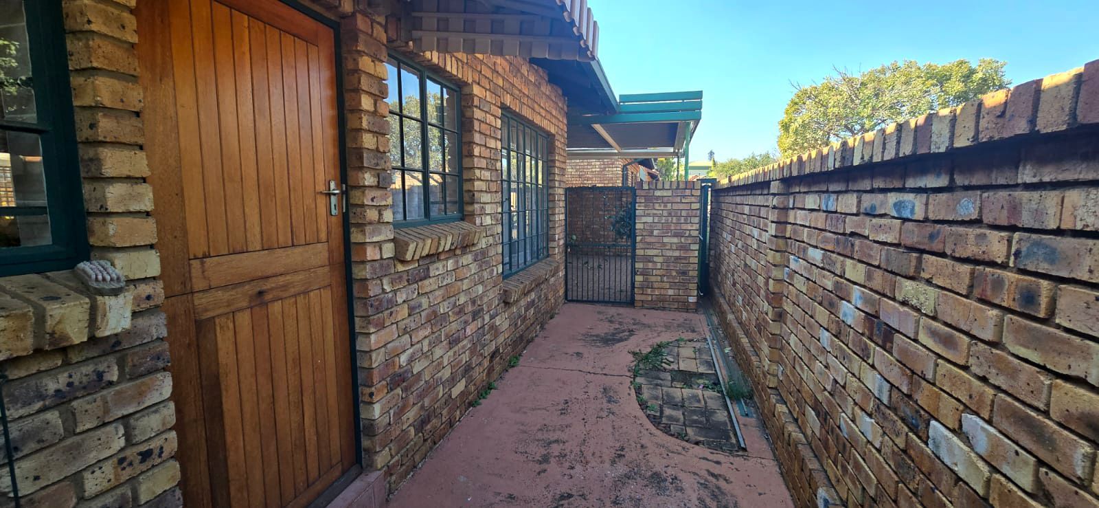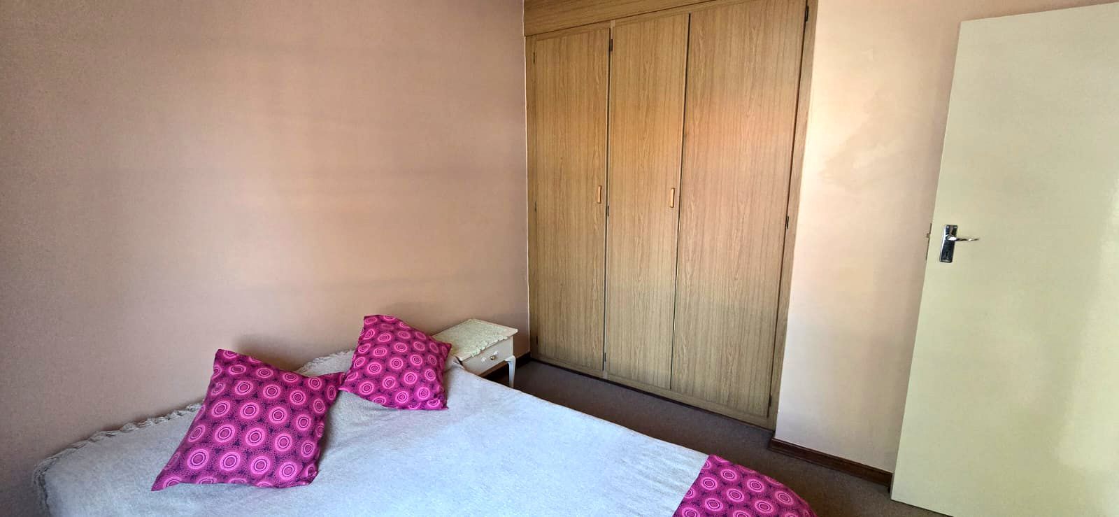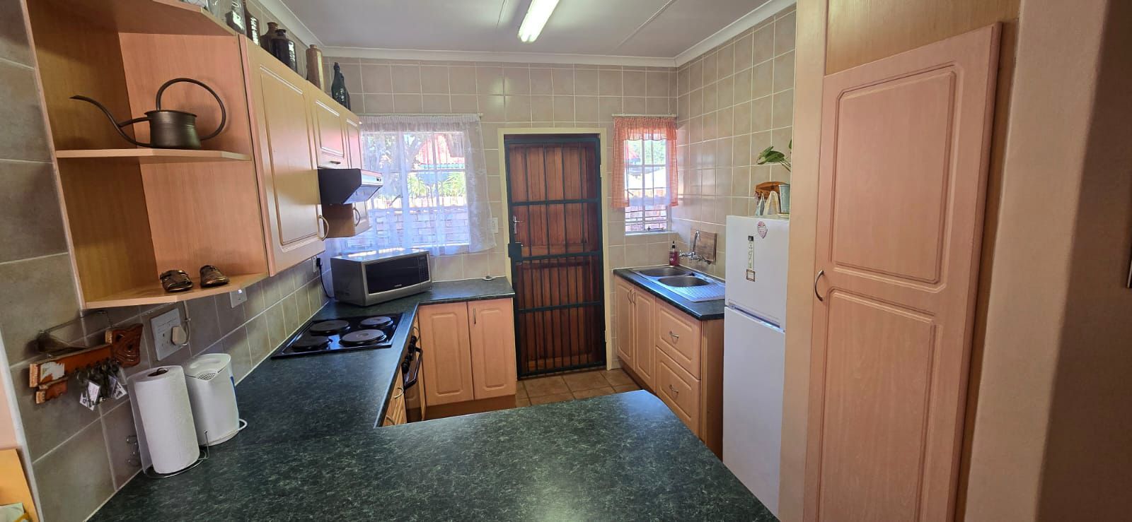 This delightful home offers three comfortable bedrooms, each with carpeted flooring and built-in cupboards. The main bedroom boasts an en-suite bathroom, and there's a second full bathroom, both beautifully tiled to the roof with a basin, toilet, and bath. The French Cottage windows and doors open gracefully onto a veranda, secured discreetly with Trelidor gates and burglar bars that complement the home's aesthetic.