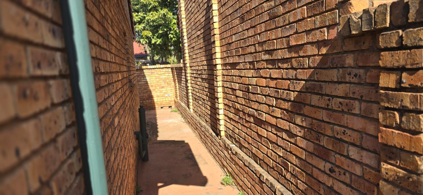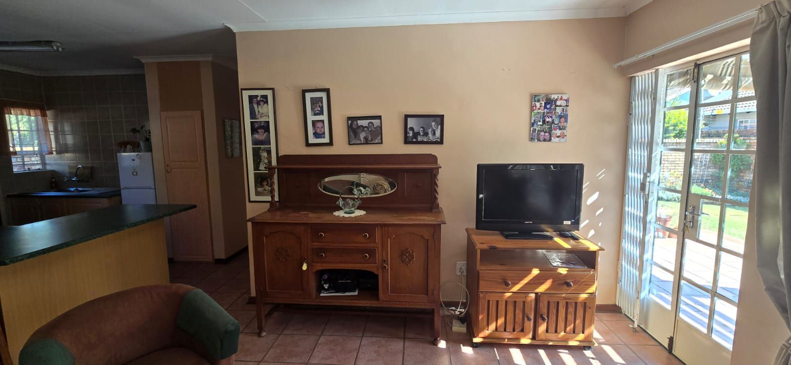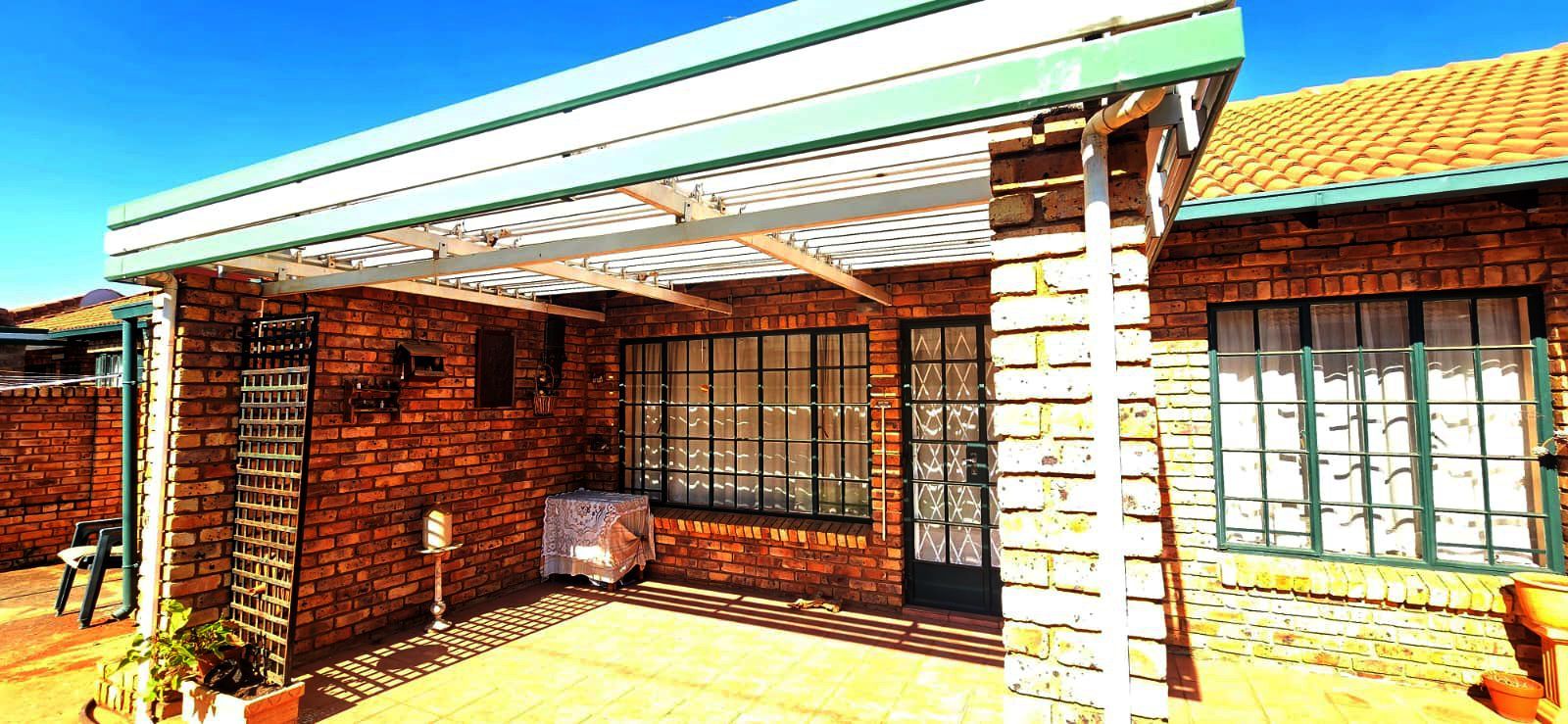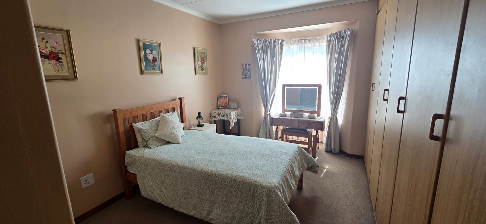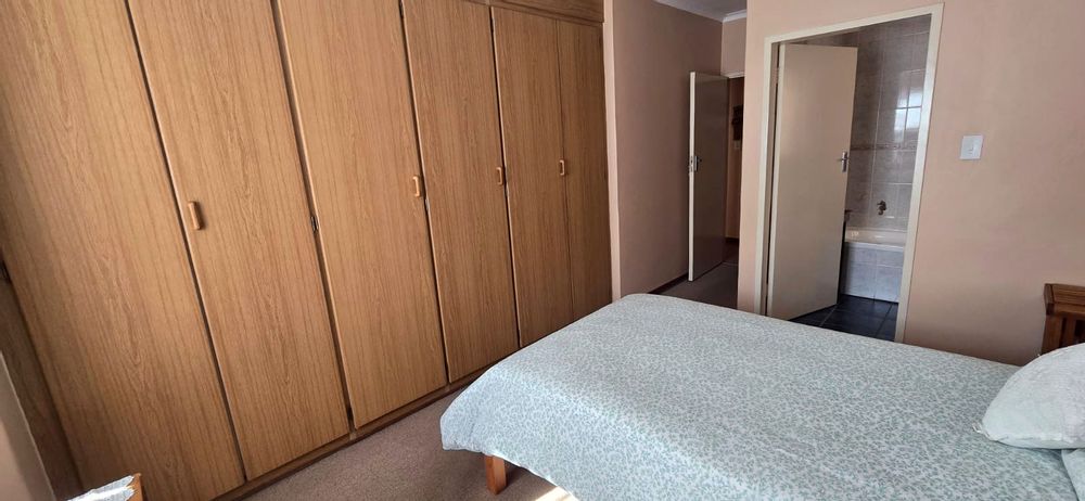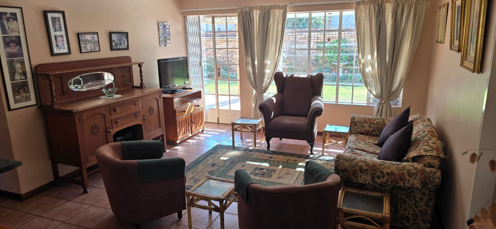 This delightful home offers three comfortable bedrooms, each with carpeted flooring and built-in cupboards. The main bedroom boasts an en-suite bathroom, and there's a second full bathroom, both beautifully tiled to the roof with a basin, toilet, and bath. The French Cottage windows and doors open gracefully onto a veranda, secured discreetly with Trelidor gates and burglar bars that complement the home's aesthetic.
