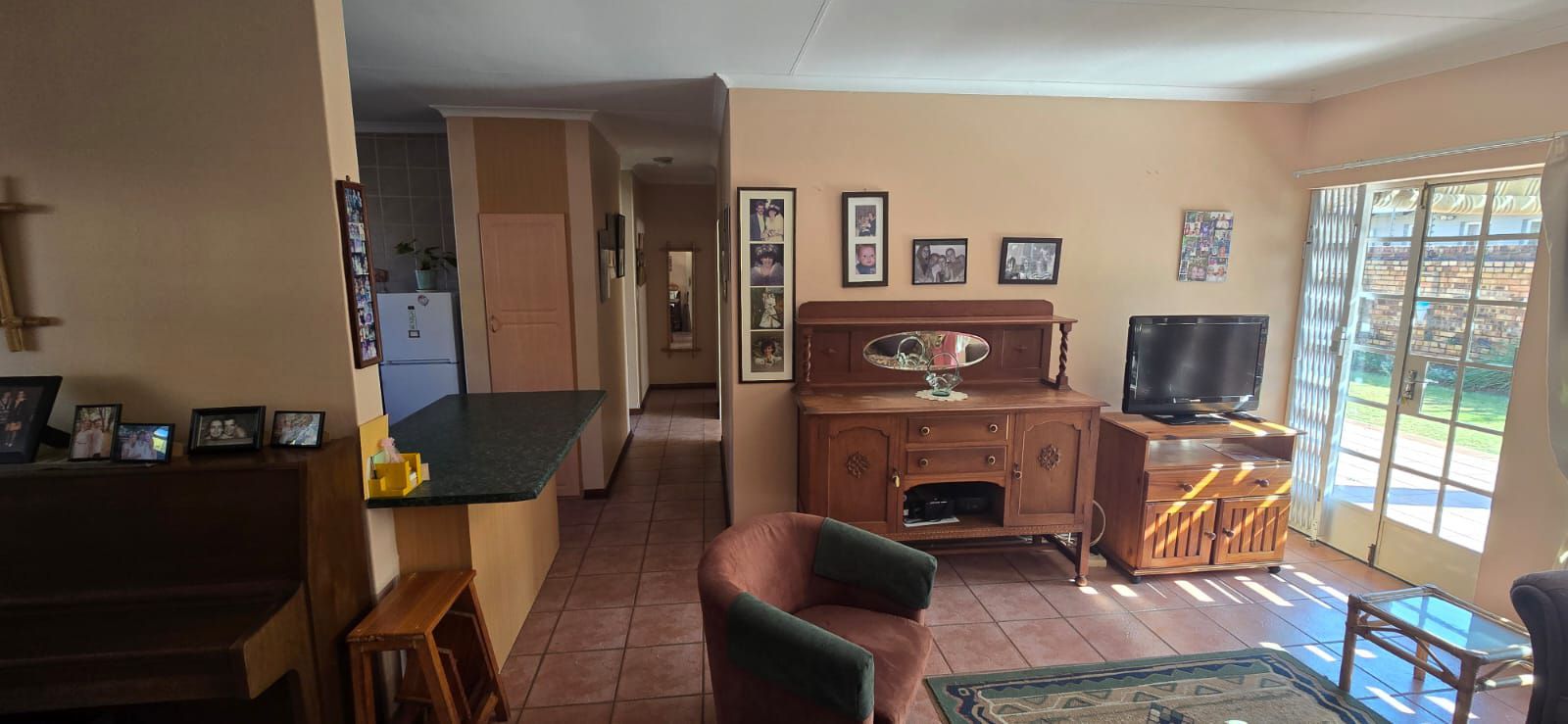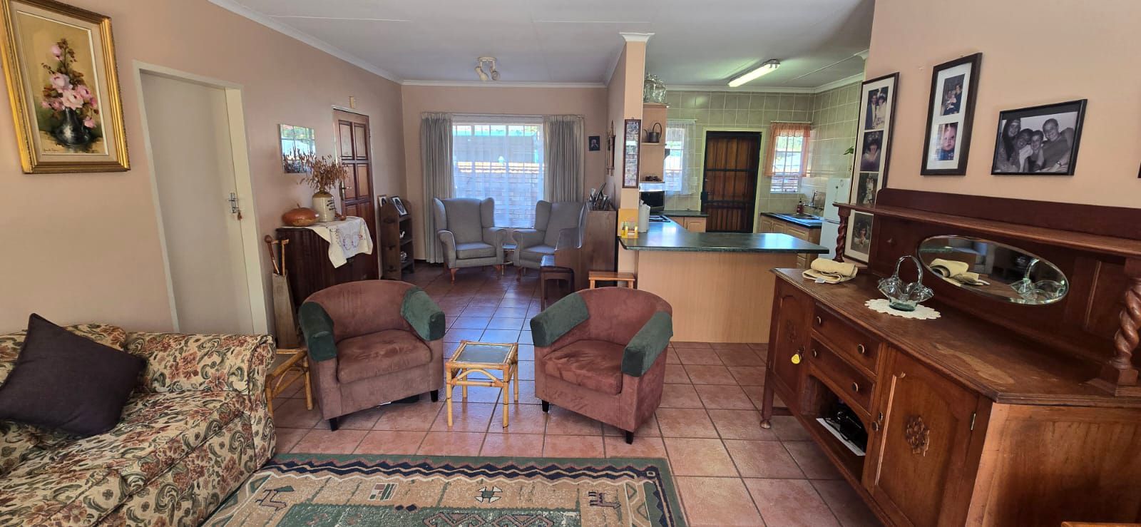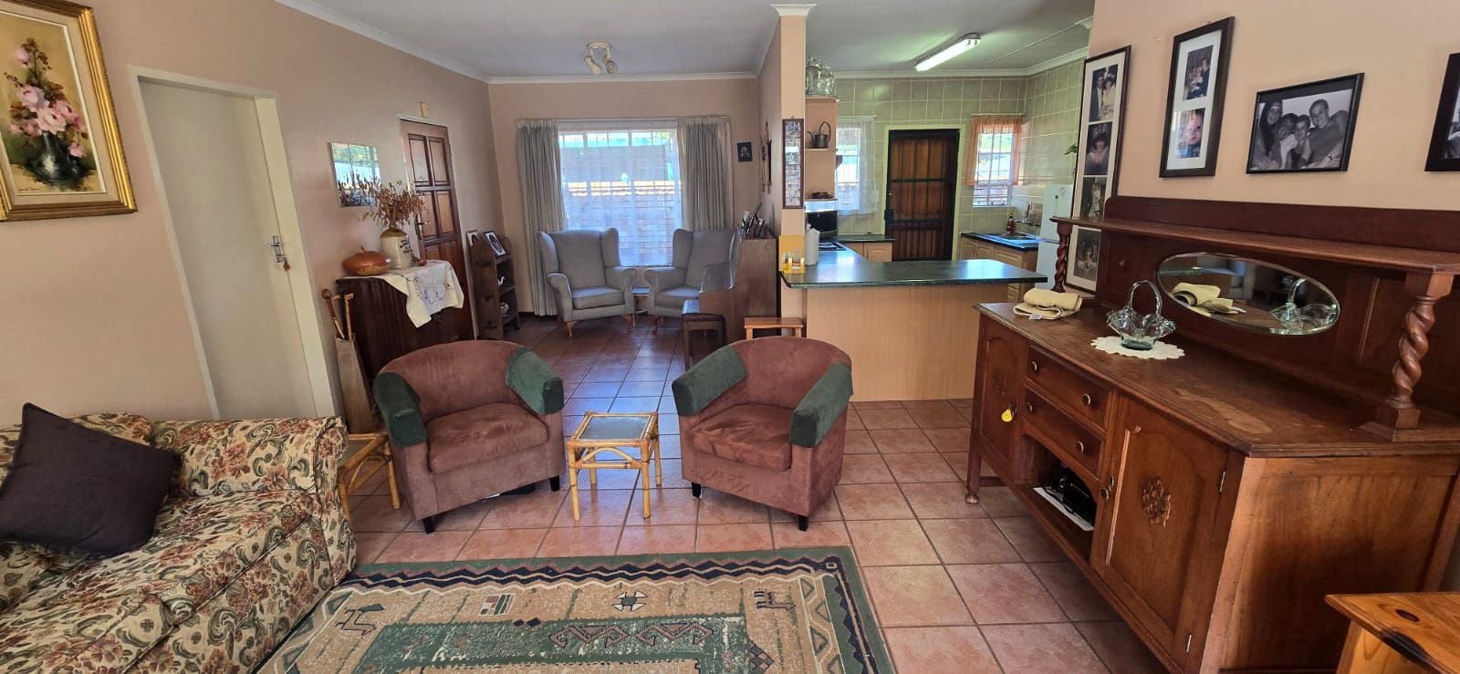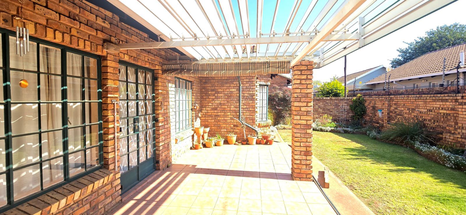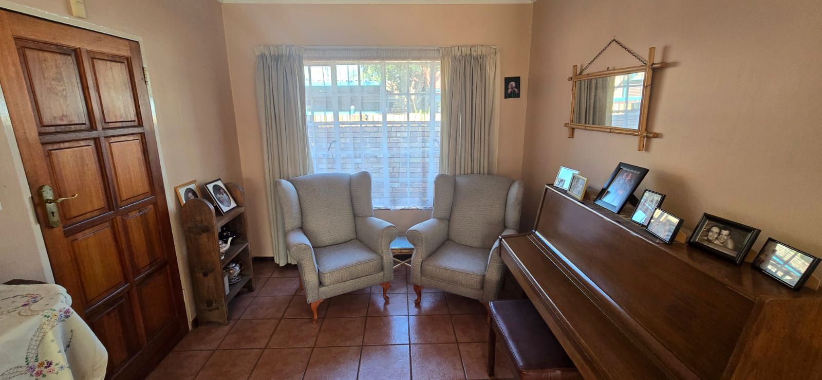 This delightful home offers three comfortable bedrooms, each with carpeted flooring and built-in cupboards. The main bedroom boasts an en-suite bathroom, and there's a second full bathroom, both beautifully tiled to the roof with a basin, toilet, and bath. The French Cottage windows and doors open gracefully onto a veranda, secured discreetly with Trelidor gates and burglar bars that complement the home's aesthetic.