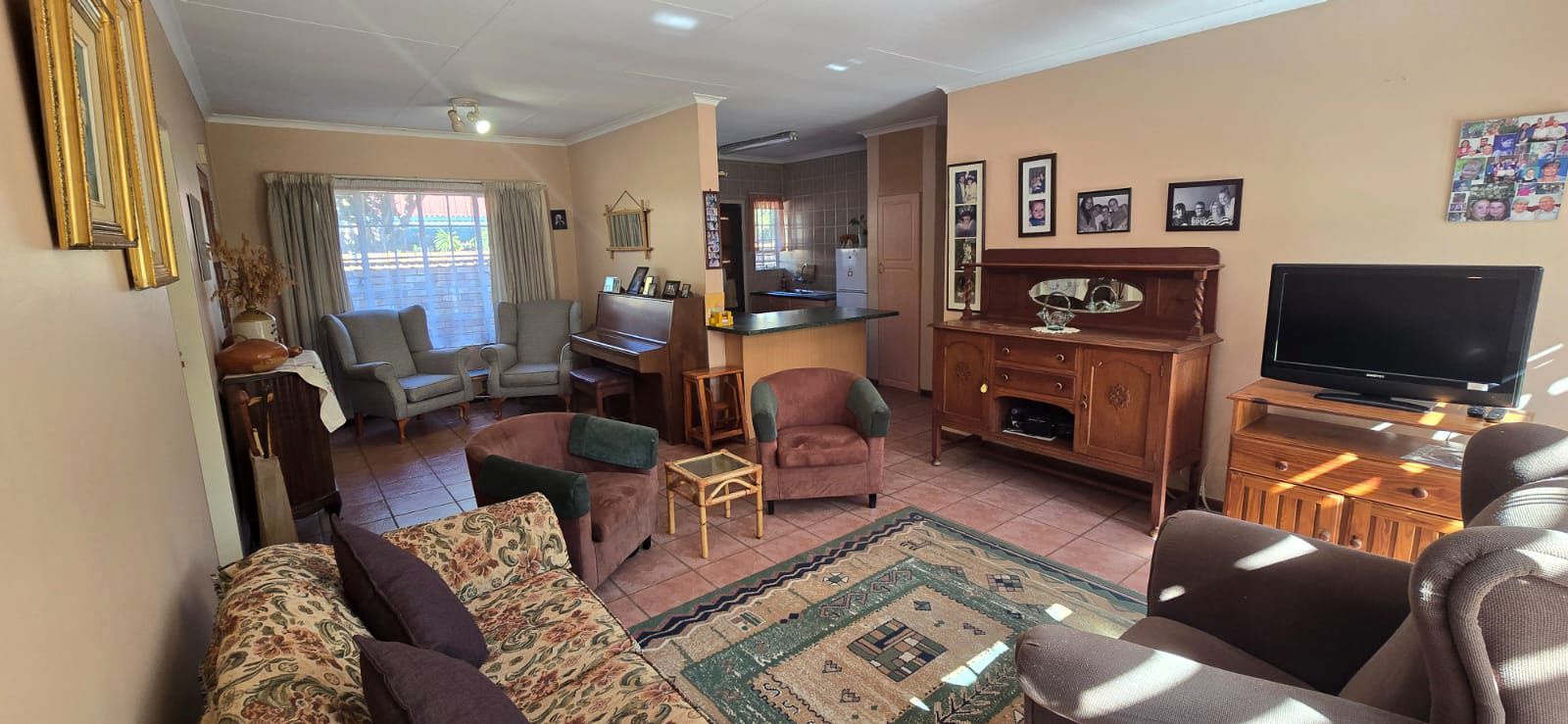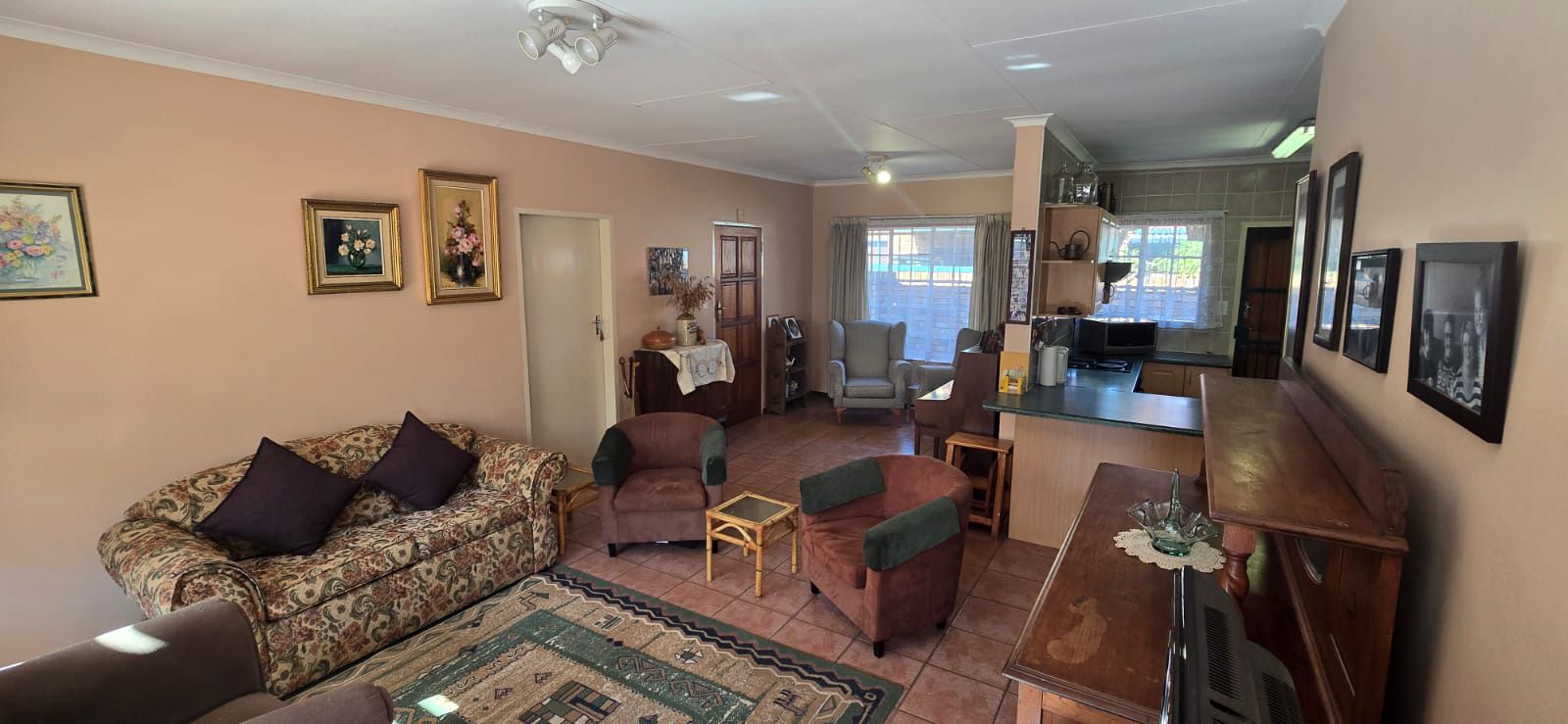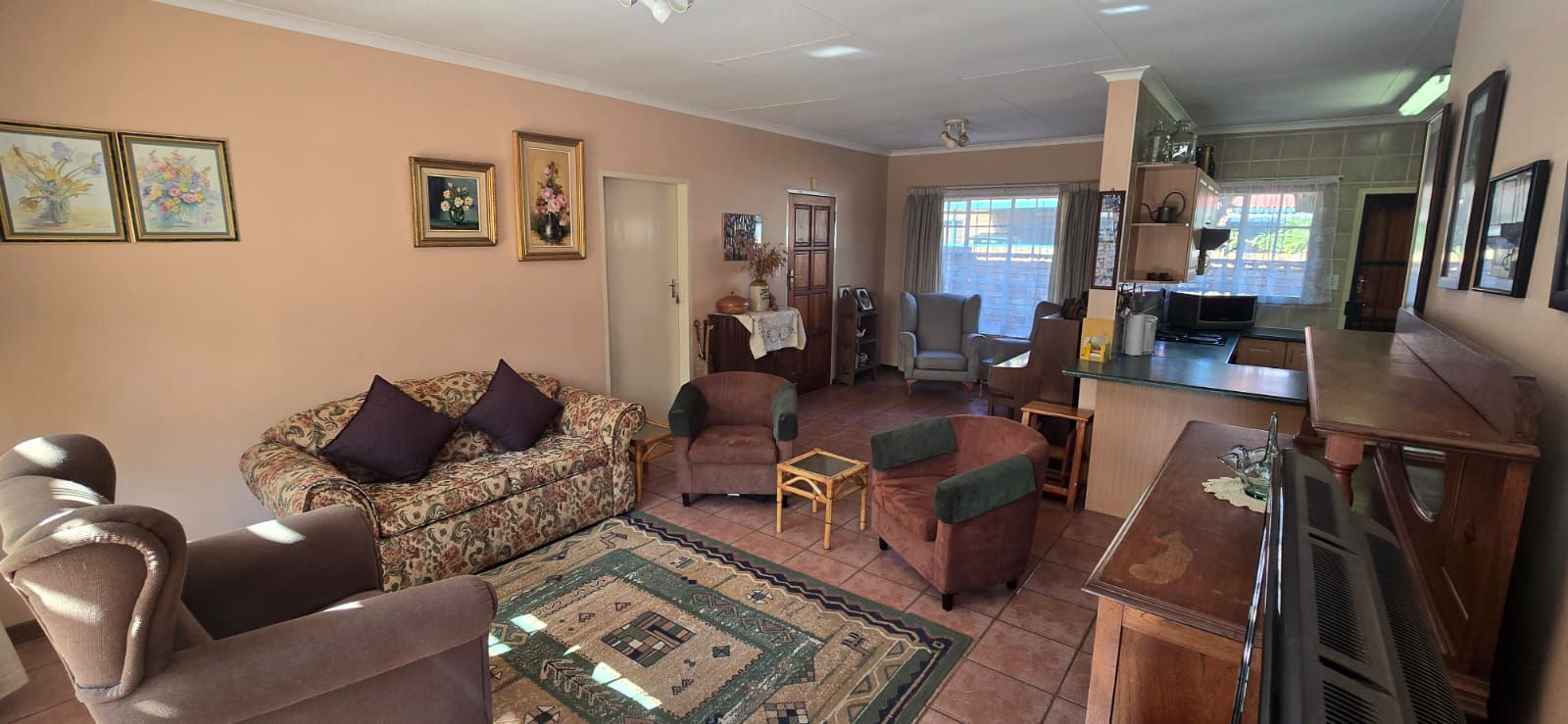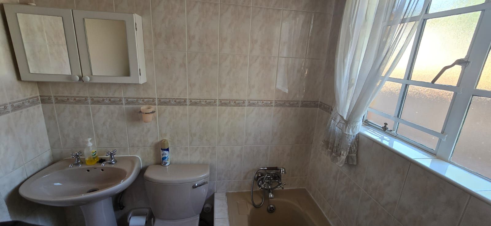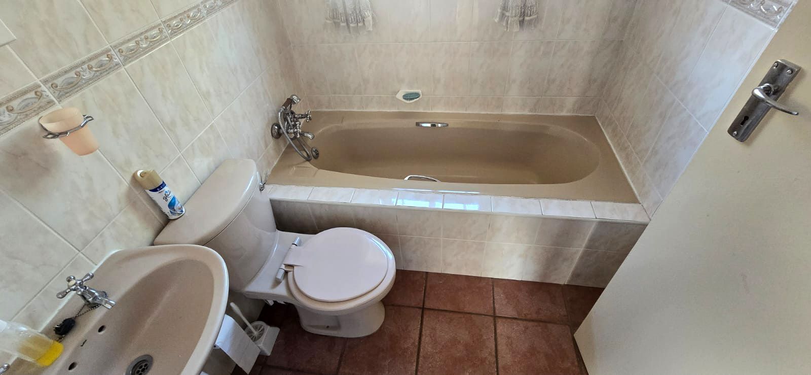 This delightful home offers three comfortable bedrooms, each with carpeted flooring and built-in cupboards. The main bedroom boasts an en-suite bathroom, and there's a second full bathroom, both beautifully tiled to the roof with a basin, toilet, and bath. The French Cottage windows and doors open gracefully onto a veranda, secured discreetly with Trelidor gates and burglar bars that complement the home's aesthetic.