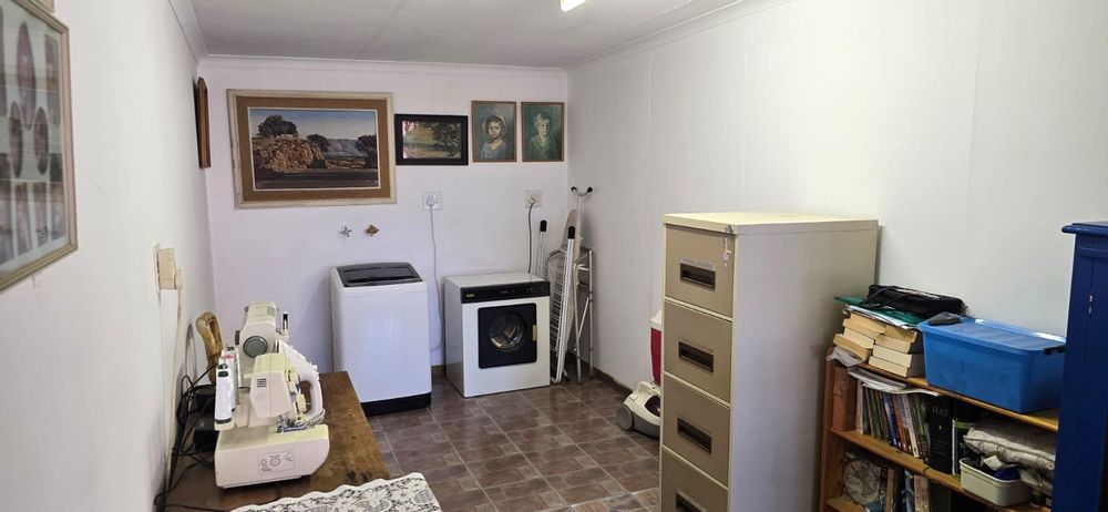 Outside, you'll find a well-established, rectangular garden, an outside toilet with a basin, and a single garage with a manual wooden sliding door, plus a convenient carport. A dedicated washing and ironing room with water outlets and vinyl flooring adds to the practicality of this charming property.