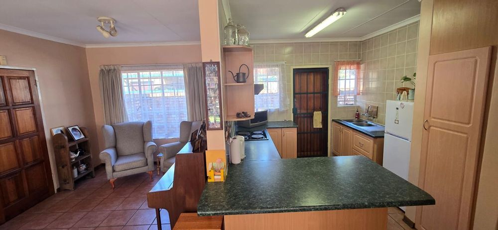 Discover the charm of this French Cottage-style home, featuring classic face brick walls and distinctive green steel window frames. Step inside to an inviting open-plan dining room, lounge, and kitchen, all laid with wall-to-wall tiles for easy living.
