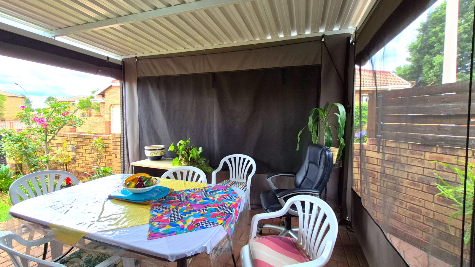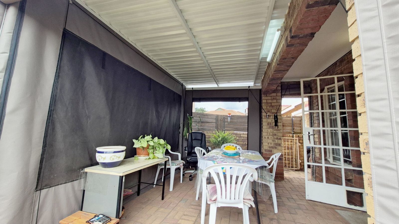 A new patio roof deck with outdoor blinds overlooks a private garden, ideal for relaxed outdoor entertaining.