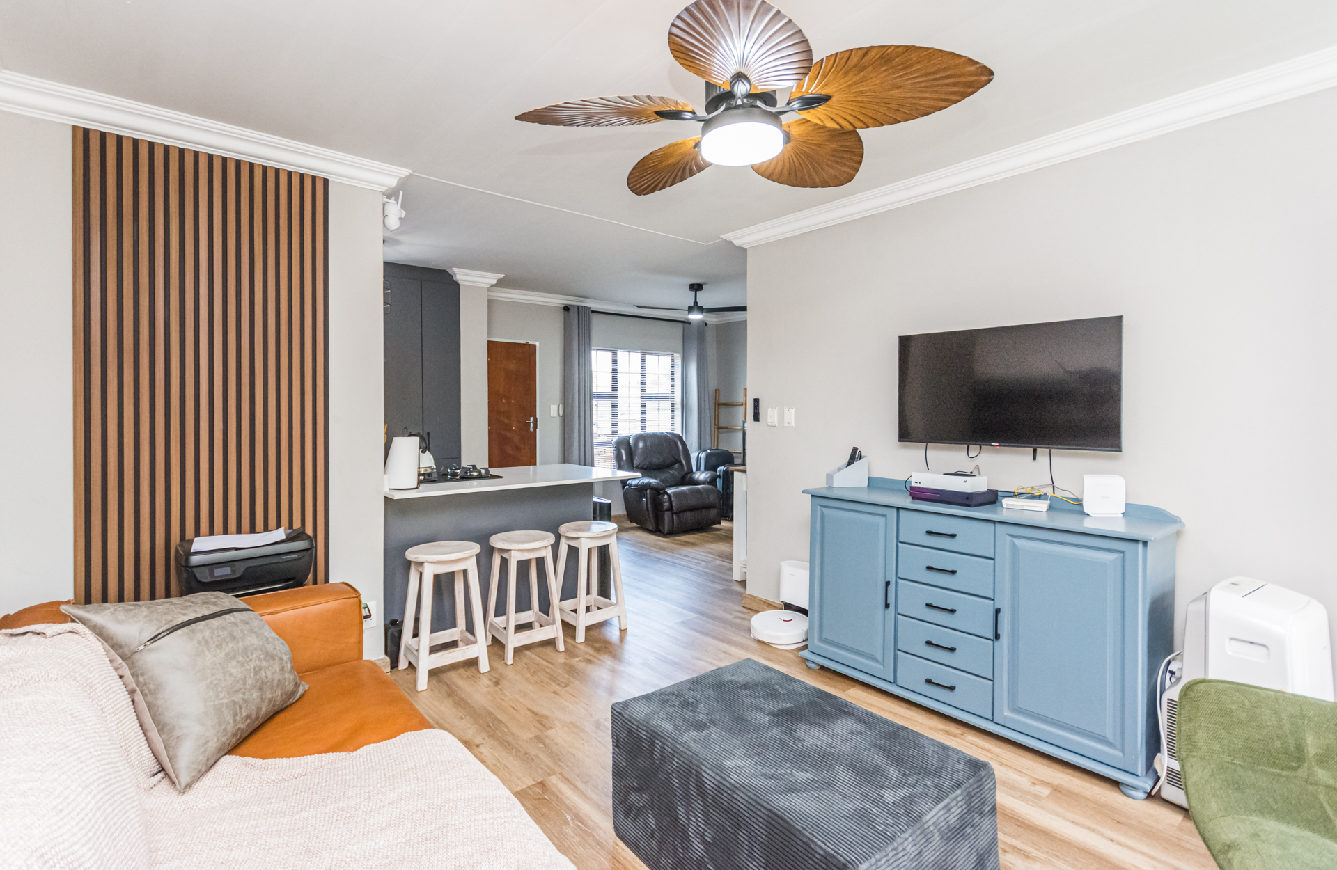 Upon entry, you are welcomed into a spacious open-plan lounge, dining, and kitchen area. These modern living spaces are fitted with ceiling fans, stylish laminate flooring, aluminium windows with fitted blinds, and attractive ambient kitchen lighting that enhances the contemporary feel. The well-designed kitchen boasts modern cabinetry, a breakfast nook, quartz countertops, a gas hob, and space for a dishwasher, while the laundry area is conveniently located elsewhere.