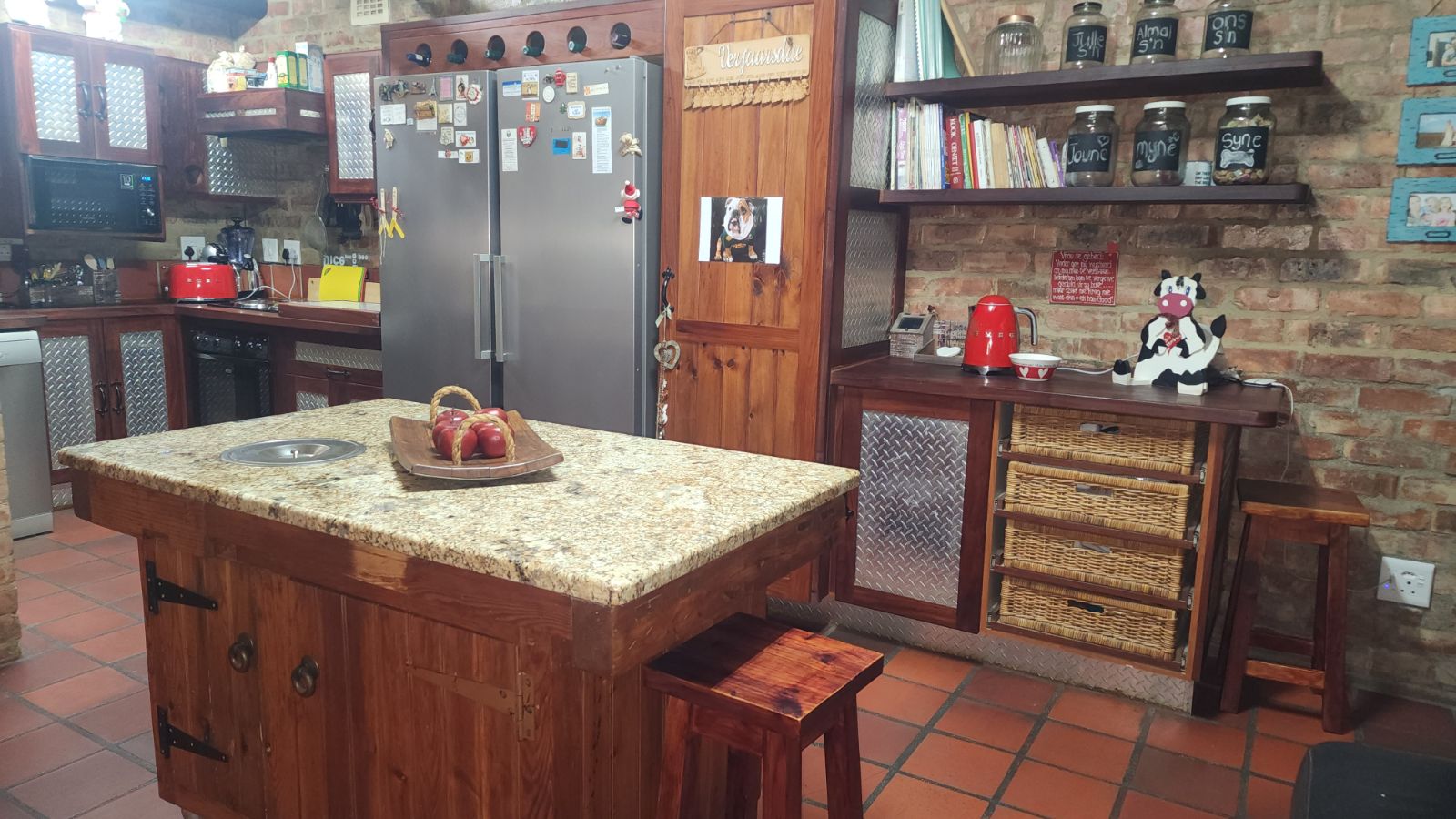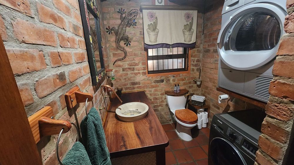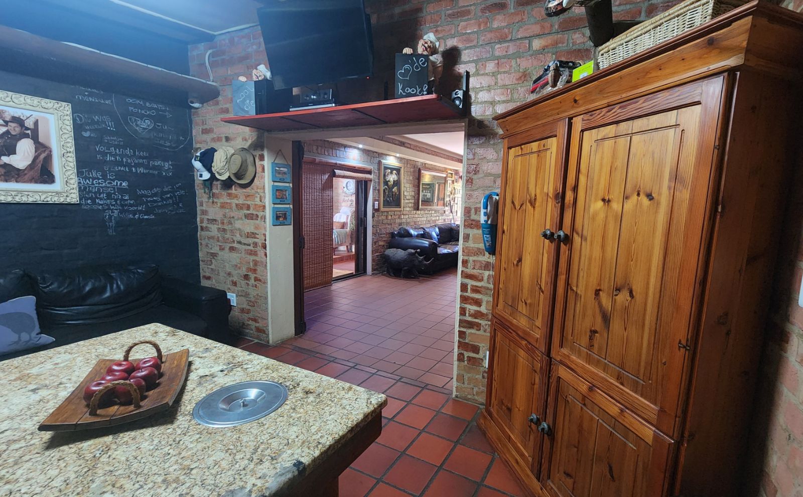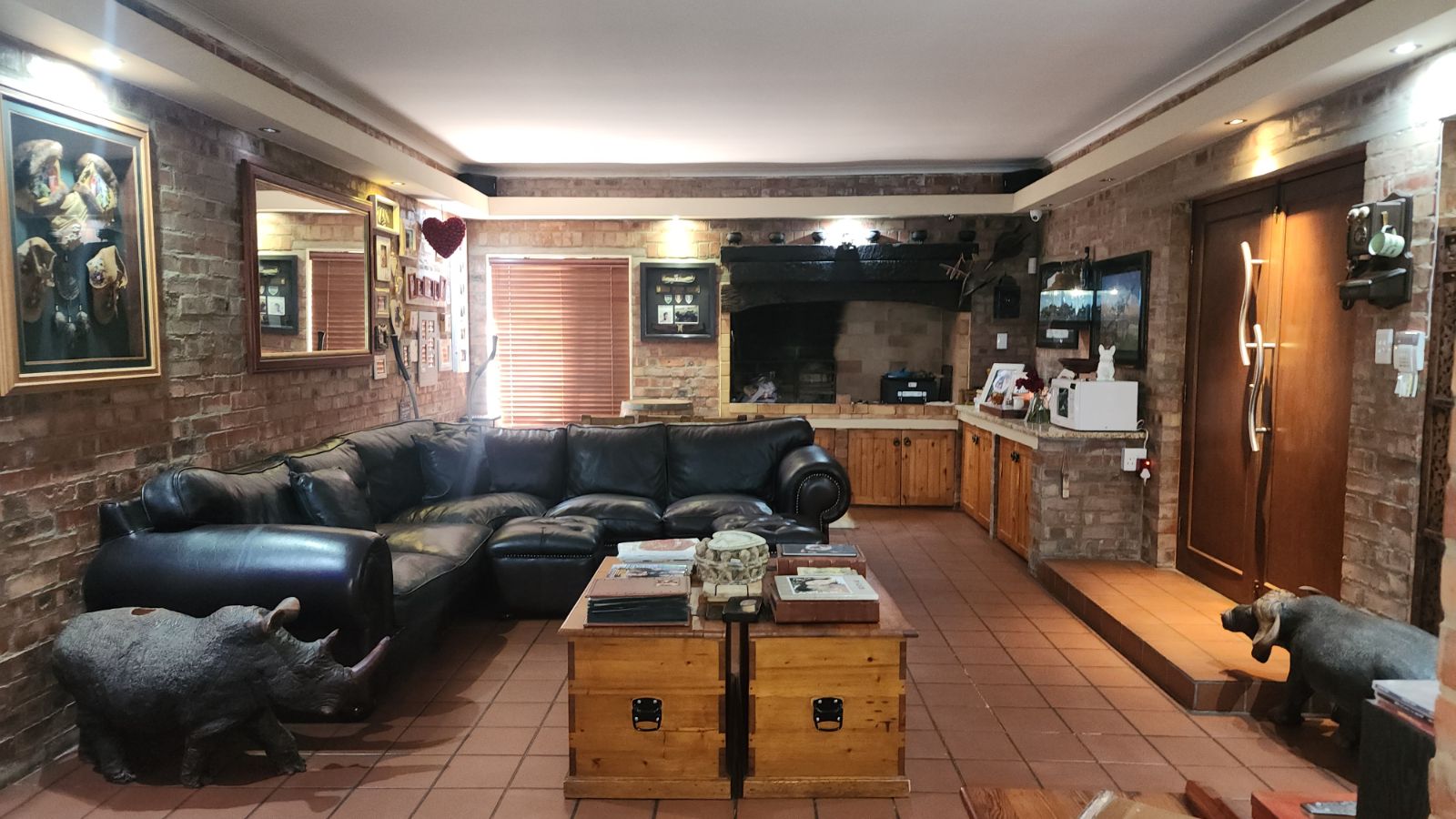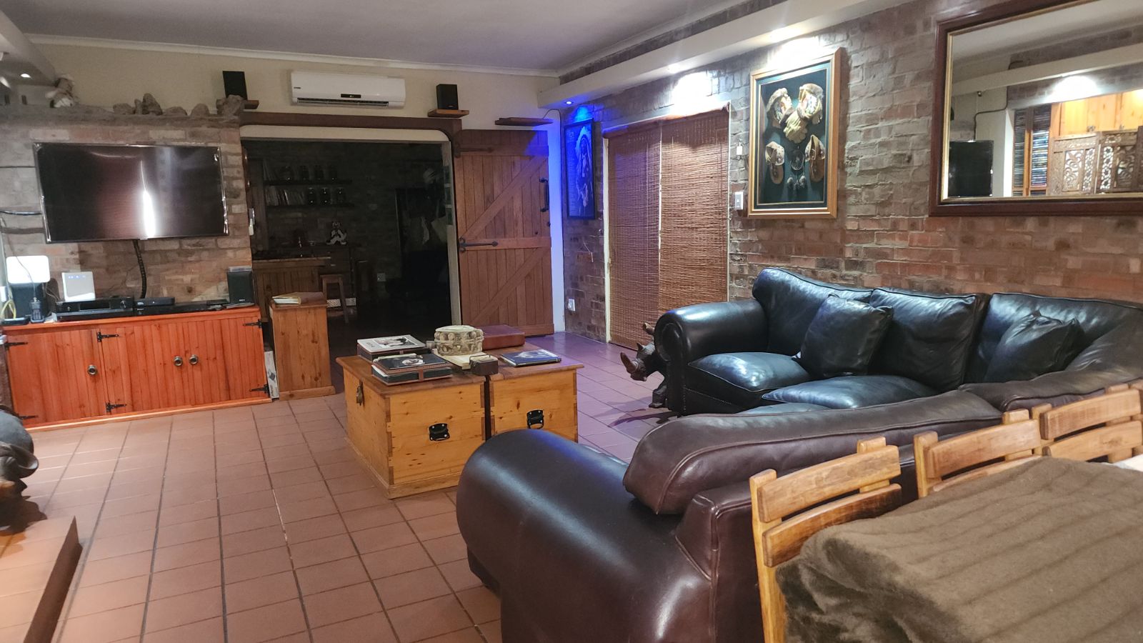 Inside, the home features a large open-plan lounge and braai room that flows naturally into the kitchen and dining area, creating a warm and spacious living environment. A small home office, bar corner and clever layout add even more character.