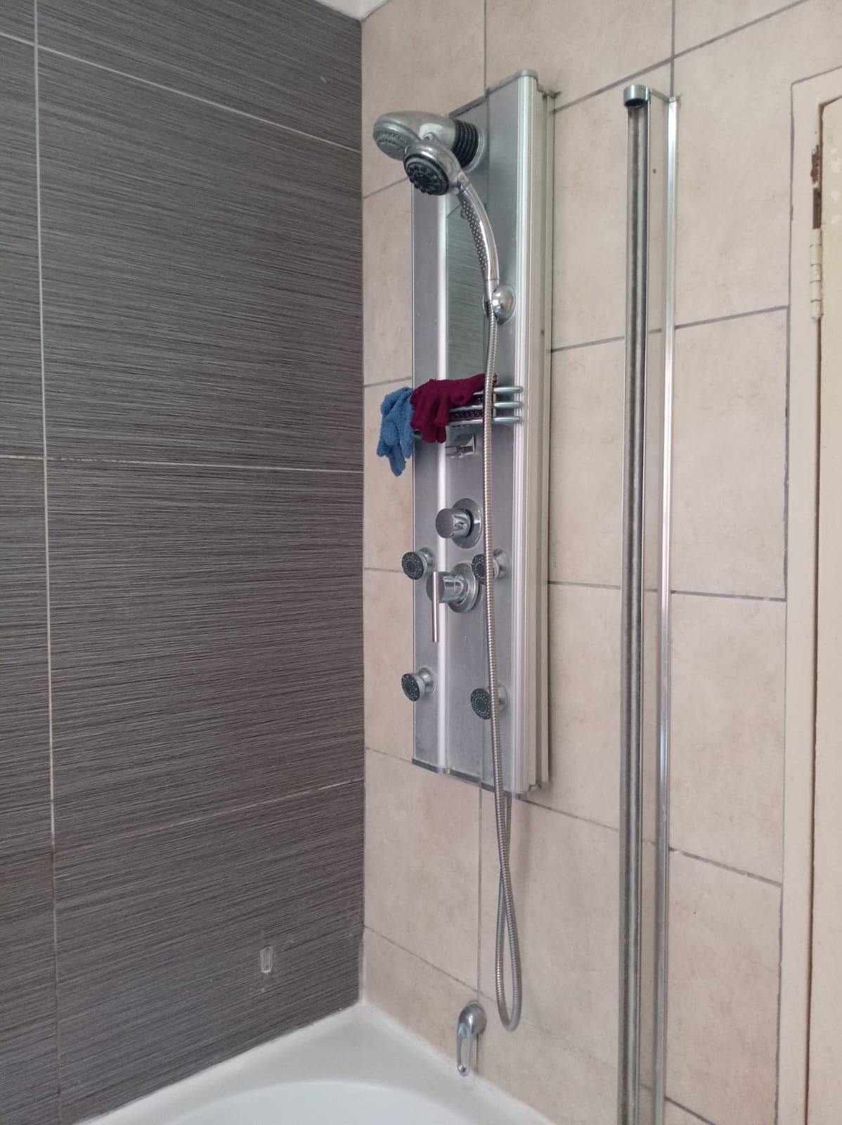 The modern bathroom features a hand shower and stylish vanity, complemented by a separate toilet for added convenience. The kitchen is every woman’s dream – fully tiled from floor to ceiling, offering ample packing space, an under-counter oven, and a glass-top stove.