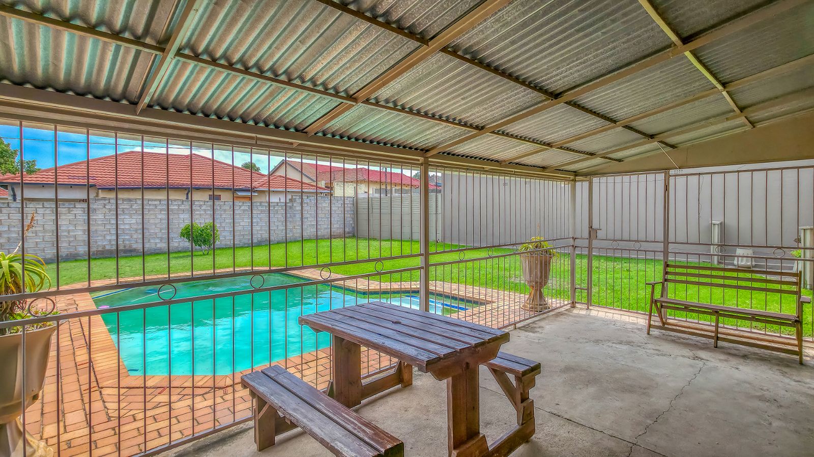 Step out the back door to a covered and enclosed patio, perfect for secure outdoor dining. The back garden is a haven during summer, featuring a sparkling swimming pool for endless enjoyment.