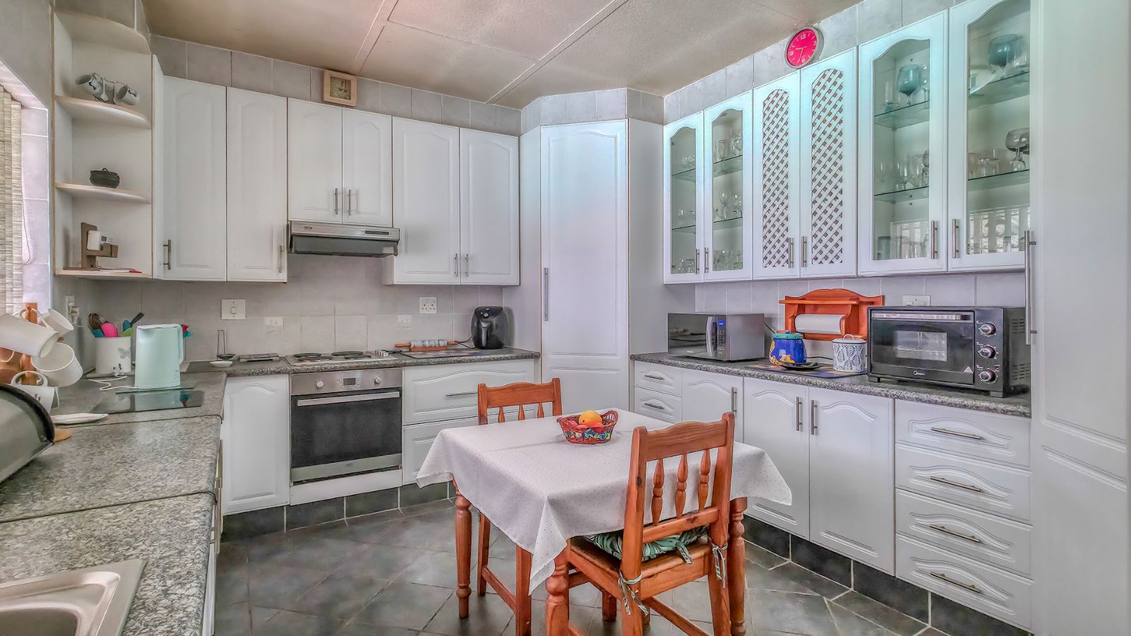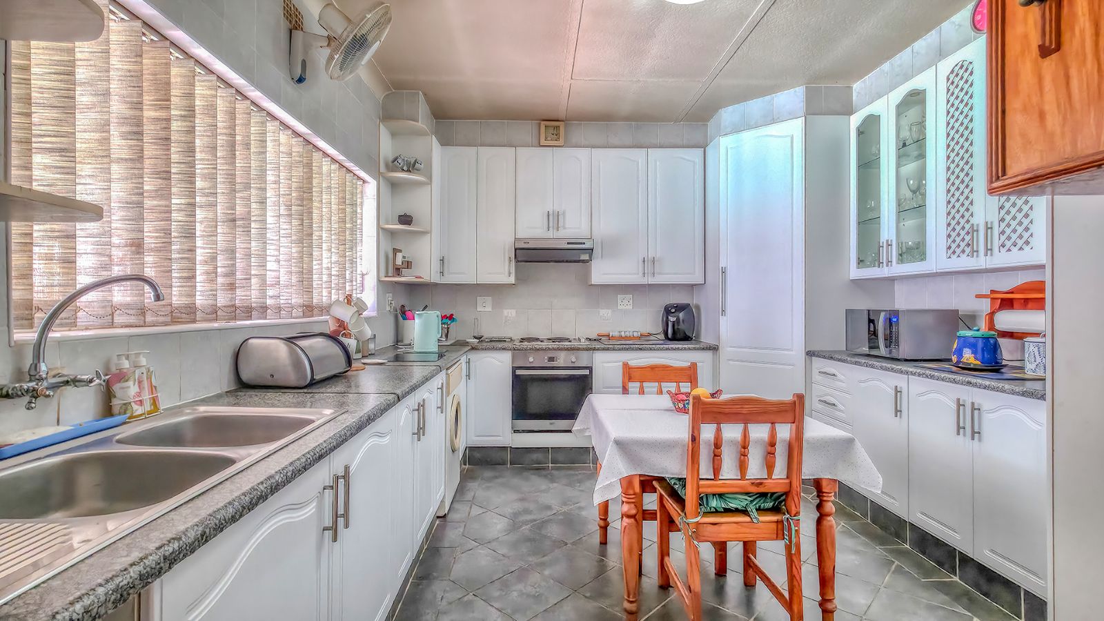 The spacious kitchen is a highlight, featuring ample built-in cupboards (including two excellent corner pantries for groceries), a hob, an undercounter oven, an extractor fan and a double sink.