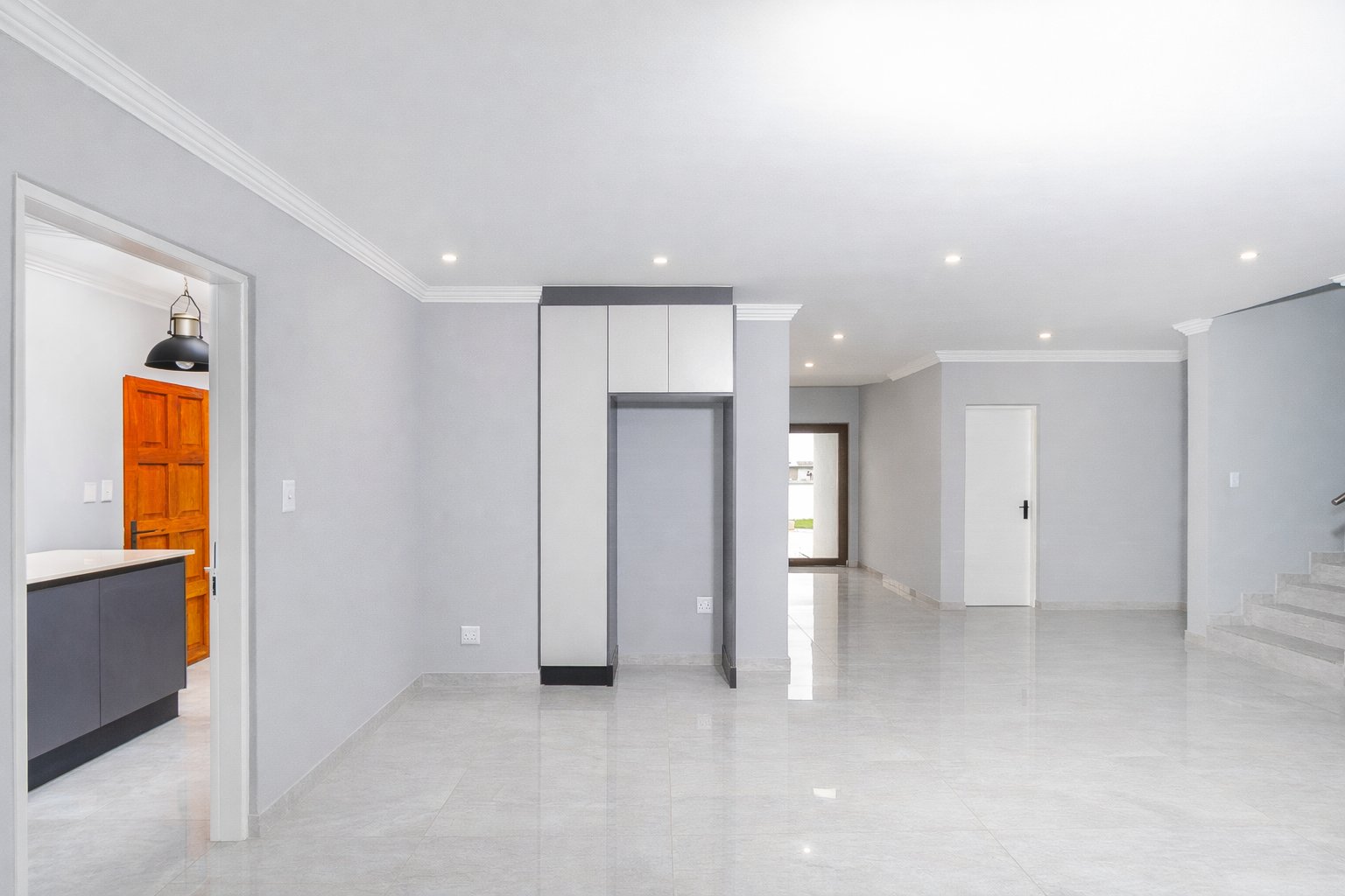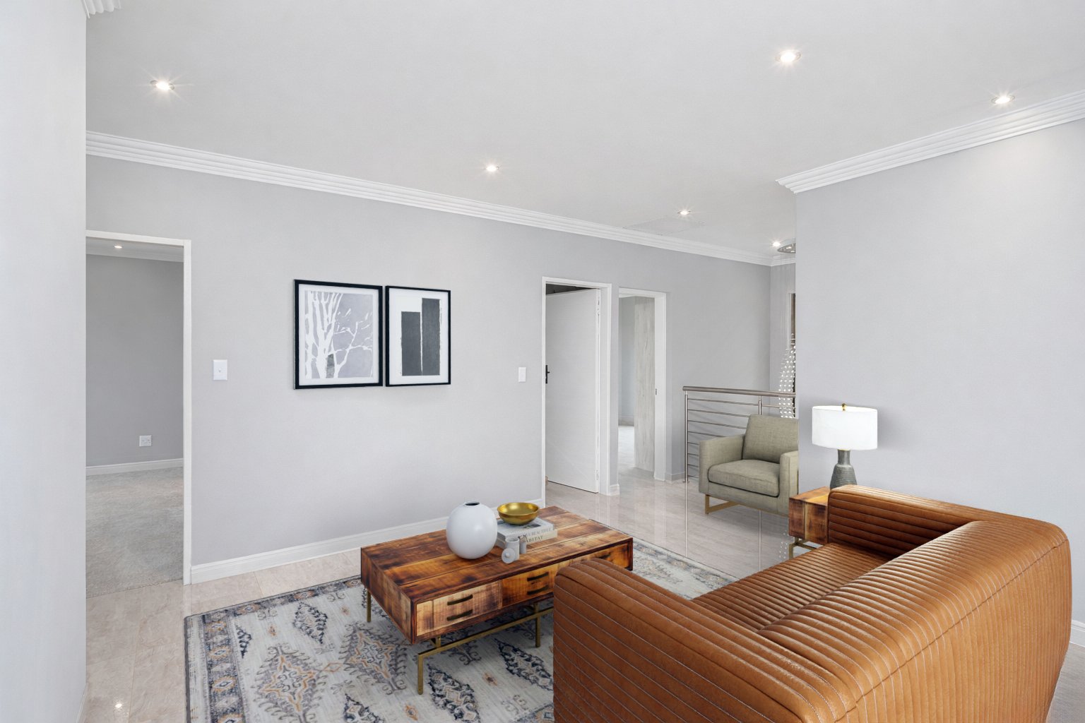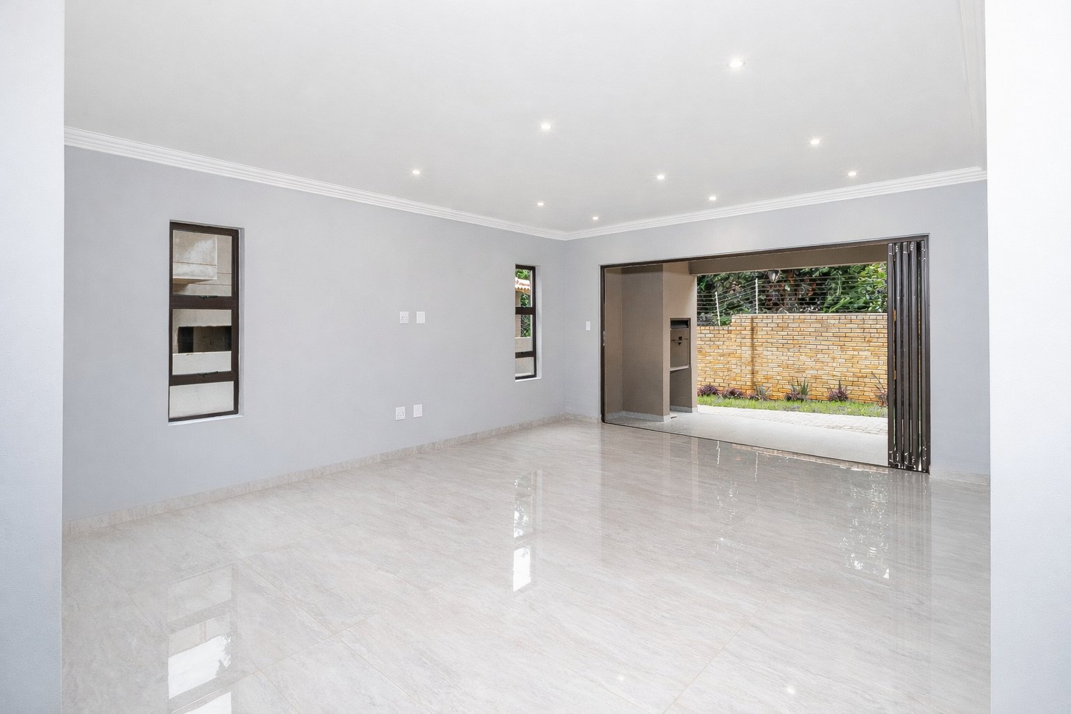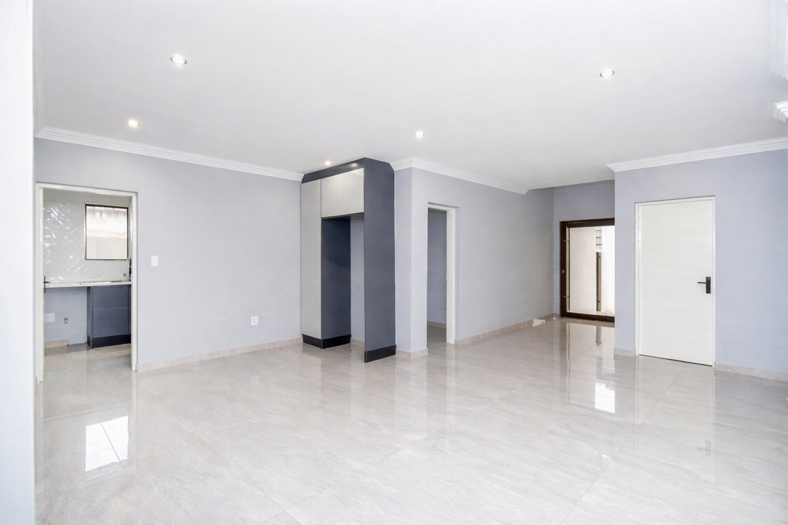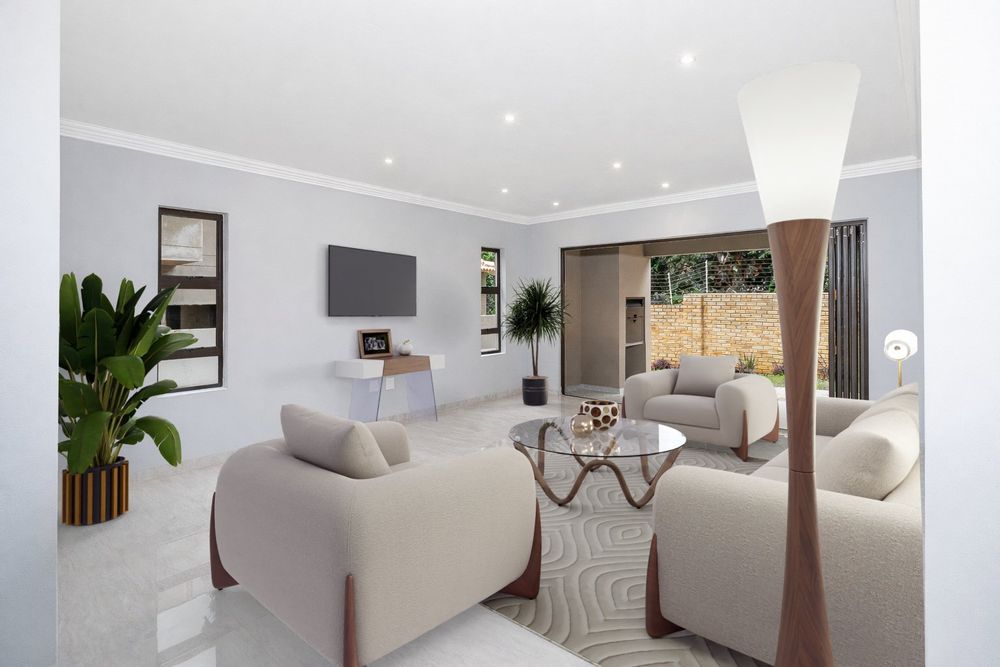 This newly built, digitally staged modern home in the sought-after Ruimsig Country Estate offers refined living with generous proportions and elegant finishes throughout. A welcoming entrance hall leads into an open-plan living space featuring seamless, high-gloss tiling that flows consistently through the home.