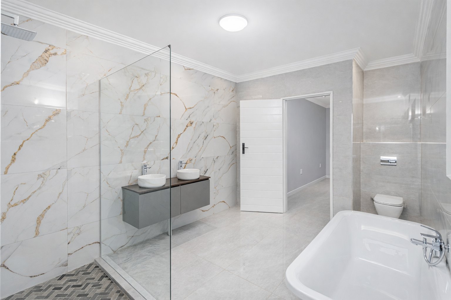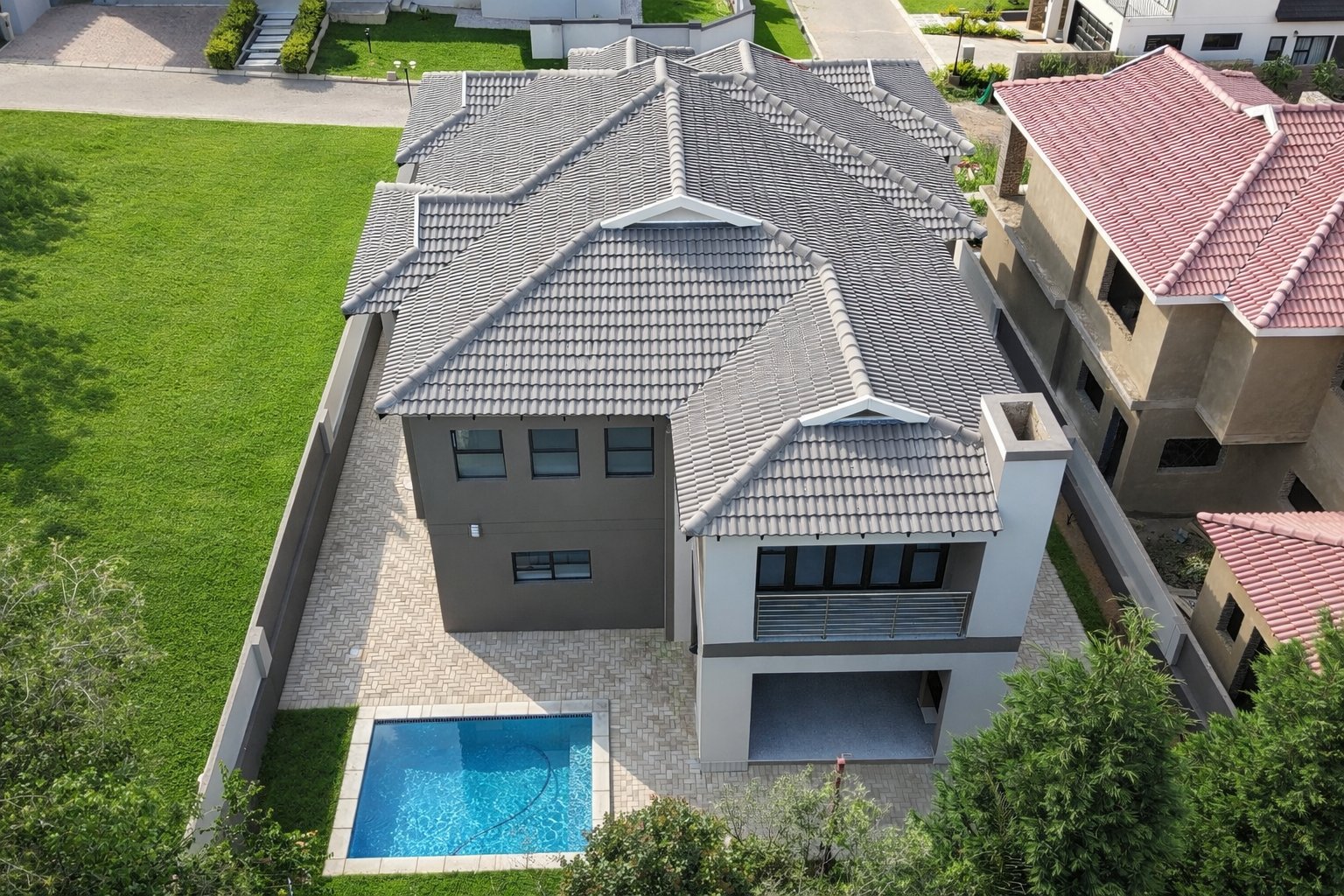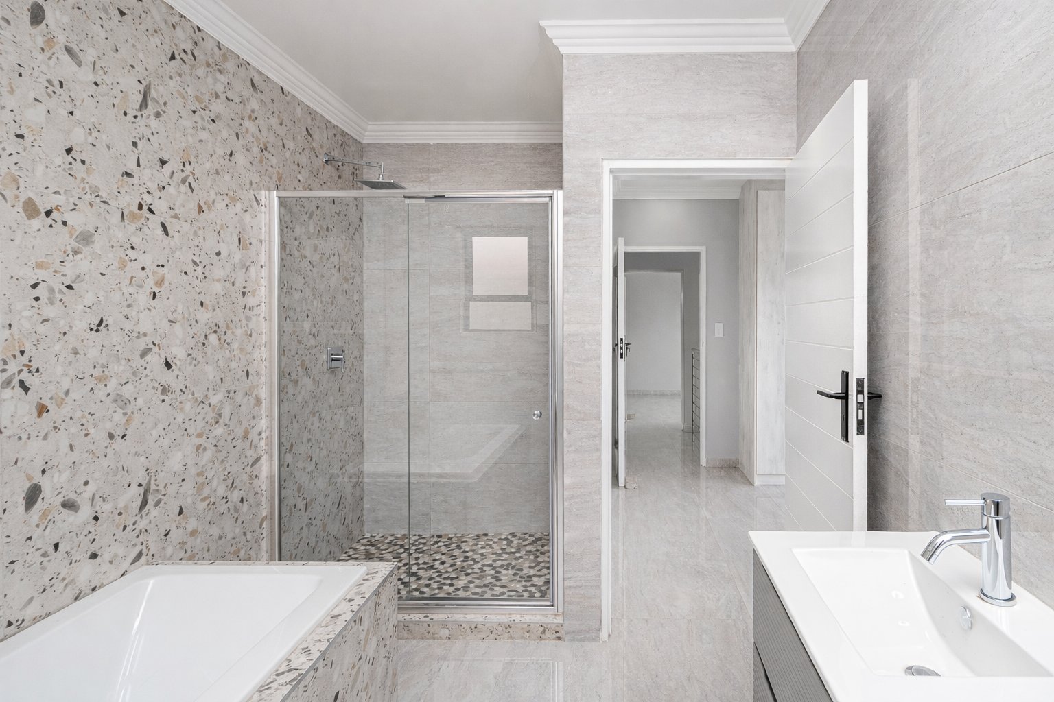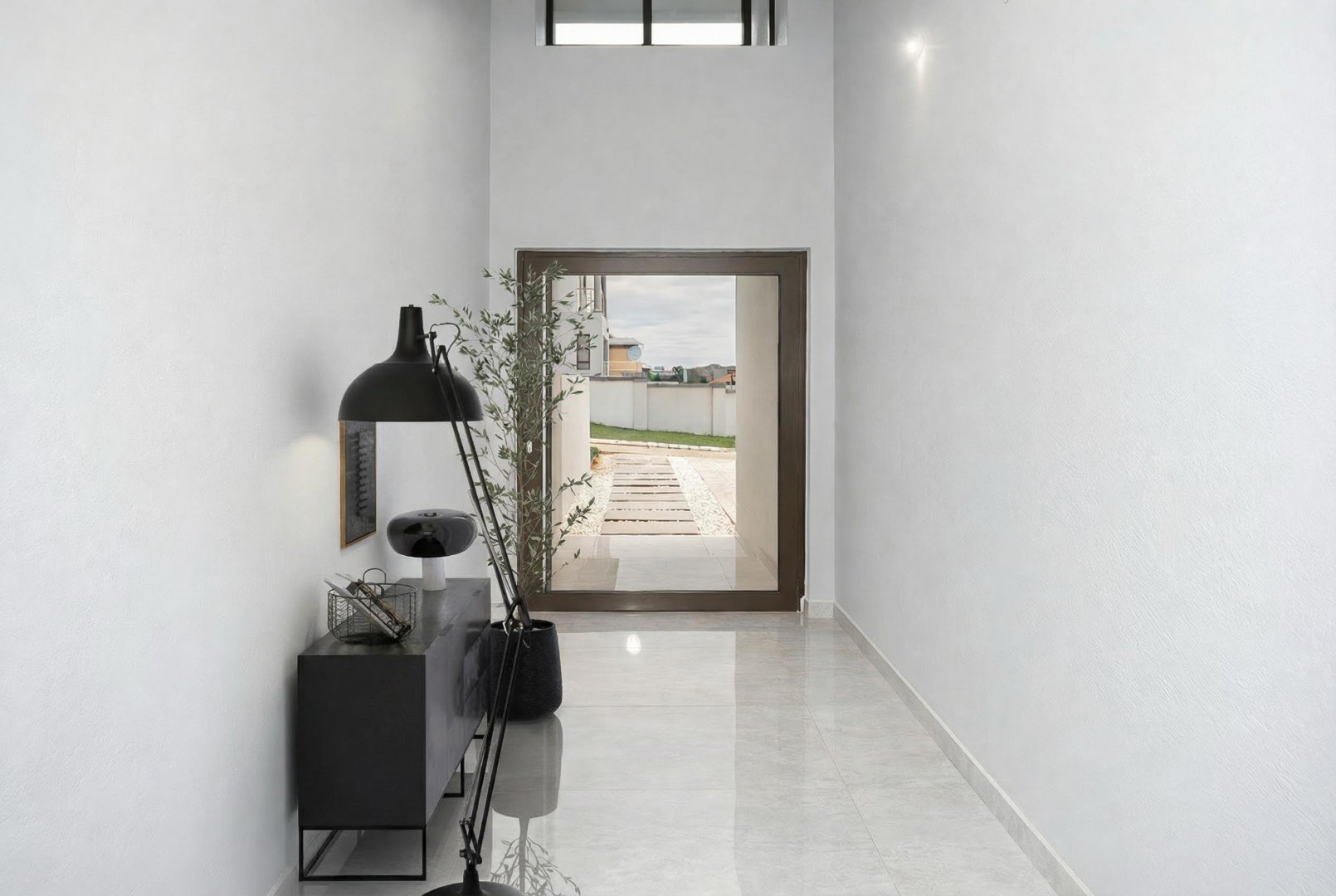 This newly built, digitally staged modern home in the sought-after Ruimsig Country Estate offers refined living with generous proportions and elegant finishes throughout. A welcoming entrance hall leads into an open-plan living space featuring seamless, high-gloss tiling that flows consistently through the home.