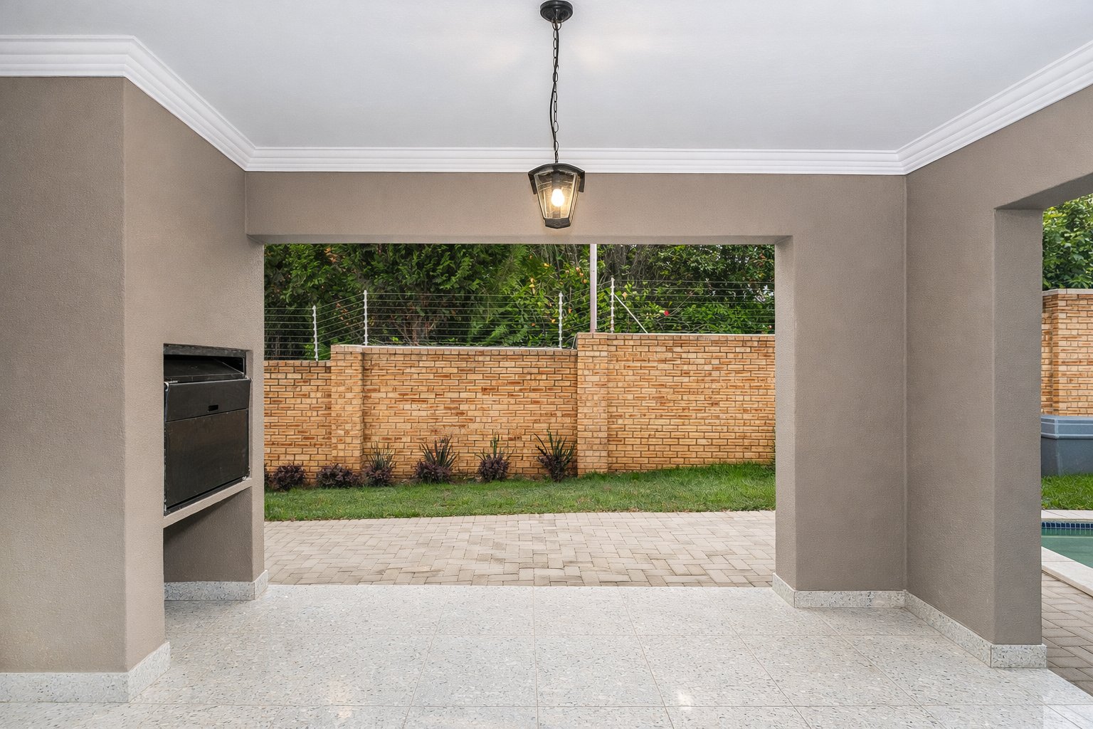 The lounge opens onto a covered patio with a built-in braai, overlooking a sparkling, well-sized swimming pool — ideal for relaxed outdoor living. The downstairs layout is completed by a private study, perfect for working from home, as well as a conveniently located powder room with additional storage.
