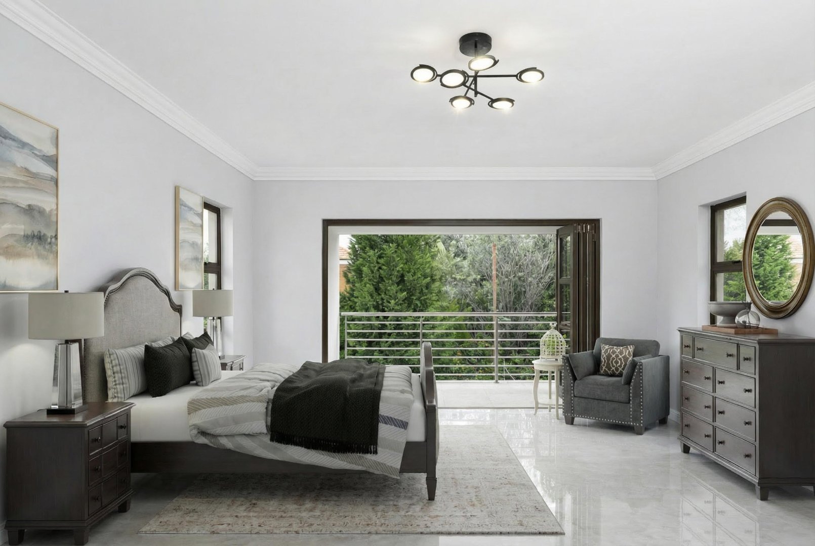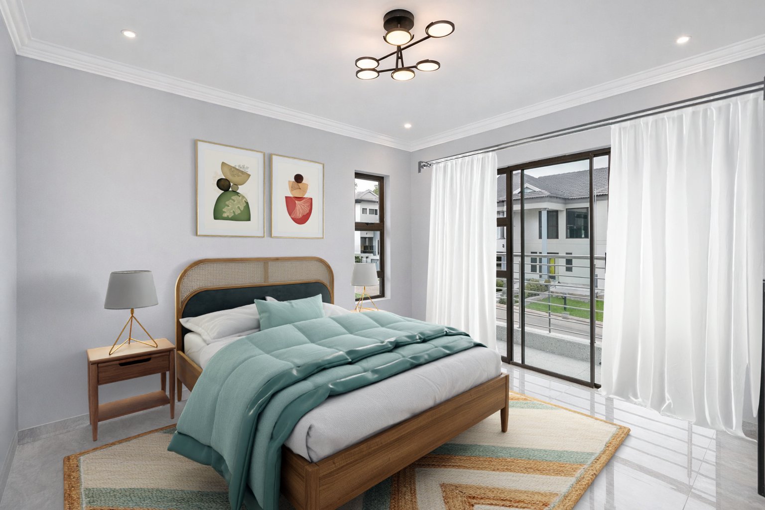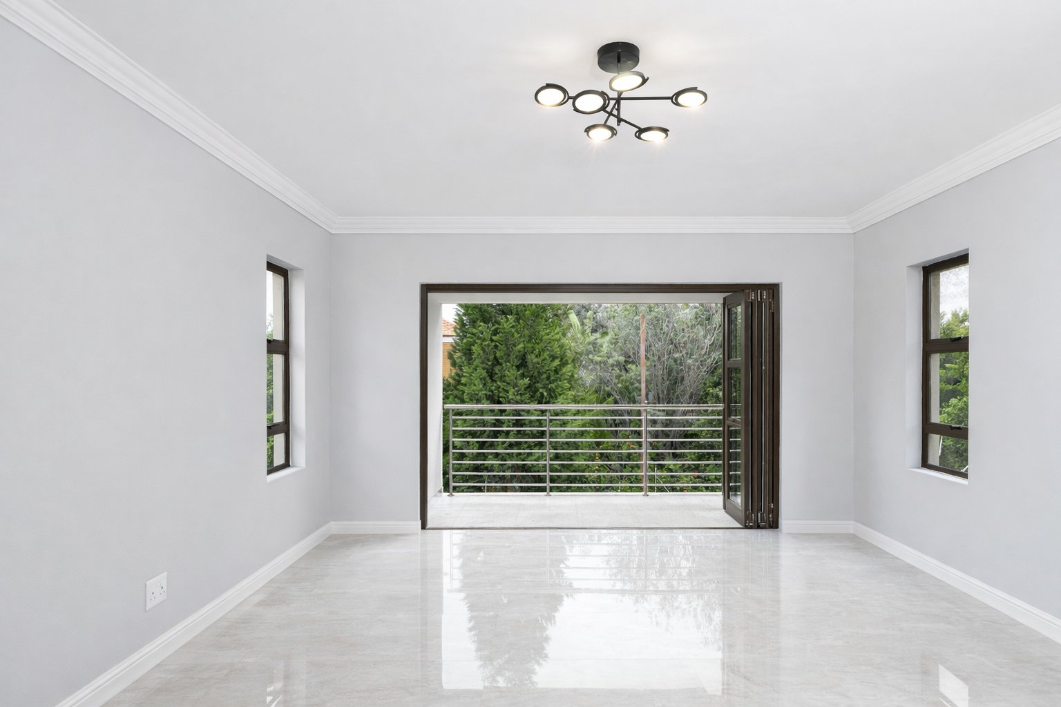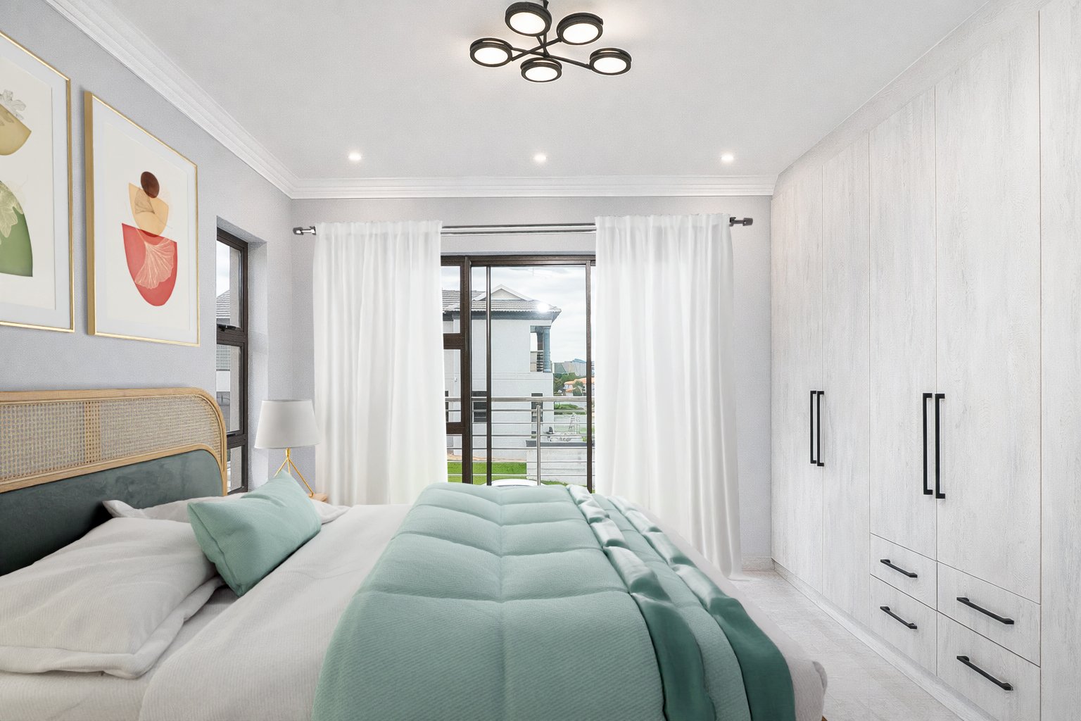 Upstairs, a spacious landing offers flexibility as a pyjama lounge or family relaxation area. The master suite is a private retreat featuring a walk-in closet, a full ensuite bathroom, and stack-away doors opening onto a balcony at the back of the home.