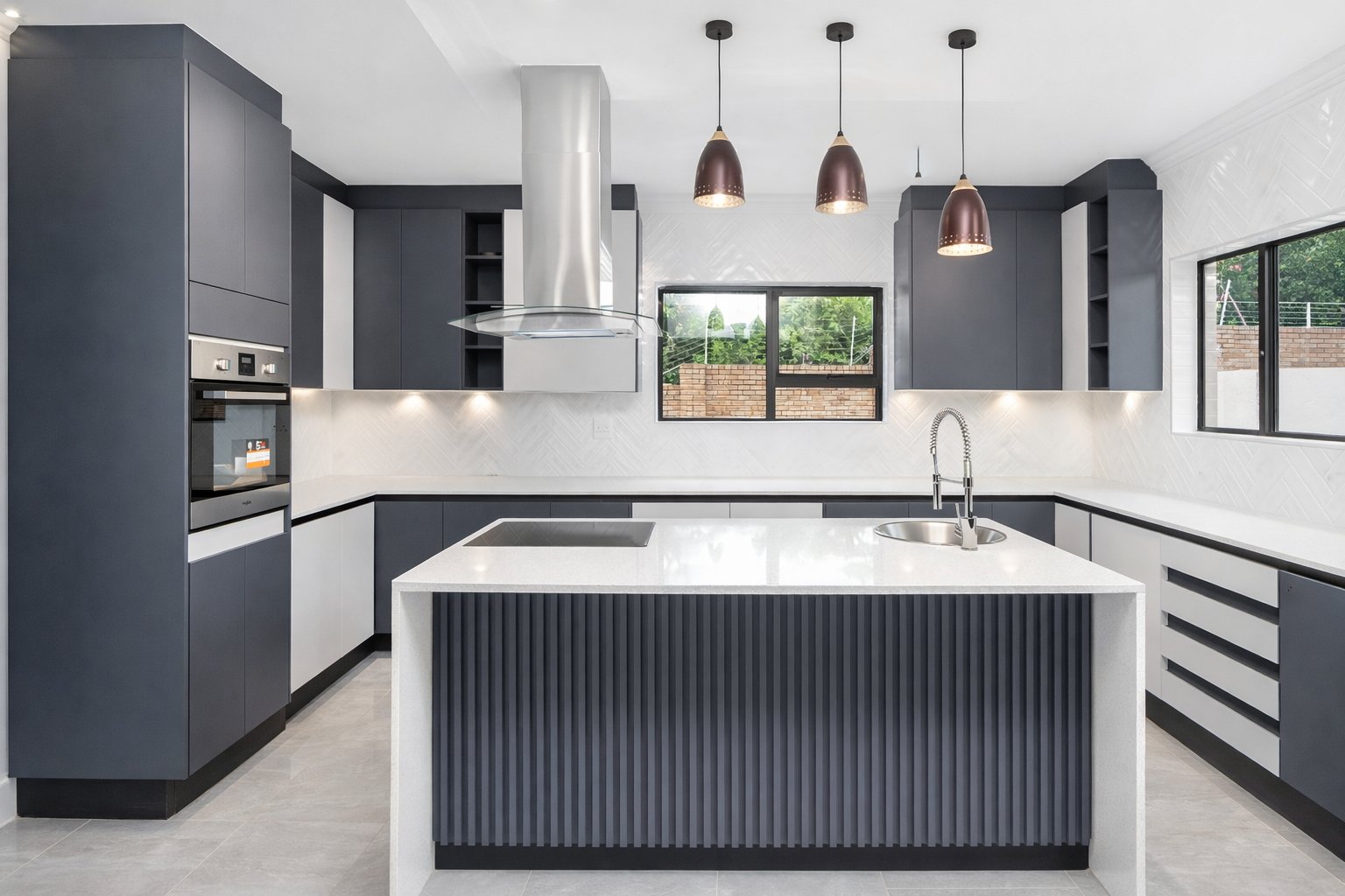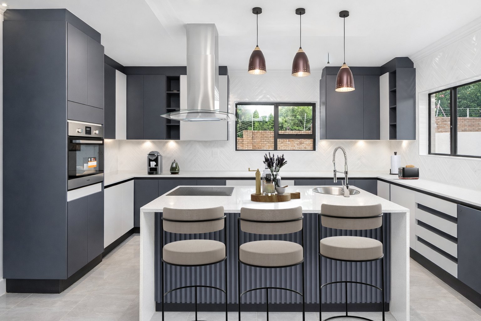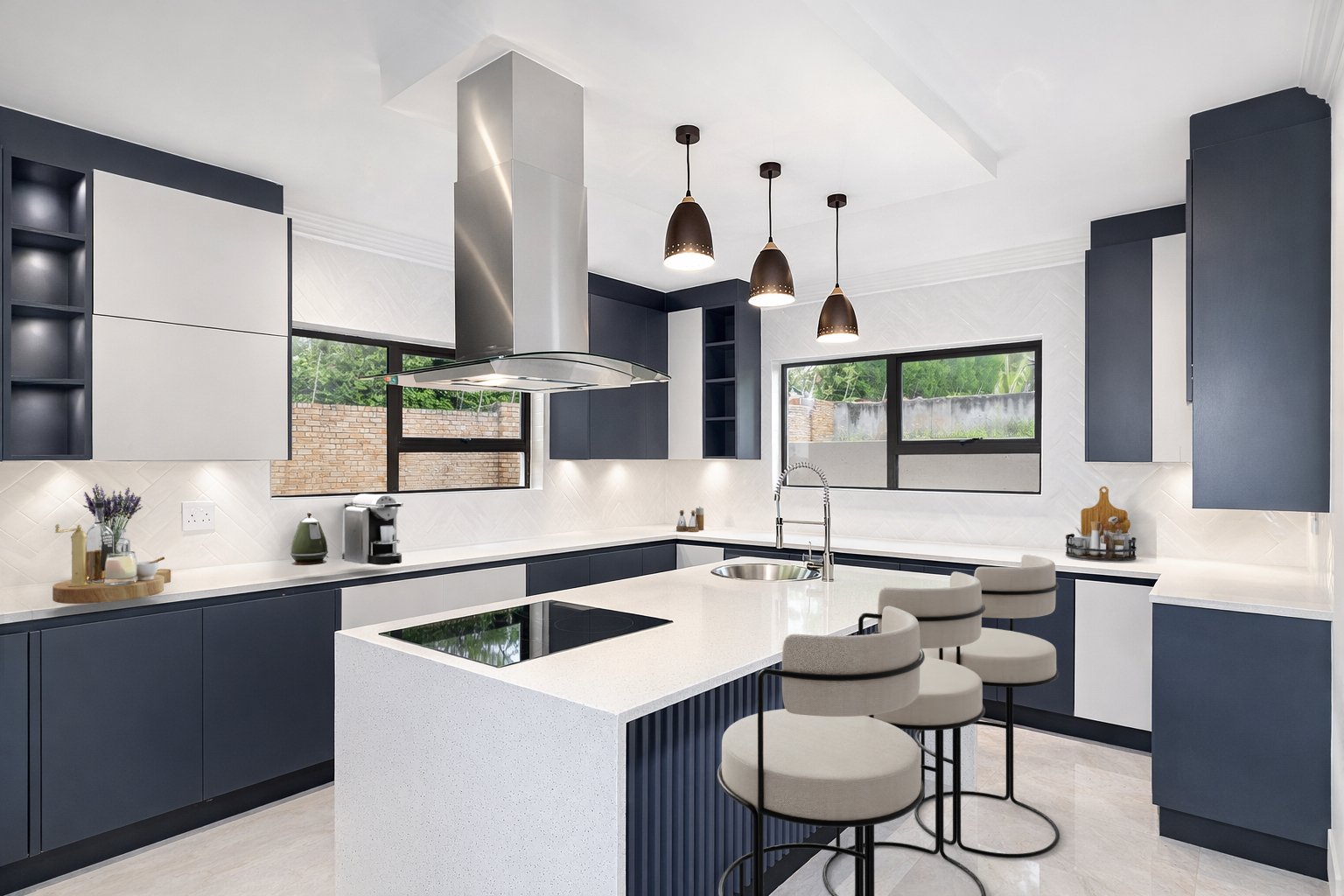 The modern kitchen is both stylish and functional, boasting a central island with a glass-top finish, quartz countertops, an eye-level oven with hob, and ample cupboard space. This is complemented by a separate scullery, finished with matching quartz surfaces and offering space for two appliances. The kitchen flows effortlessly into the open-plan dining and lounge area, creating an inviting space for everyday living and entertaining.
