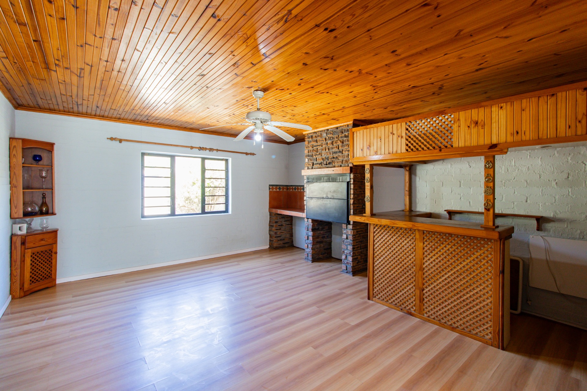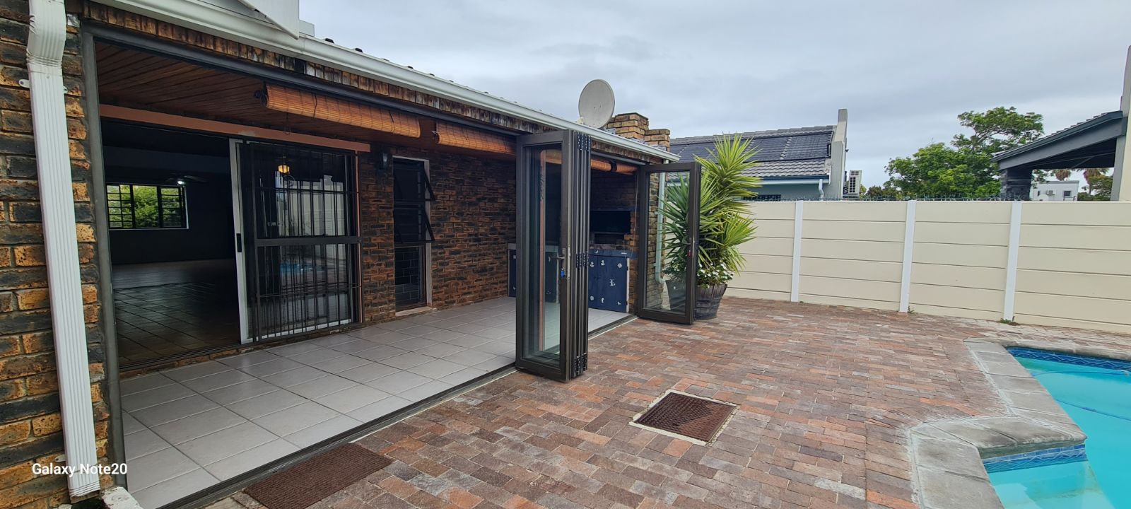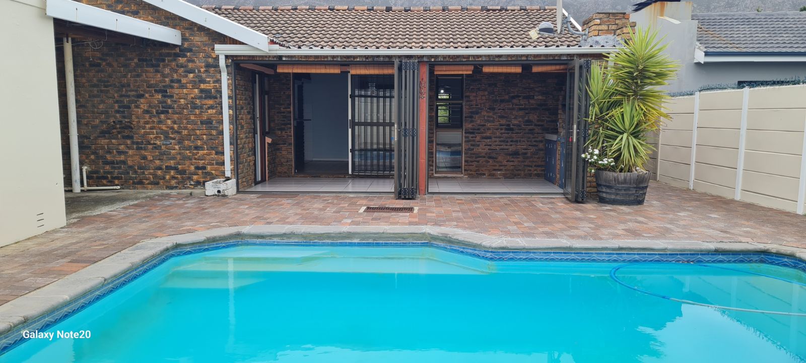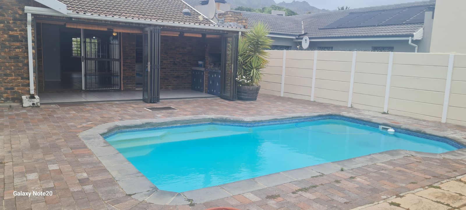 This home offers an open plan living areas with a large lounge and dining/family room with an indoor braai for those cold winter nights. The entertainment area comes with additional built-in braai, stacker doors leading out onto a enclosed, paved swimming pool area.