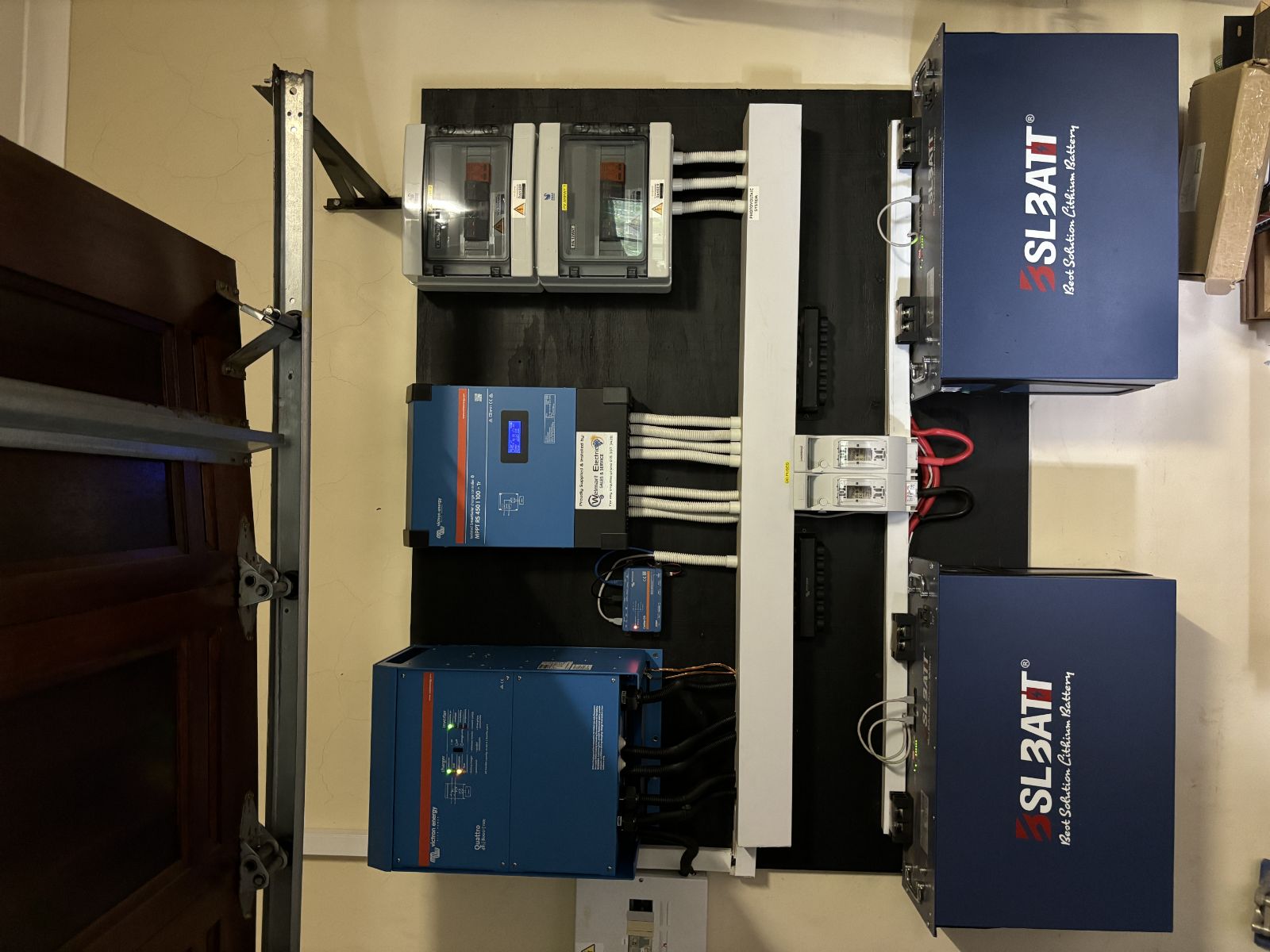 10kW Solar System featuring 6 lithium batteries, 25 solar panels, and an inverter system, offering energy efficiency and cost savings.