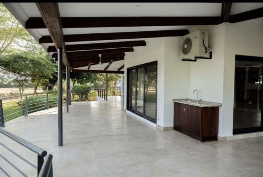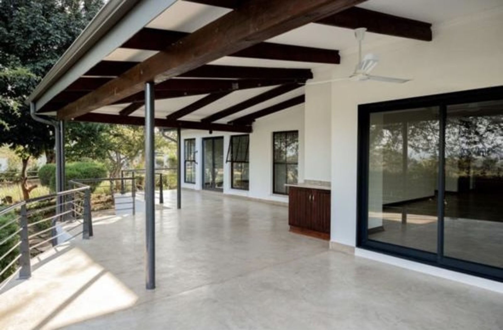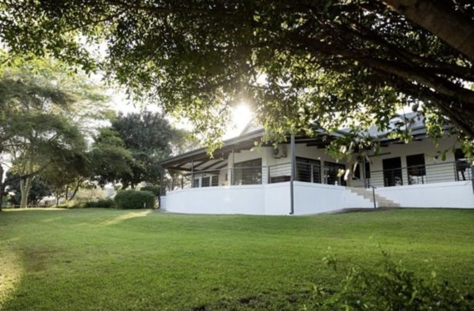A large, manicured garden surrounds the home, offering ample space, while the covered verandas create the perfect setting for outdoor dining and peaceful mornings.