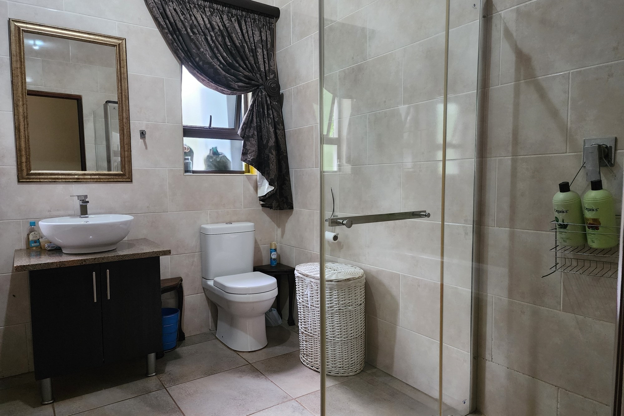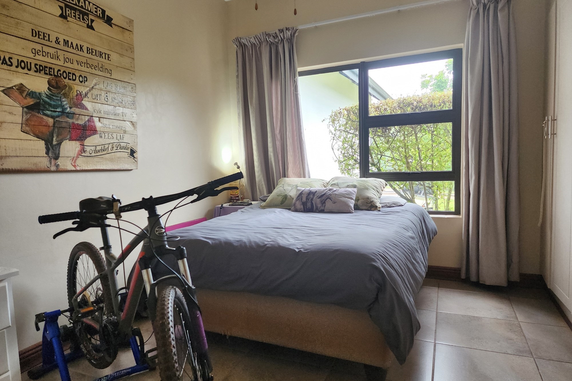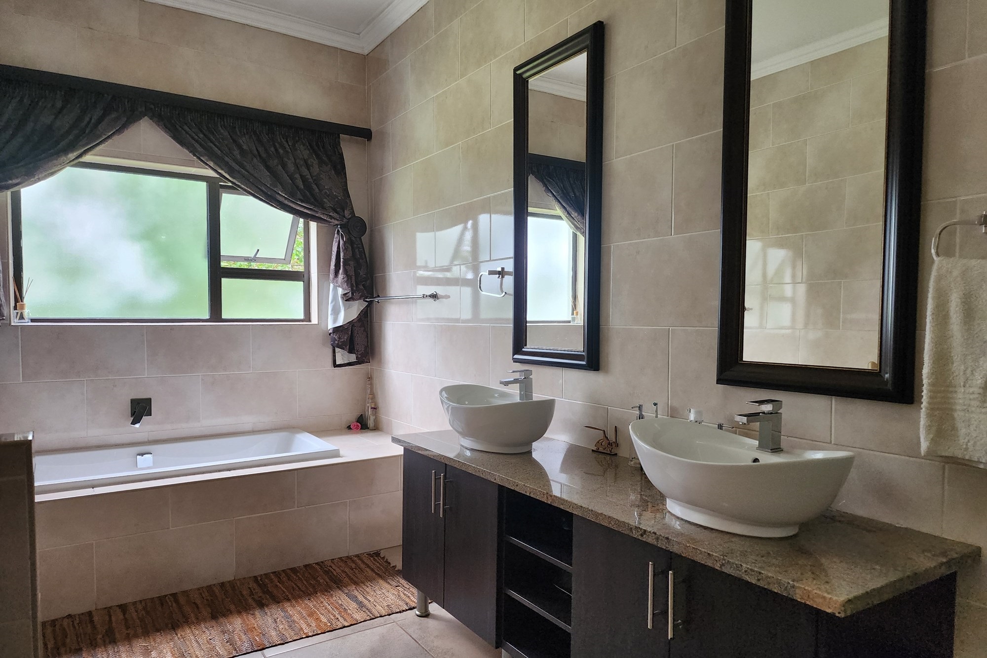 The main bedroom is a sanctuary of tranquility, featuring an en-suite bathroom with luxurious his-and-hers basins. Large windows on two sides flood the room with natural light, framing picturesque views. A sliding door opens onto a charming stoep, inviting you to wake up to fresh air and serene surroundings. The two additional bedrooms are generously sized, sharing a beautifully designed bathroom with a bath, shower, basin, and toilet.