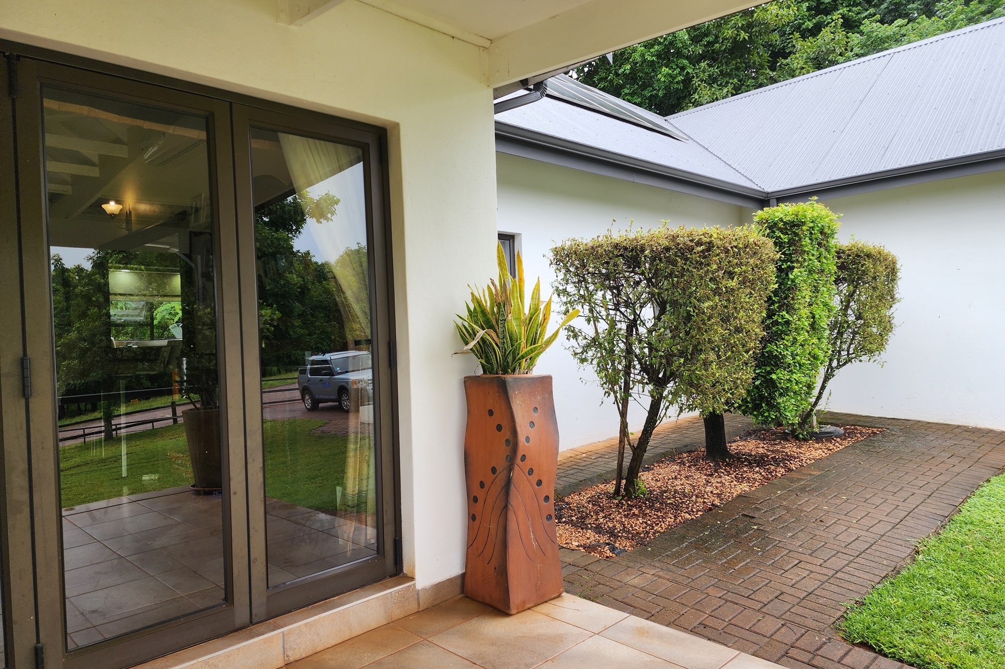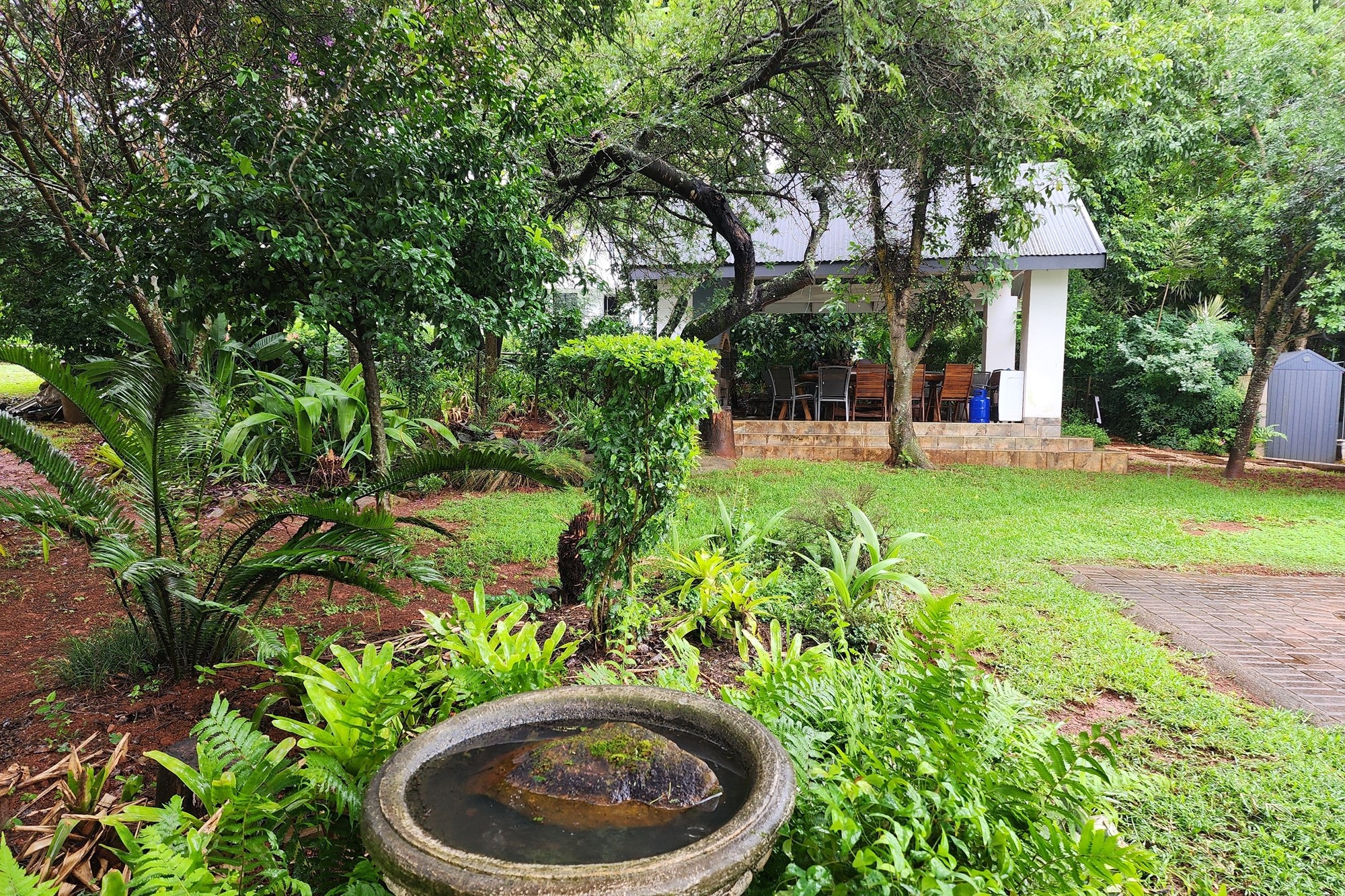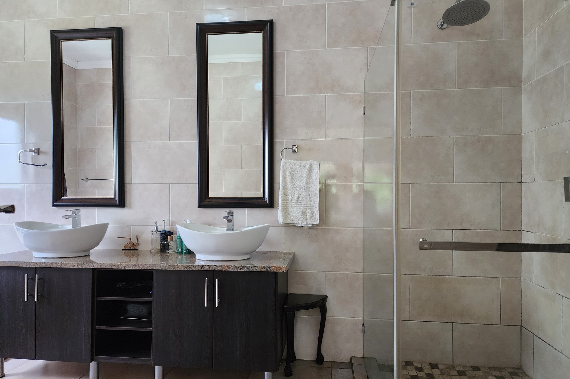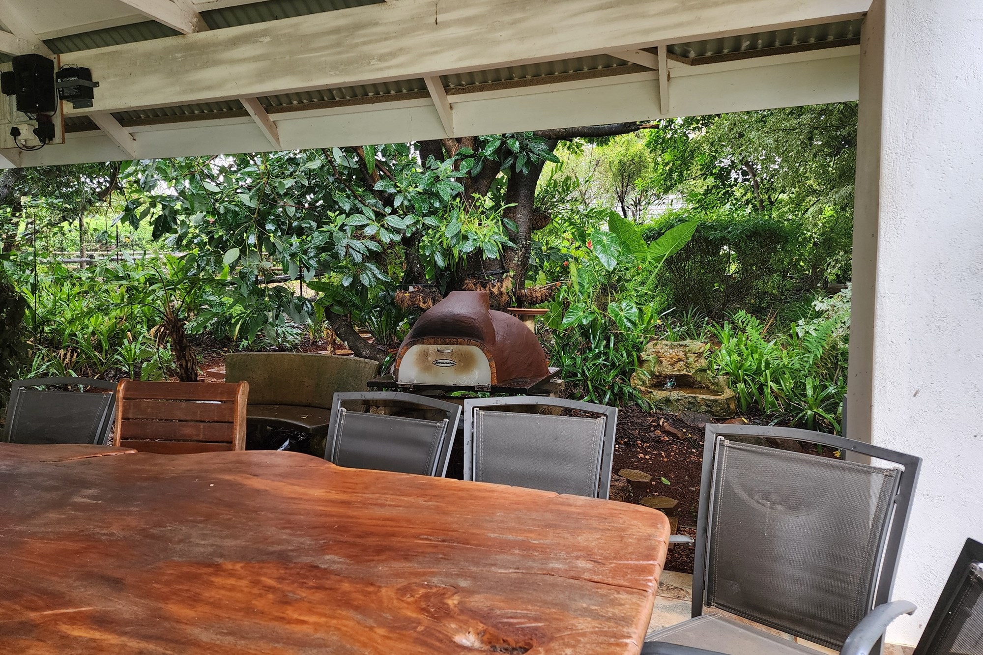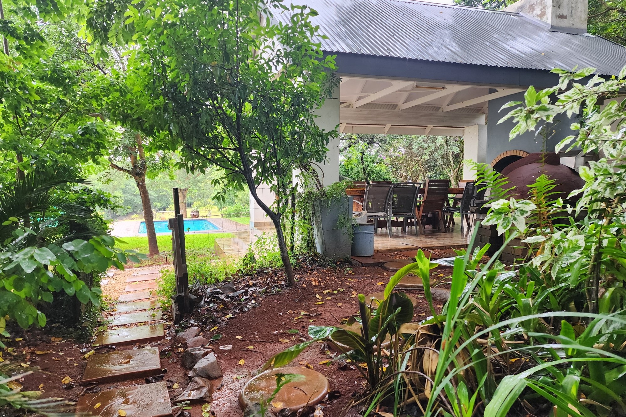 Outdoors, the lush, established garden is a haven of beauty and tranquility, with free-roaming game adding a touch of nature’s charm. The inviting pool is the perfect spot for relaxation, complemented by a beautifully designed braai area and an authentic pizza oven, creating an entertainer’s paradise.
