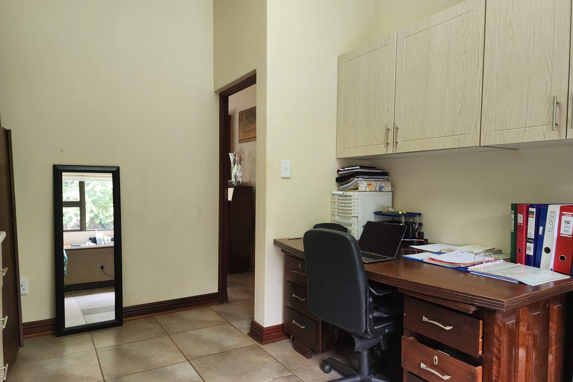 A spacious private office, complete with elegant built-in cupboards, overlooks the sparkling swimming pool, making it an ideal space for productivity and inspiration. The heart of the home is a warm and welcoming open-plan lounge and dining area, where a cozy fireplace creates the perfect ambiance for winter evenings. This space seamlessly flows onto a generous veranda, perfect for entertaining or simply enjoying the peaceful atmosphere.
