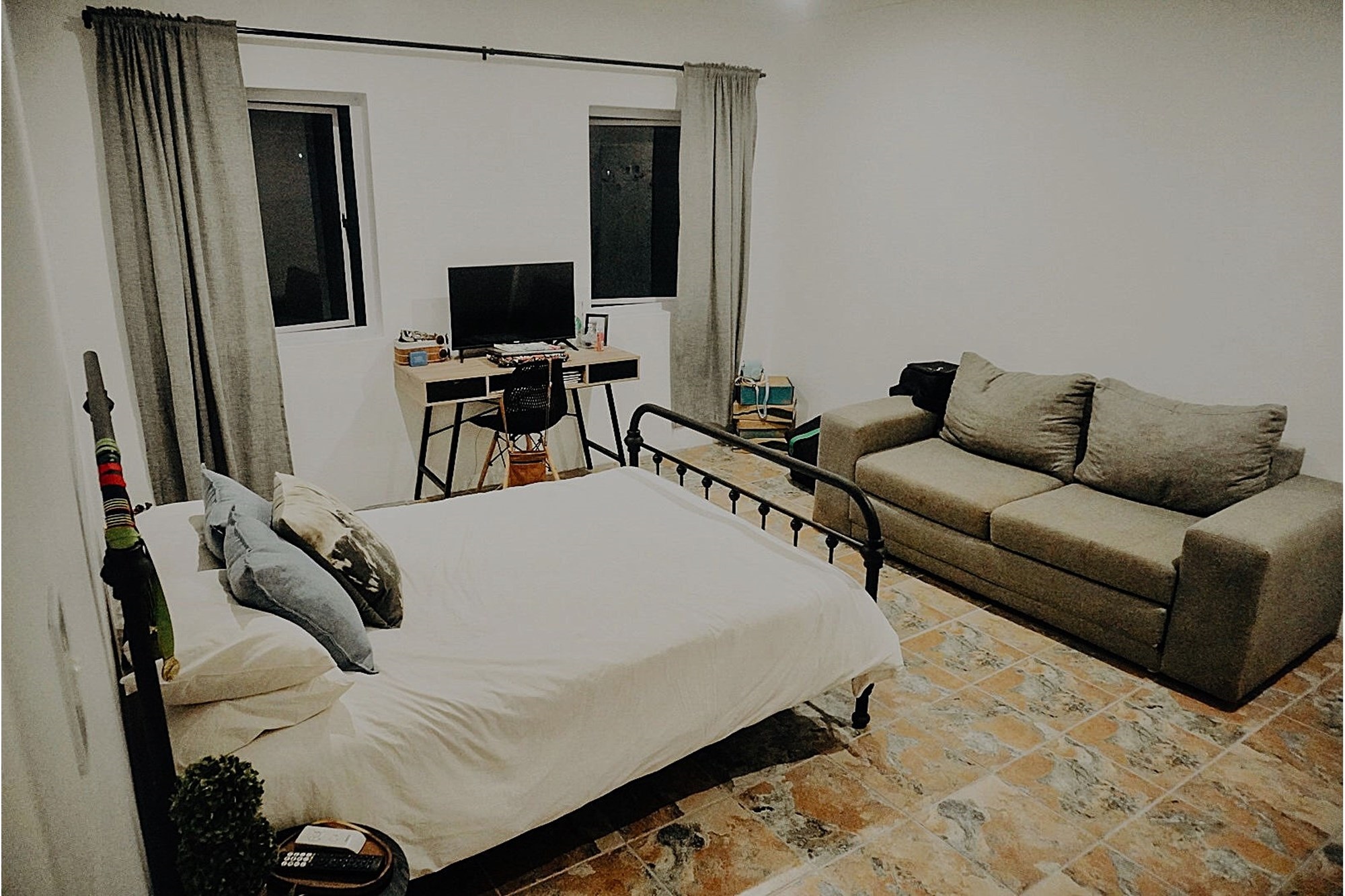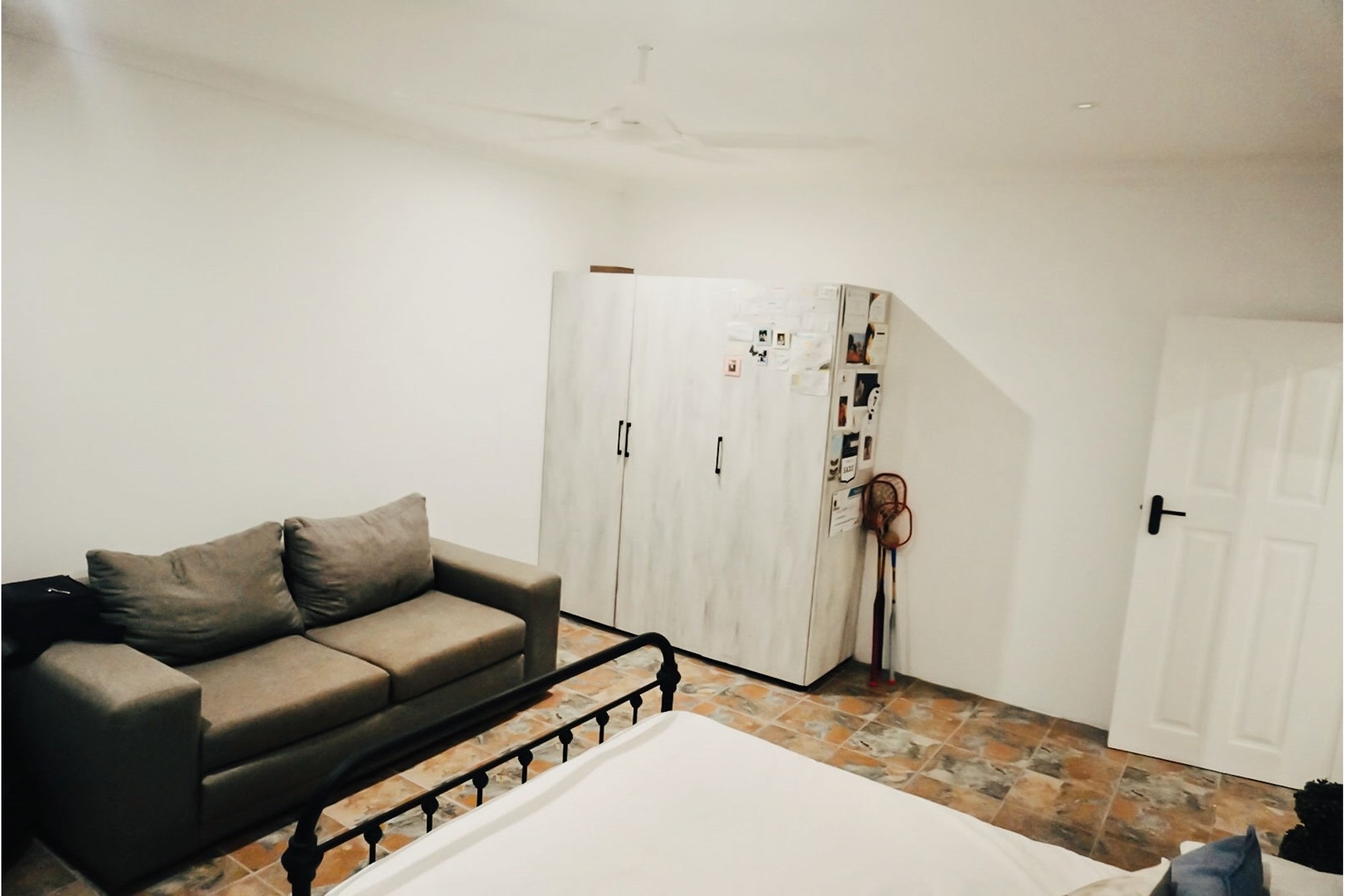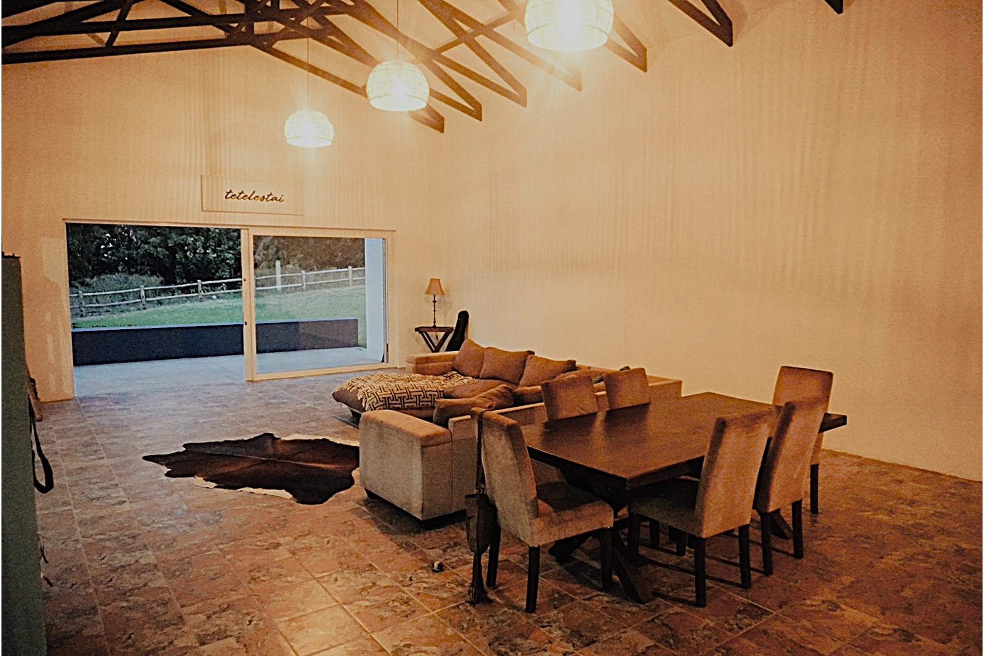 A spacious open-plan layout seamlessly connects the kitchen, dining, and living areas. Exposed beams add warmth and character, enhancing the home’s inviting atmosphere. These living spaces flow naturally onto an undercover patio, ideal for entertaining guests or enjoying quiet moments in a peaceful setting.