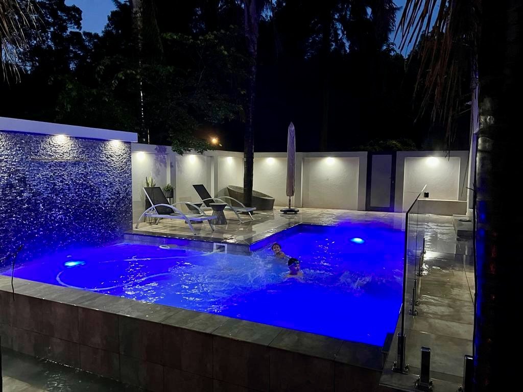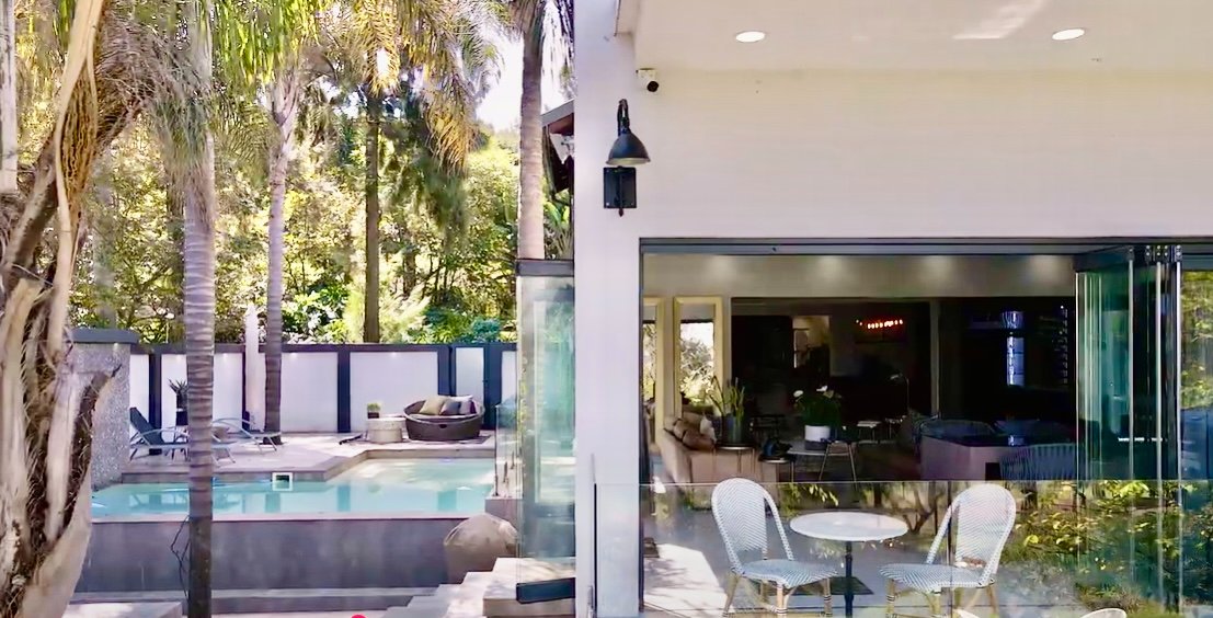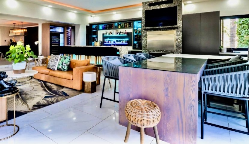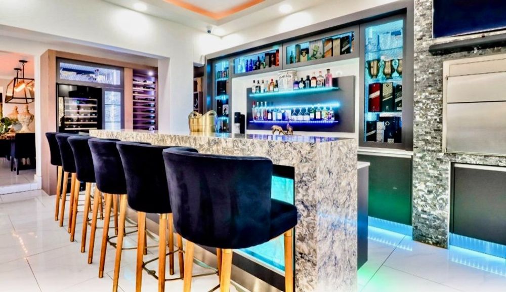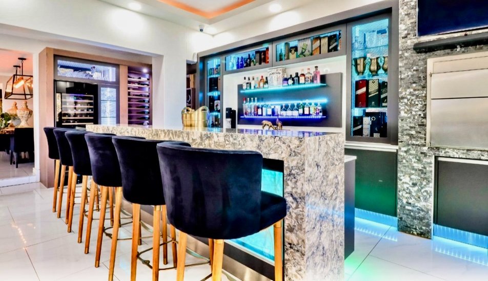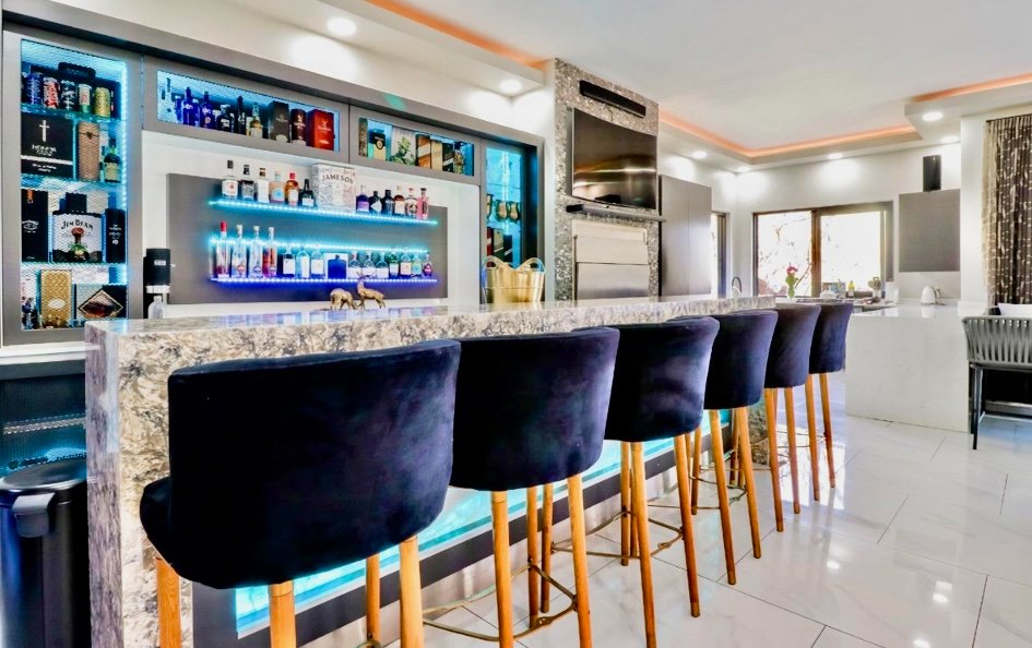 Elegant marble bar and entertainment space flowing seamlessly to the rim-flow pool through frameless stacking glass doors