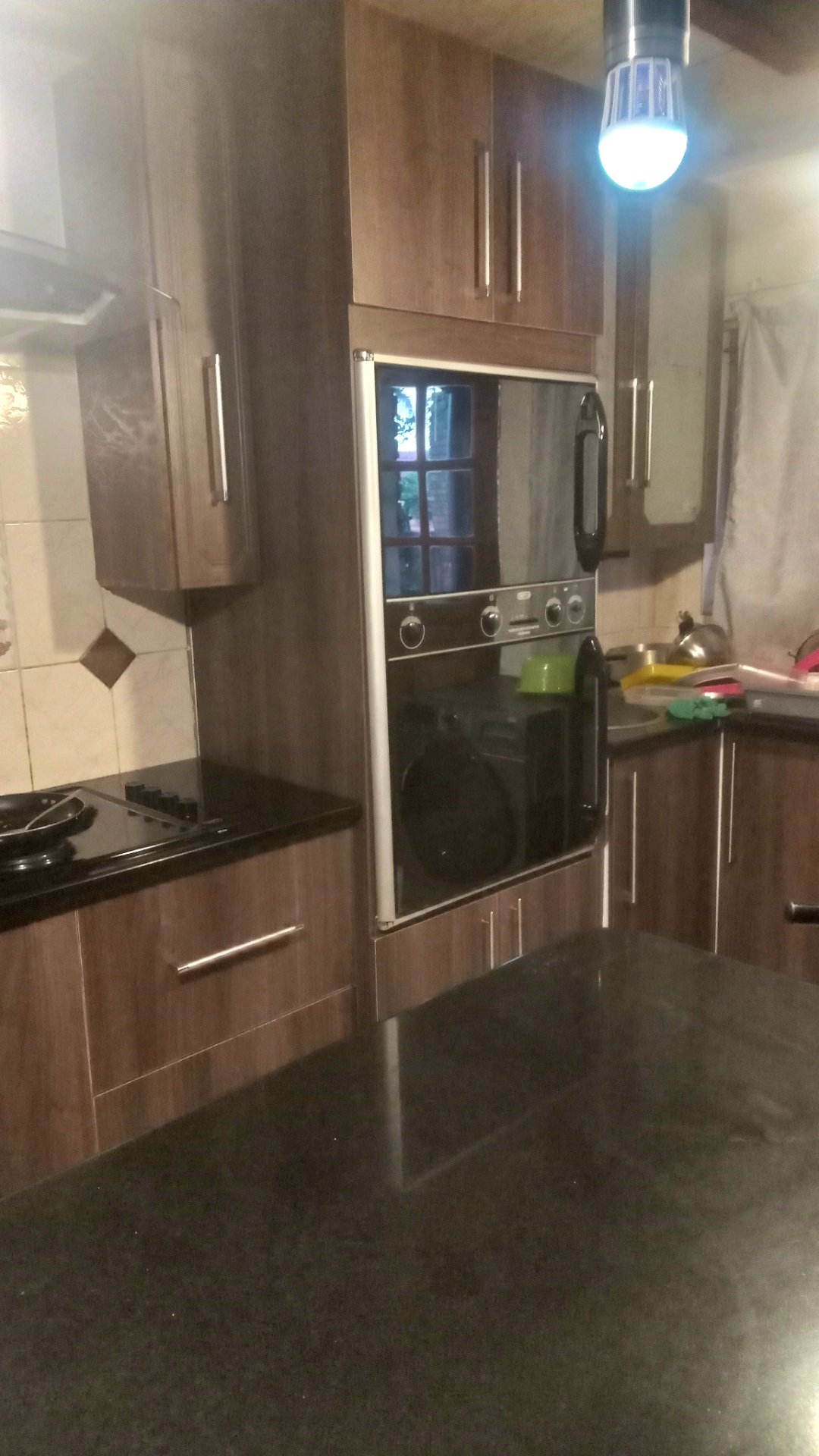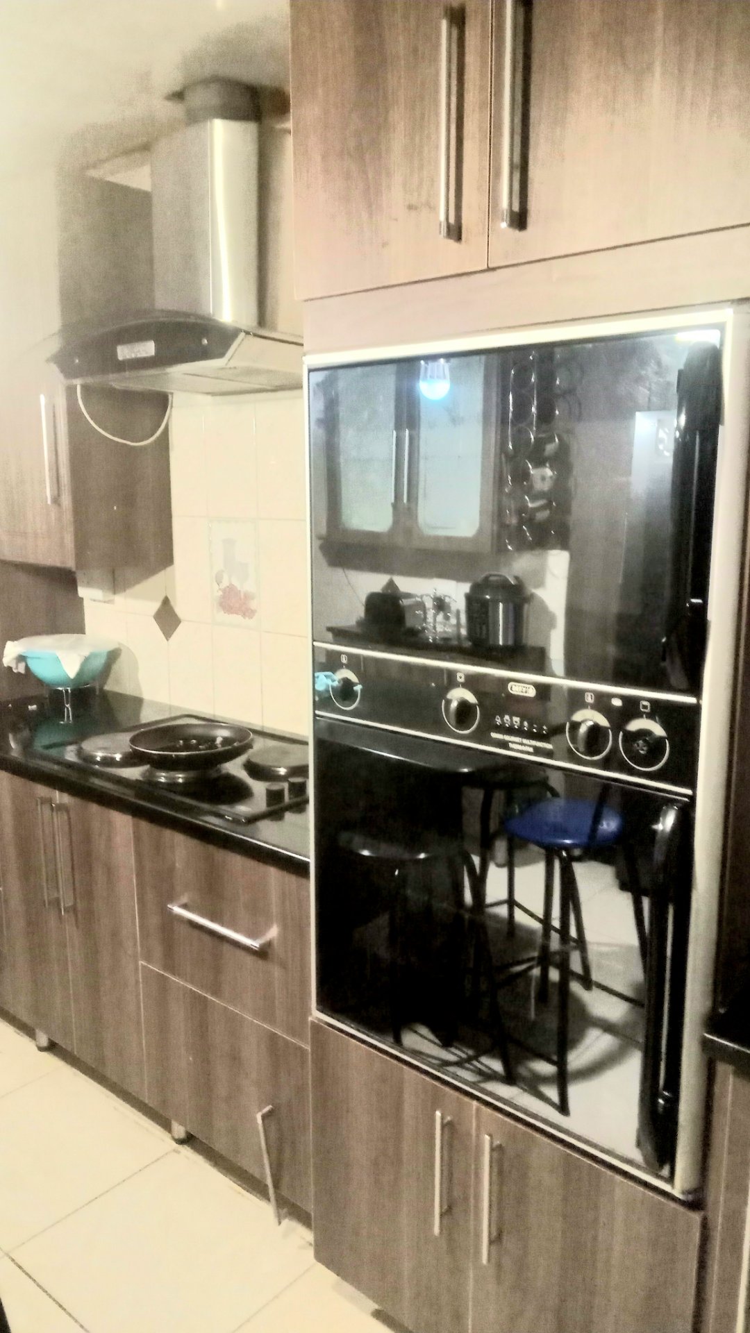 Modern kitchen with high-quality finishes, DEFY double oven stove, pantry, and ample cupboards and granite counters.