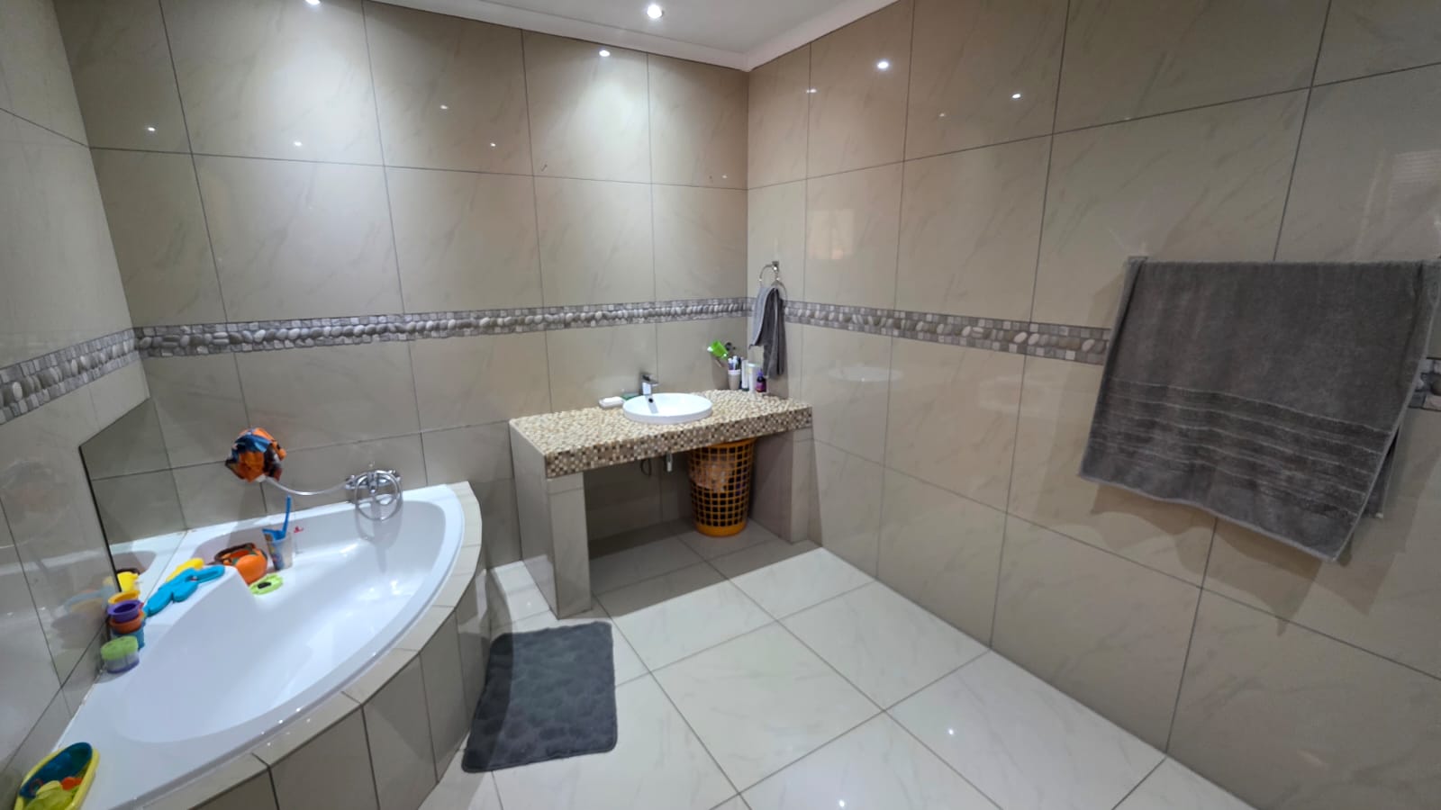 This exceptional home is in a class of its own, offering refined luxury and ultimate comfort in a peaceful, relaxing environment. All three bedrooms are generously oversized, with the main bedroom featuring a stunning en-suite bathroom with a corner bath. Each bedroom opens onto a beautiful patio and terrace, while the second bathroom includes a separate toilet. The chef’s kitchen boasts granite countertops, a gas stove, scullery, and separate wash-up area. Spacious living, dining, and TV rooms flow seamlessly onto the patio through elegant wooden doors. The fully revamped home is perfectly tiled throughout. Outside offers automated access, double garages, a landscaped garden with water tank, covered entertainment patio with built-in braai, sparkling pool, boma, lapa, and backup power system.