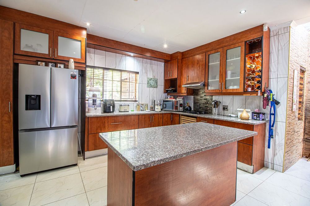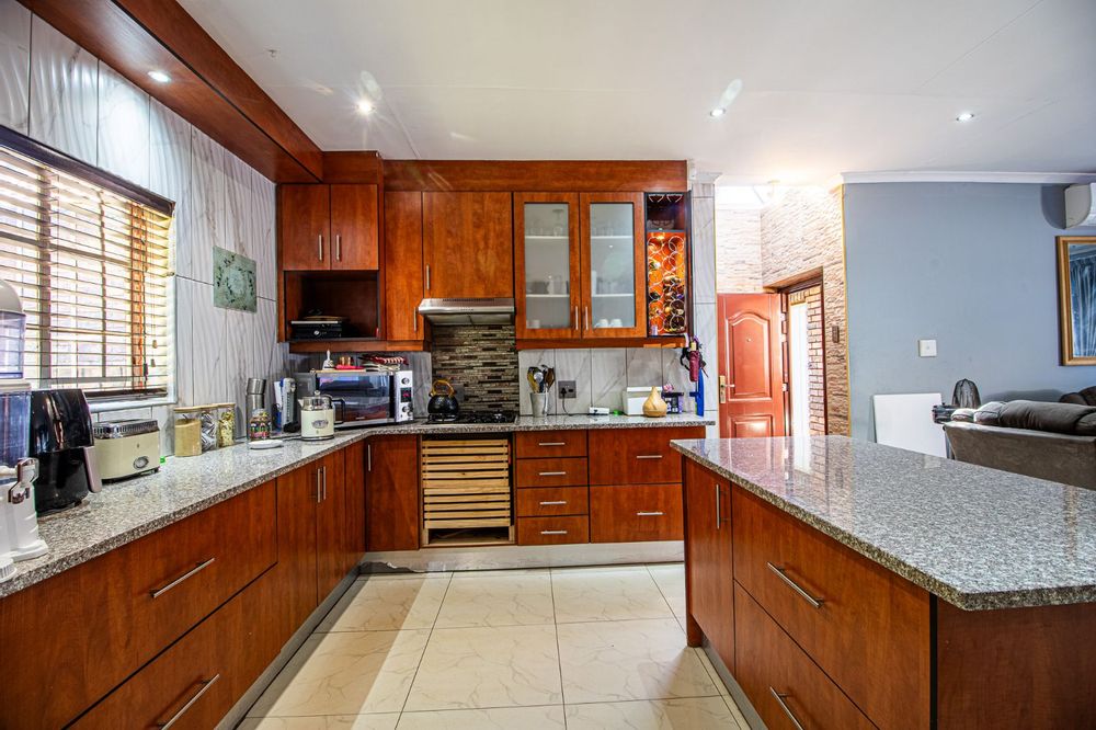 The modern, expansive open-plan kitchen features beautiful cherry wood cupboards and sleek granite countertops. Immaculately finished, this stylish property offers a warm and inviting atmosphere.