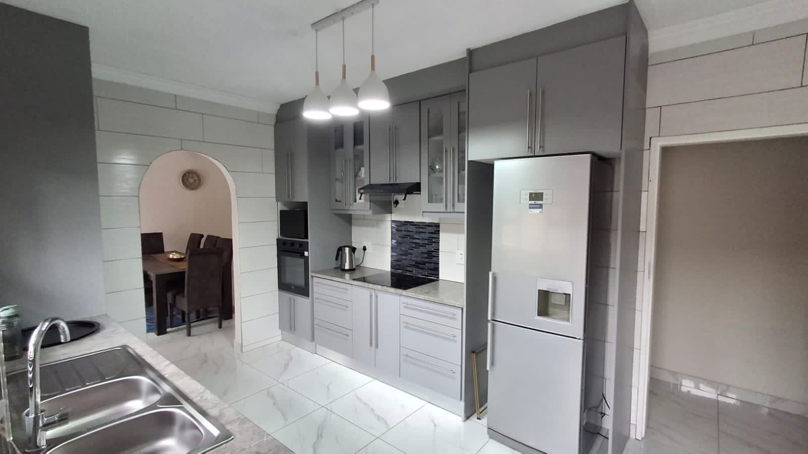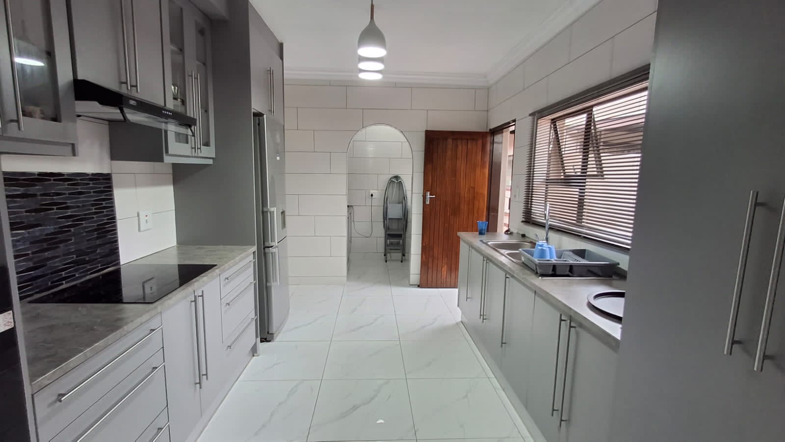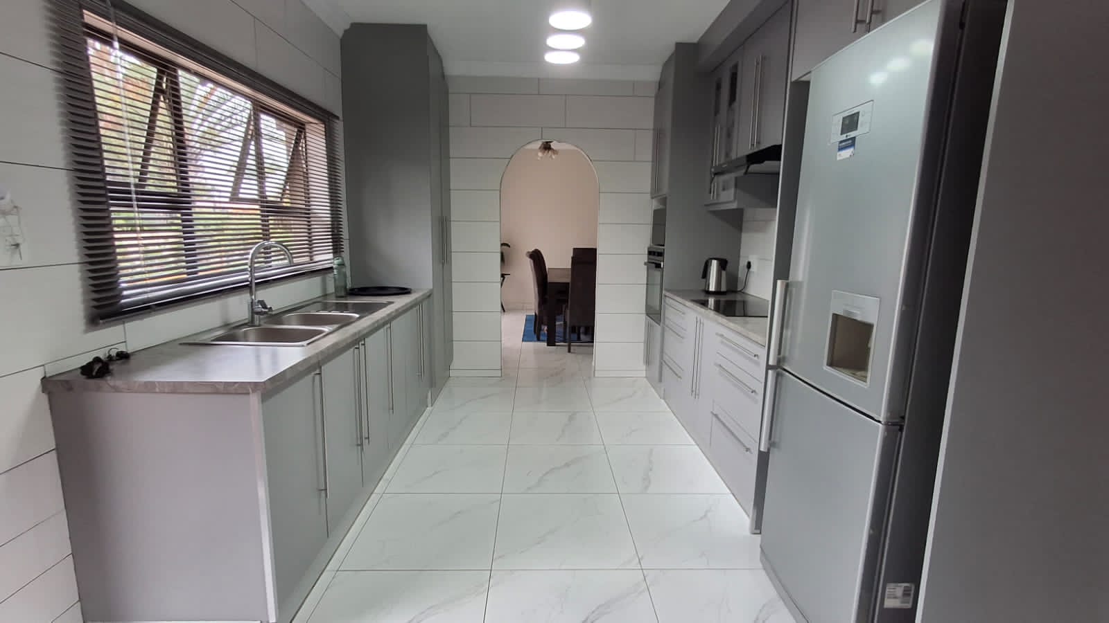 Modern kitchen with granite tops, ample built in cupboards and scullery