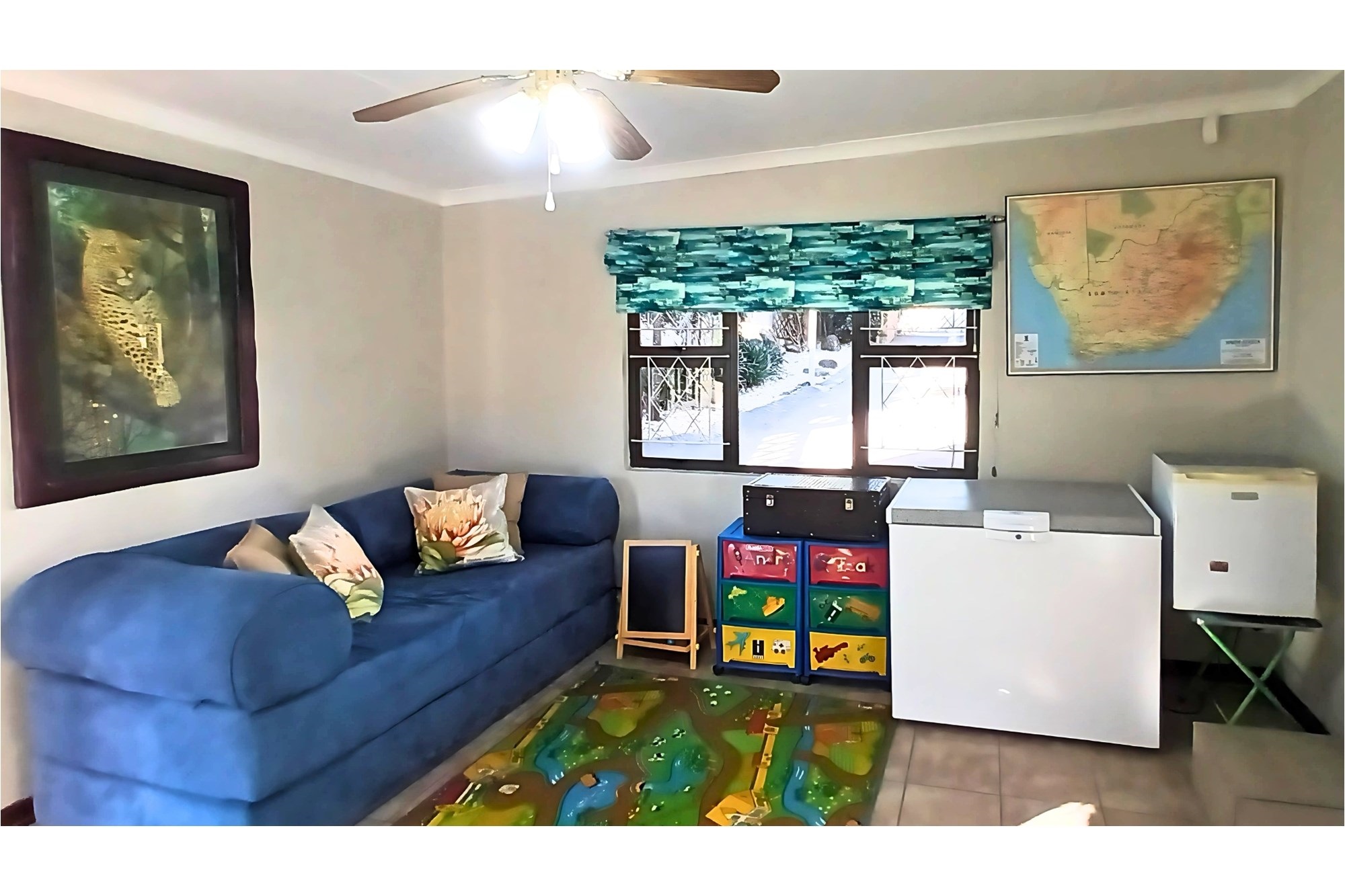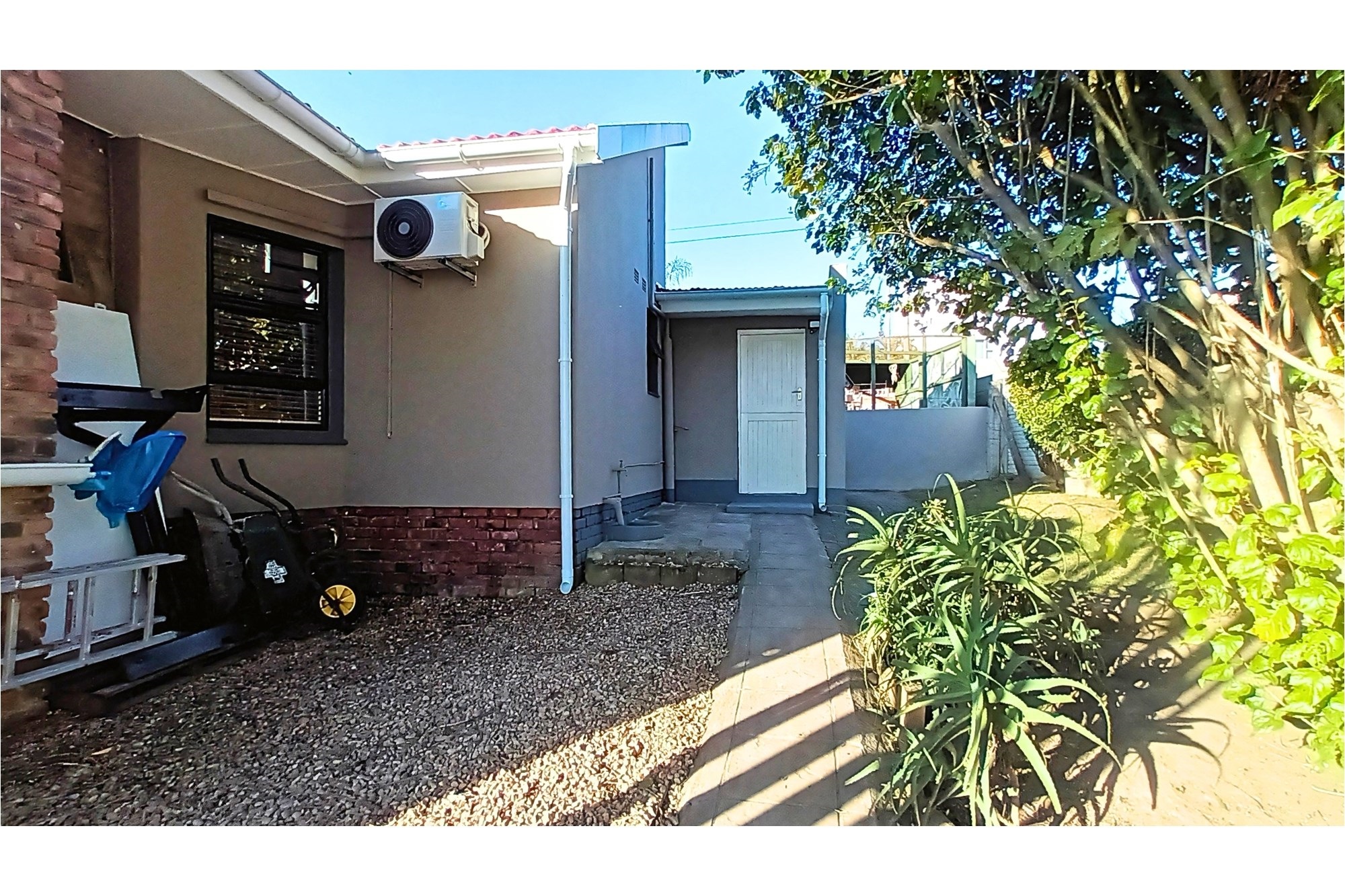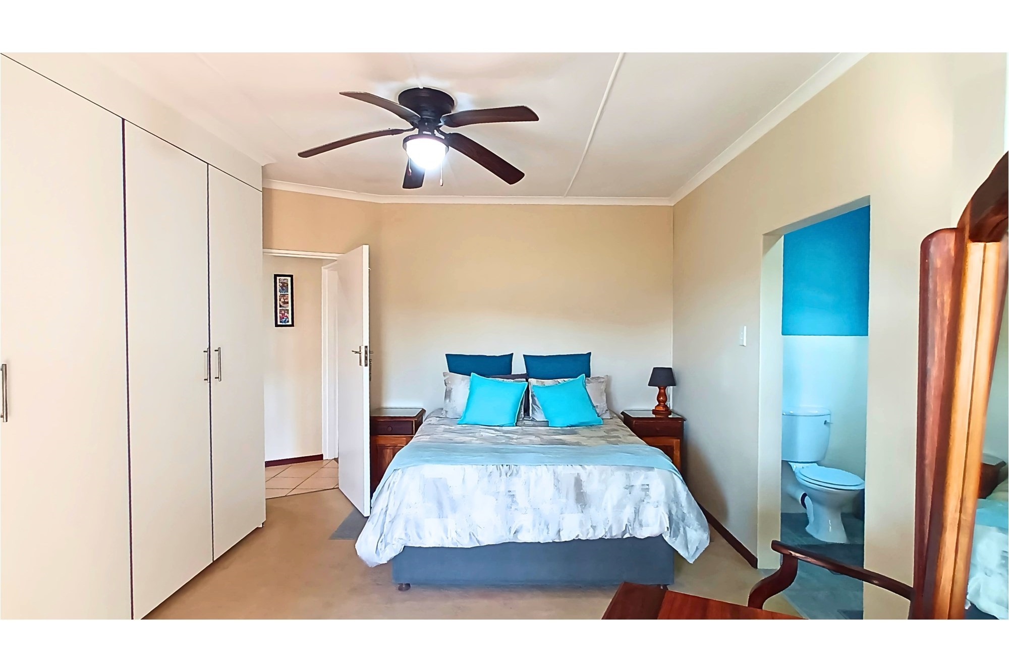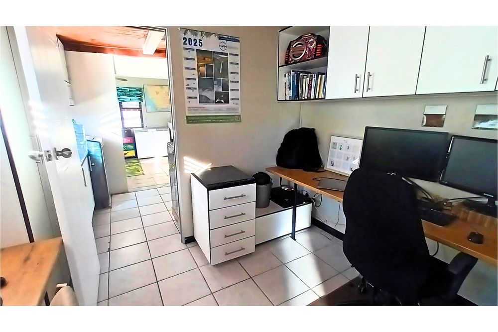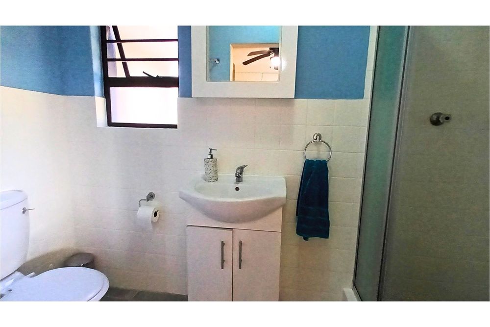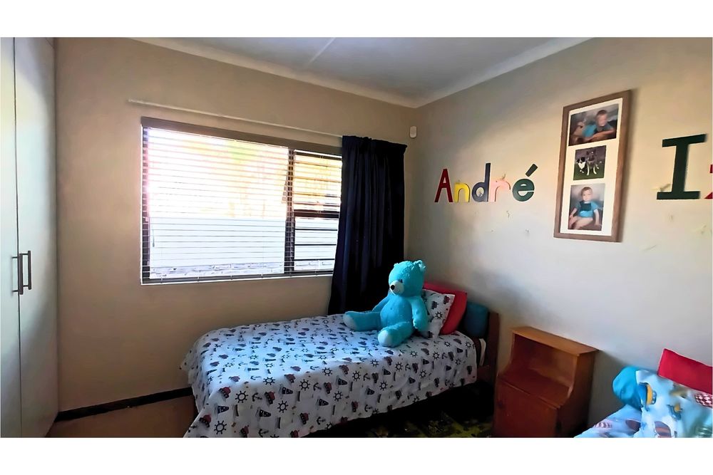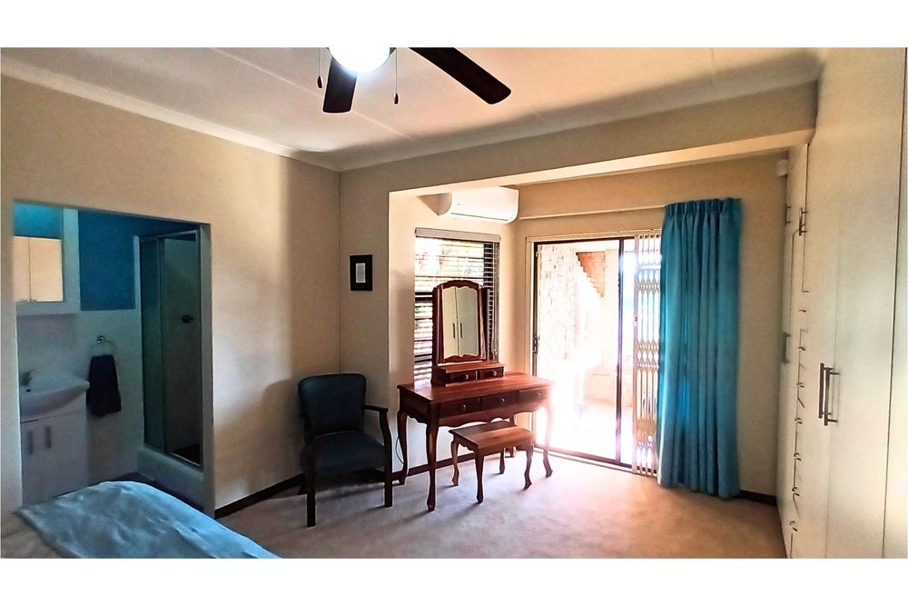 The spacious Granny Flat has its own private entrance and is tiled throughout. It offers a comfortable open-plan lounge with a ceiling fan, a well-fitted kitchen with built-in cupboards, blinds, and a washing machine connection, and a separate study, also fitted with built-in cupboards and blinds. The flat boasts a spacious bedroom, complete with built-in cupboards, ceiling fan, and air conditioning, and a modern bathroom with a shower, toilet, and basin—making it an ideal space for extended family, guests, or potential rental income.