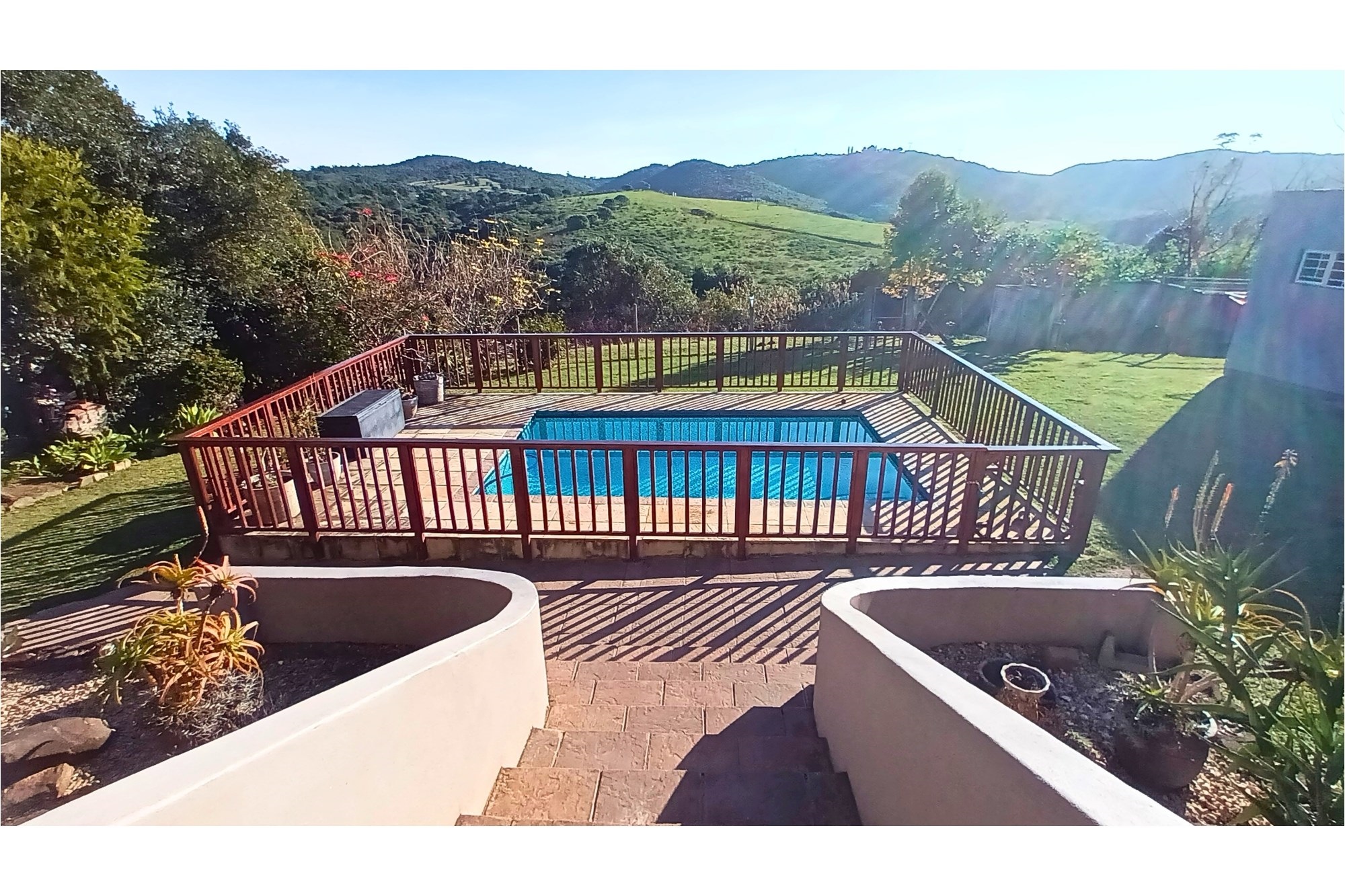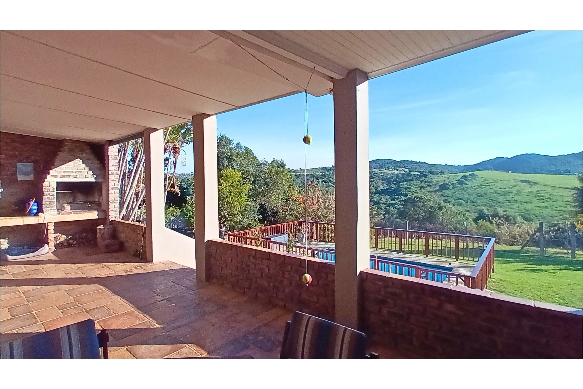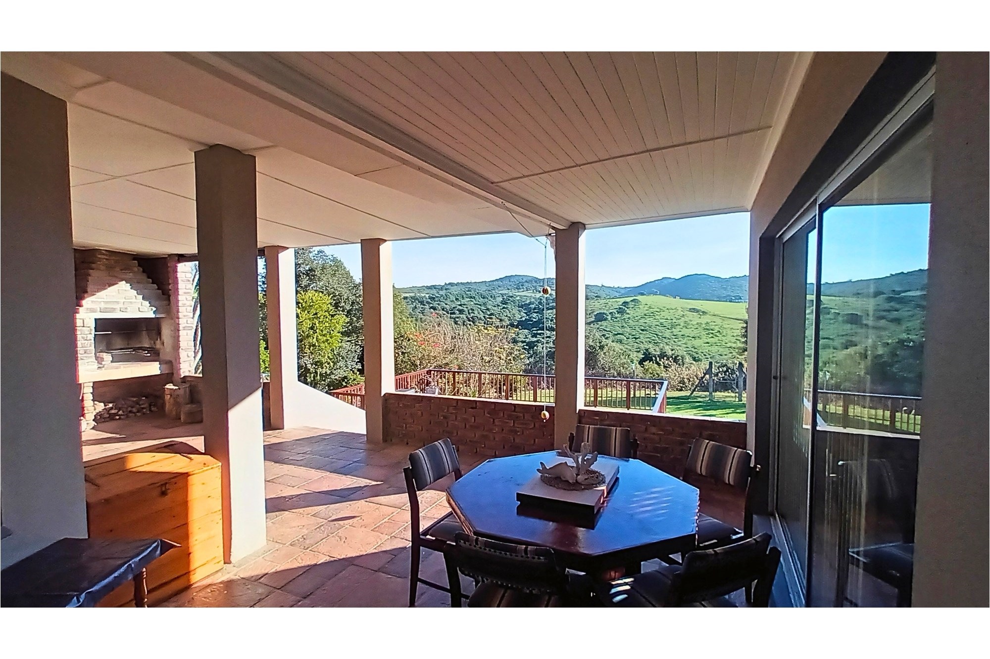 The heart of the home is the large, open-plan kitchen, designed with ample built-in cupboards and work space, flowing seamlessly to the dining area and a warm, inviting lounge. This living space opens onto a fully enclosed entertainment area featuring a built-in braai, where family and friends can gather while enjoying beautiful views over the manicured garden and sparkling, fenced swimming pool.