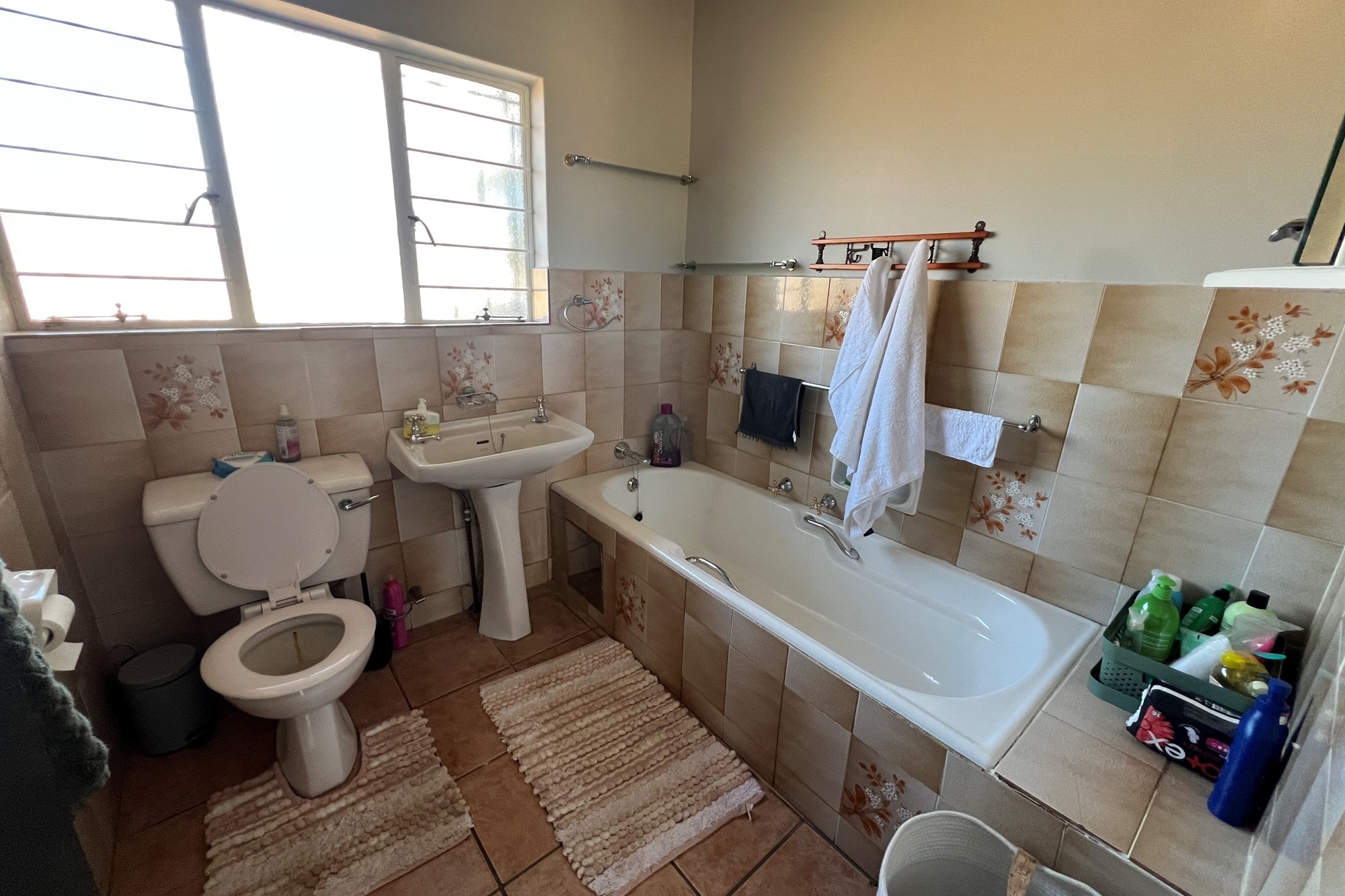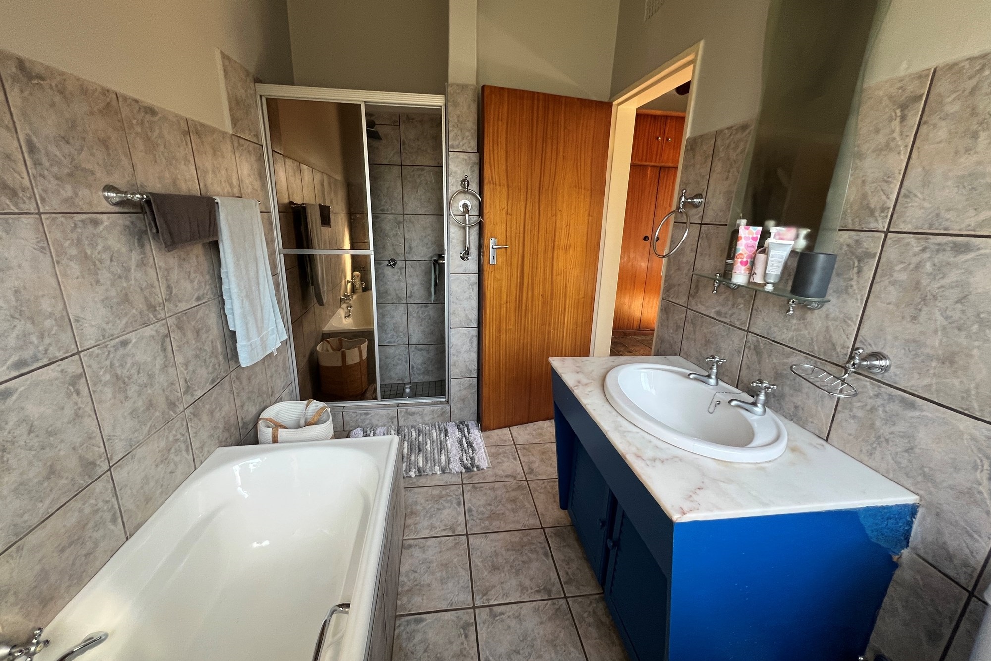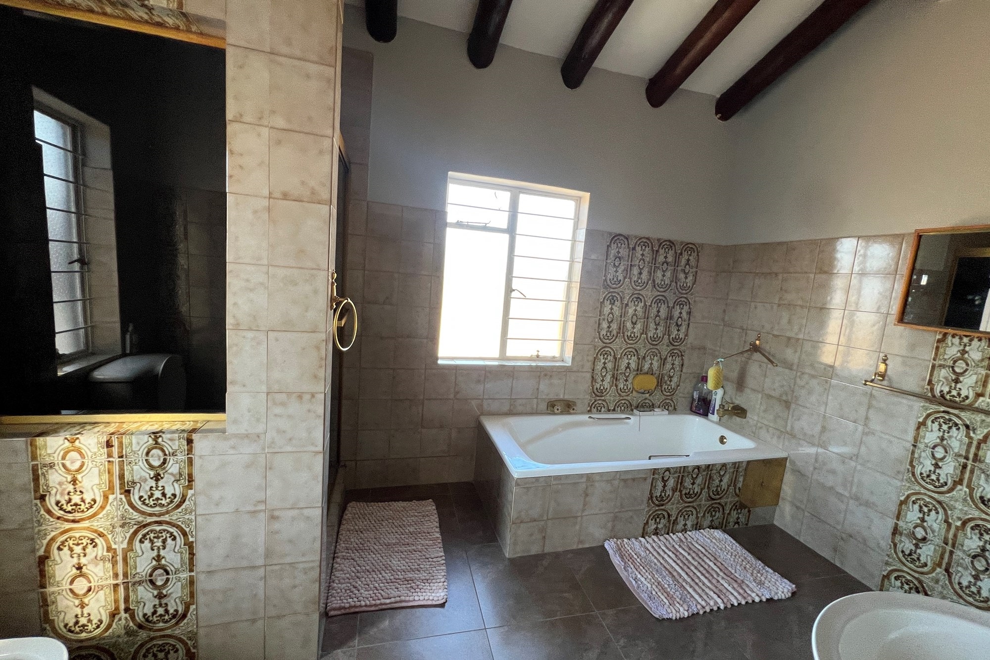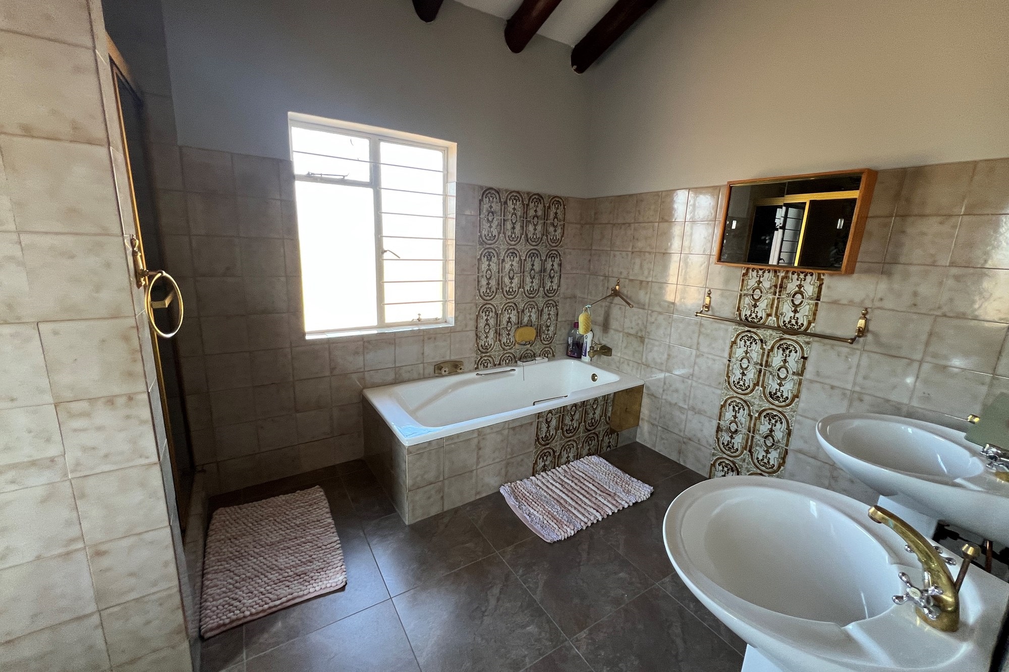 The home boasts five (5) spacious bedrooms, all with tiled flooring and built-in cupboards. The main bedroom is a standout, featuring built-in cupboards, air conditioning, its own geyser, and a luxurious en-suite bathroom complete with double basins, a bathtub, shower, and toilet — all finished with sleek tiling. The remaining four bedrooms share two additional full bathrooms, both tiled and equipped with a bathtub, basin, and toilet. A built-in linen cupboard adds convenient storage to the central hallway.