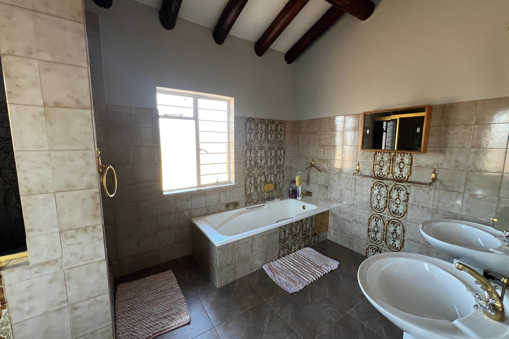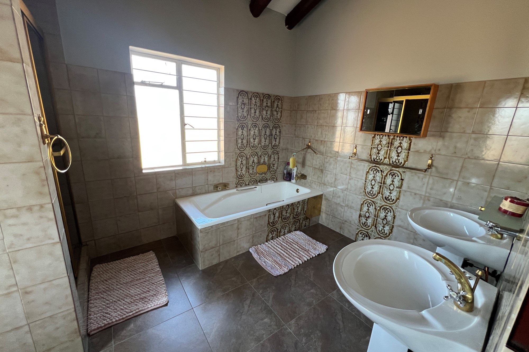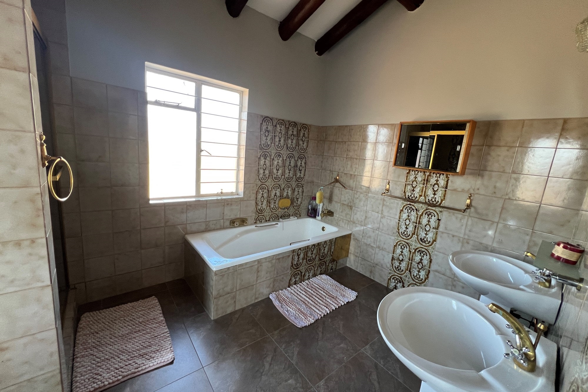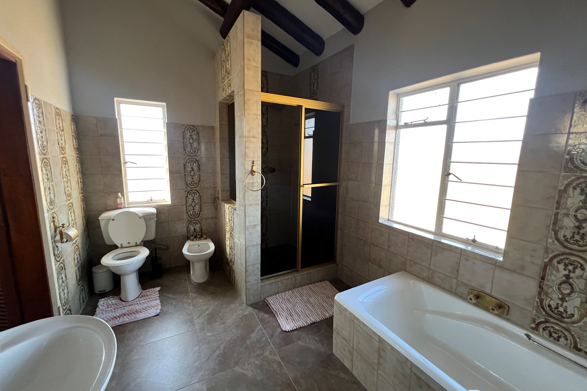 The home boasts five (5) spacious bedrooms, all with tiled flooring and built-in cupboards. The main bedroom is a standout, featuring built-in cupboards, air conditioning, its own geyser, and a luxurious en-suite bathroom complete with double basins, a bathtub, shower, and toilet — all finished with sleek tiling. The remaining four bedrooms share two additional full bathrooms, both tiled and equipped with a bathtub, basin, and toilet. A built-in linen cupboard adds convenient storage to the central hallway.