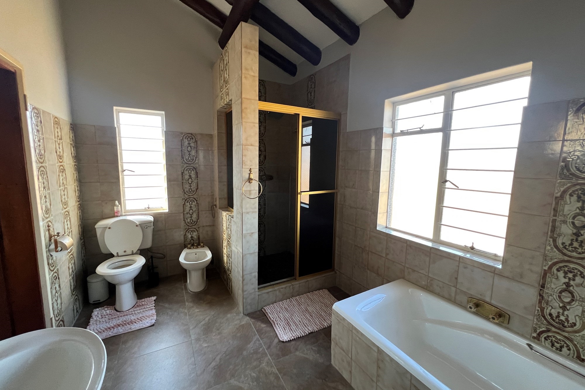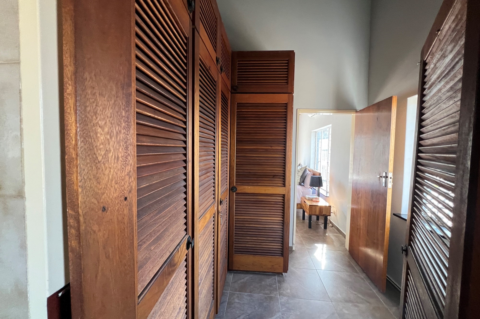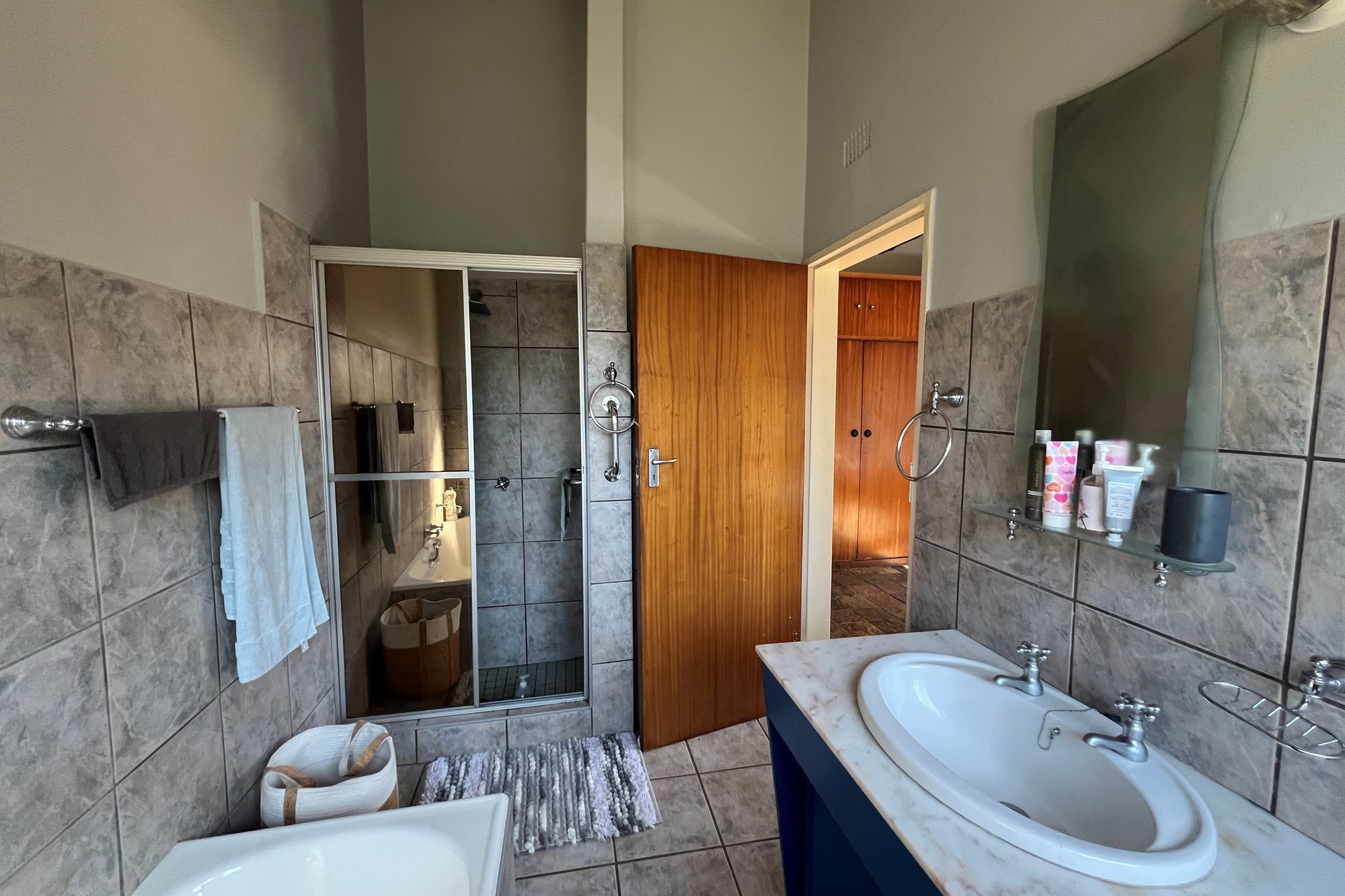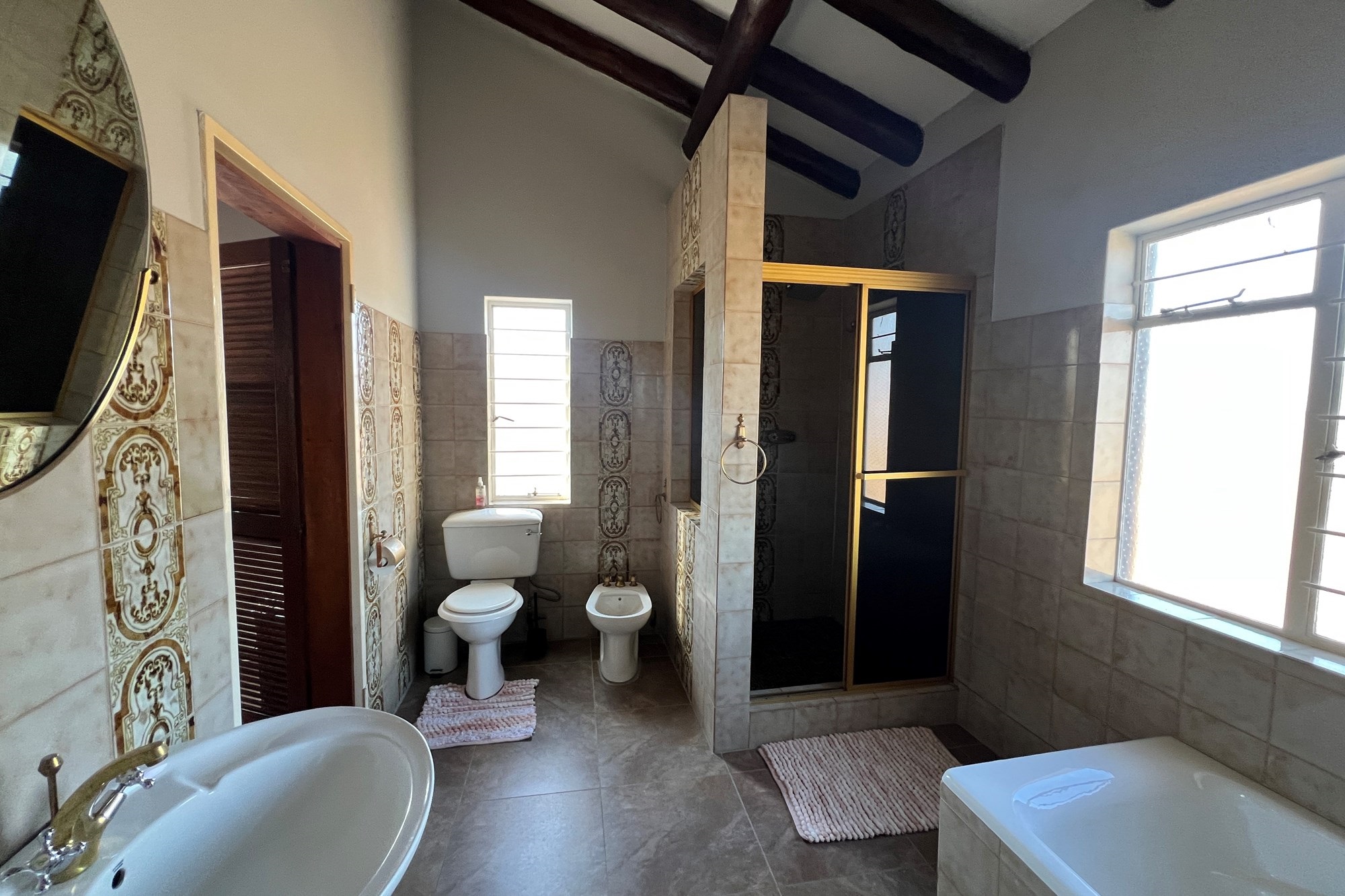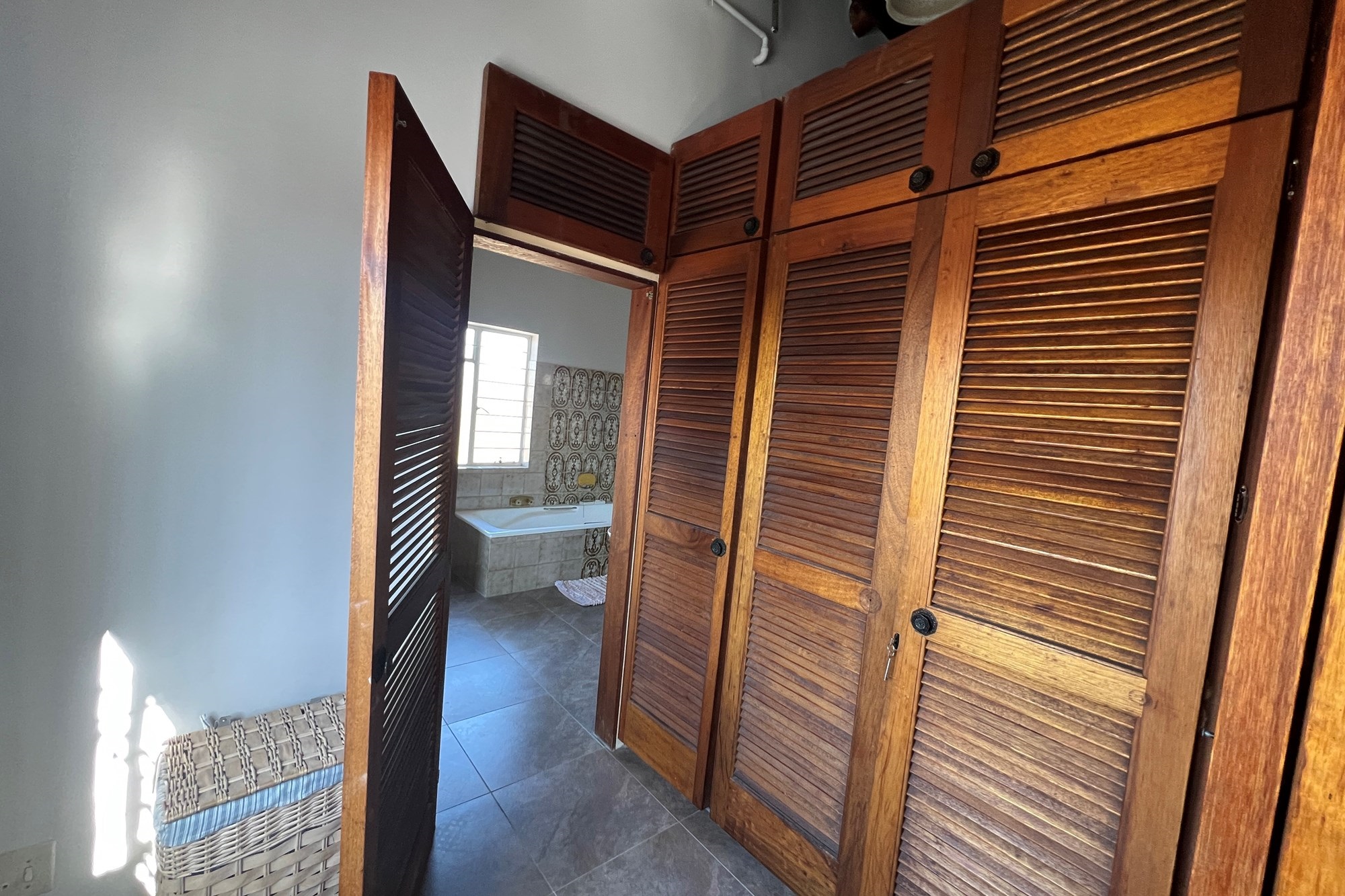 The home boasts five (5) spacious bedrooms, all with tiled flooring and built-in cupboards. The main bedroom is a standout, featuring built-in cupboards, air conditioning, its own geyser, and a luxurious en-suite bathroom complete with double basins, a bathtub, shower, and toilet — all finished with sleek tiling. The remaining four bedrooms share two additional full bathrooms, both tiled and equipped with a bathtub, basin, and toilet. A built-in linen cupboard adds convenient storage to the central hallway.
