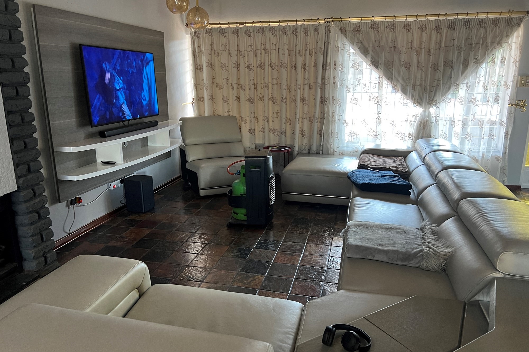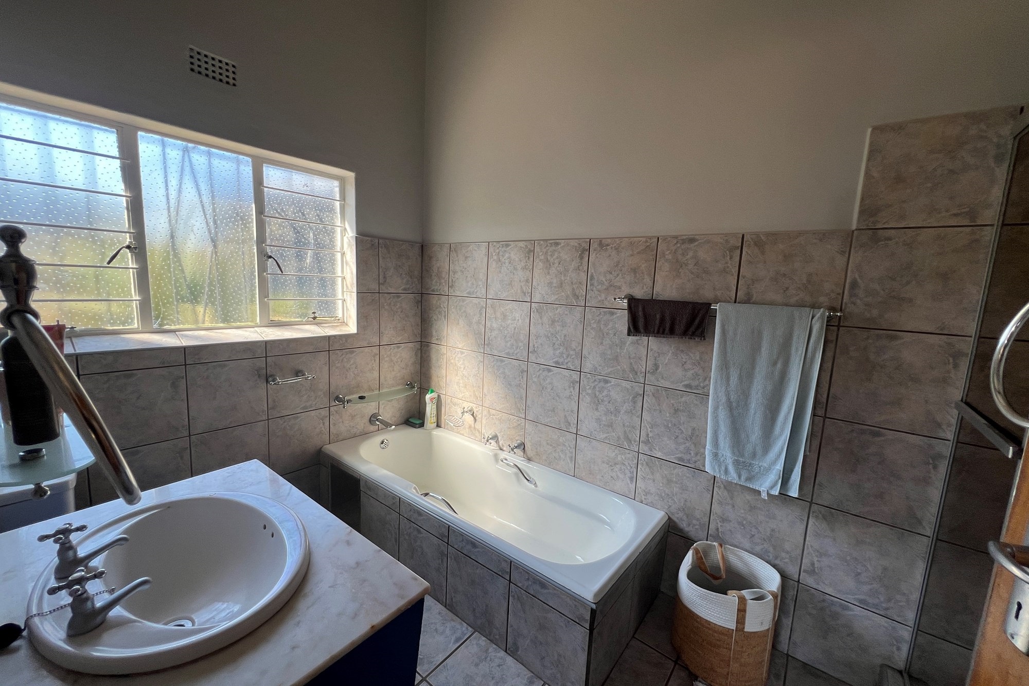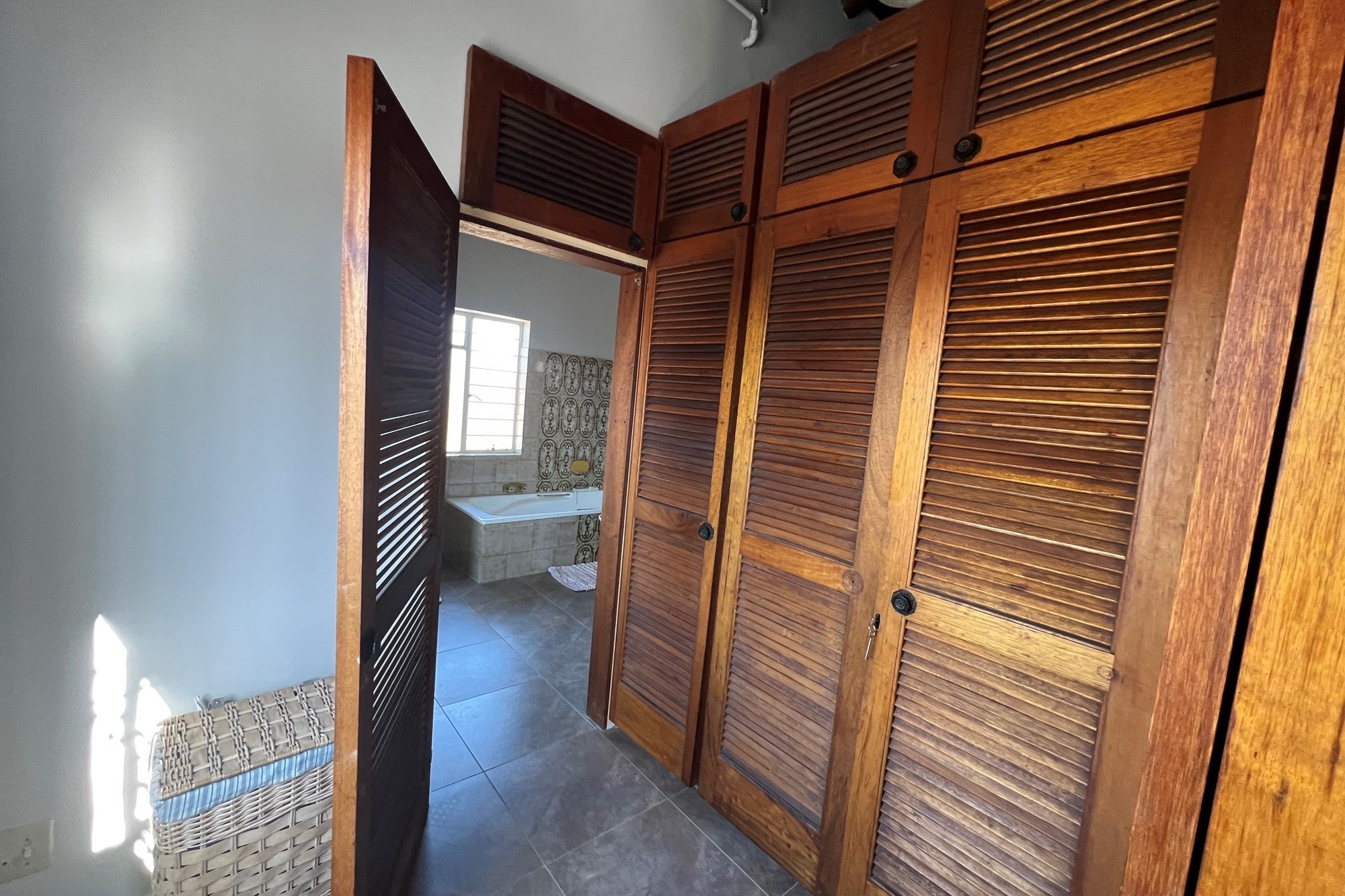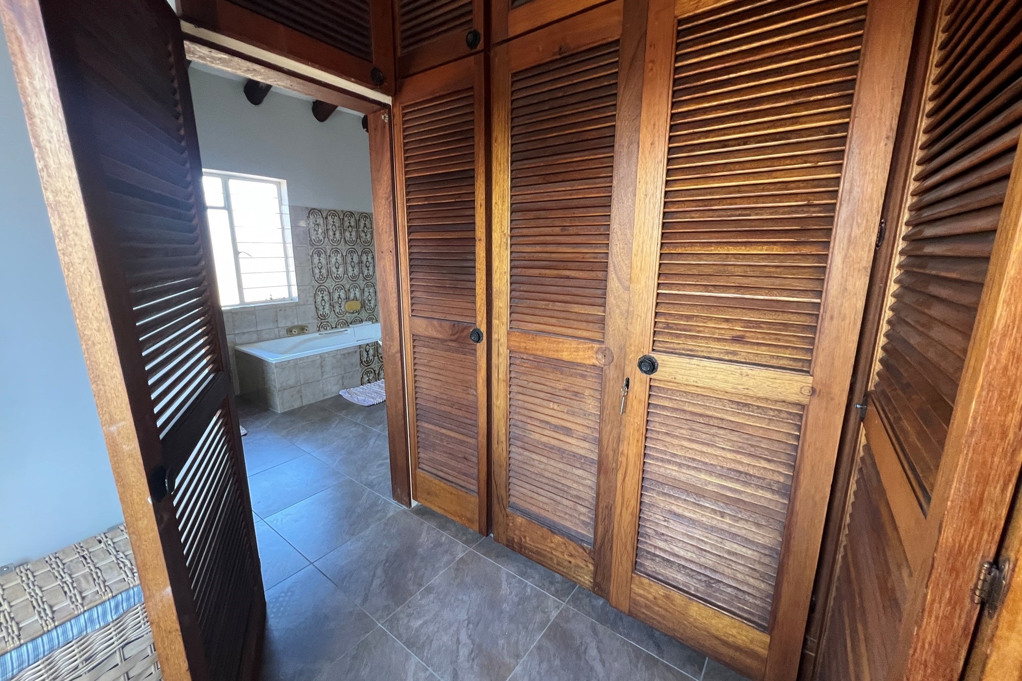 The home boasts five (5) spacious bedrooms, all with tiled flooring and built-in cupboards. The main bedroom is a standout, featuring built-in cupboards, air conditioning, its own geyser, and a luxurious en-suite bathroom complete with double basins, a bathtub, shower, and toilet — all finished with sleek tiling. The remaining four bedrooms share two additional full bathrooms, both tiled and equipped with a bathtub, basin, and toilet. A built-in linen cupboard adds convenient storage to the central hallway.