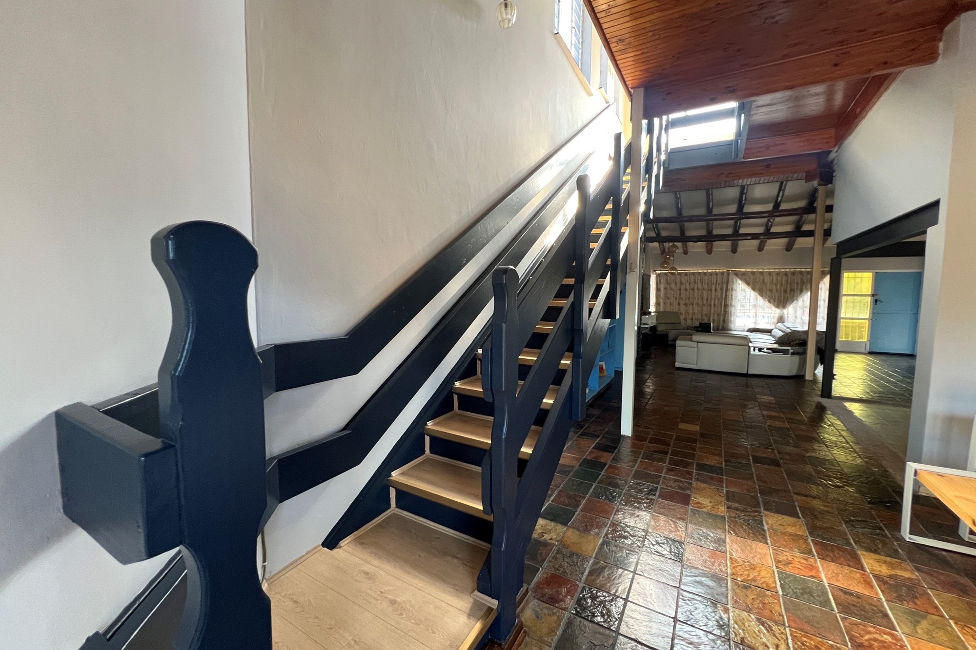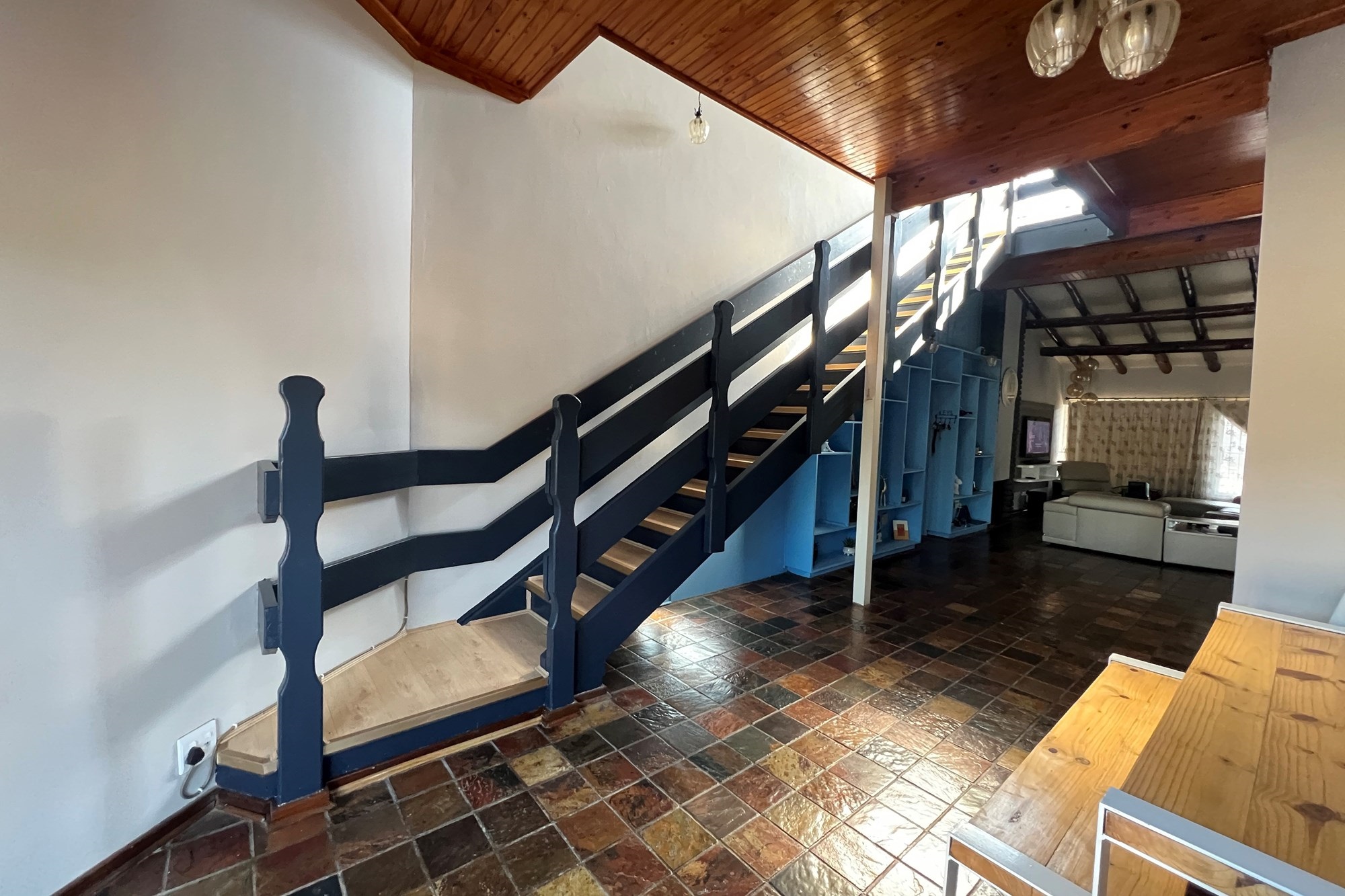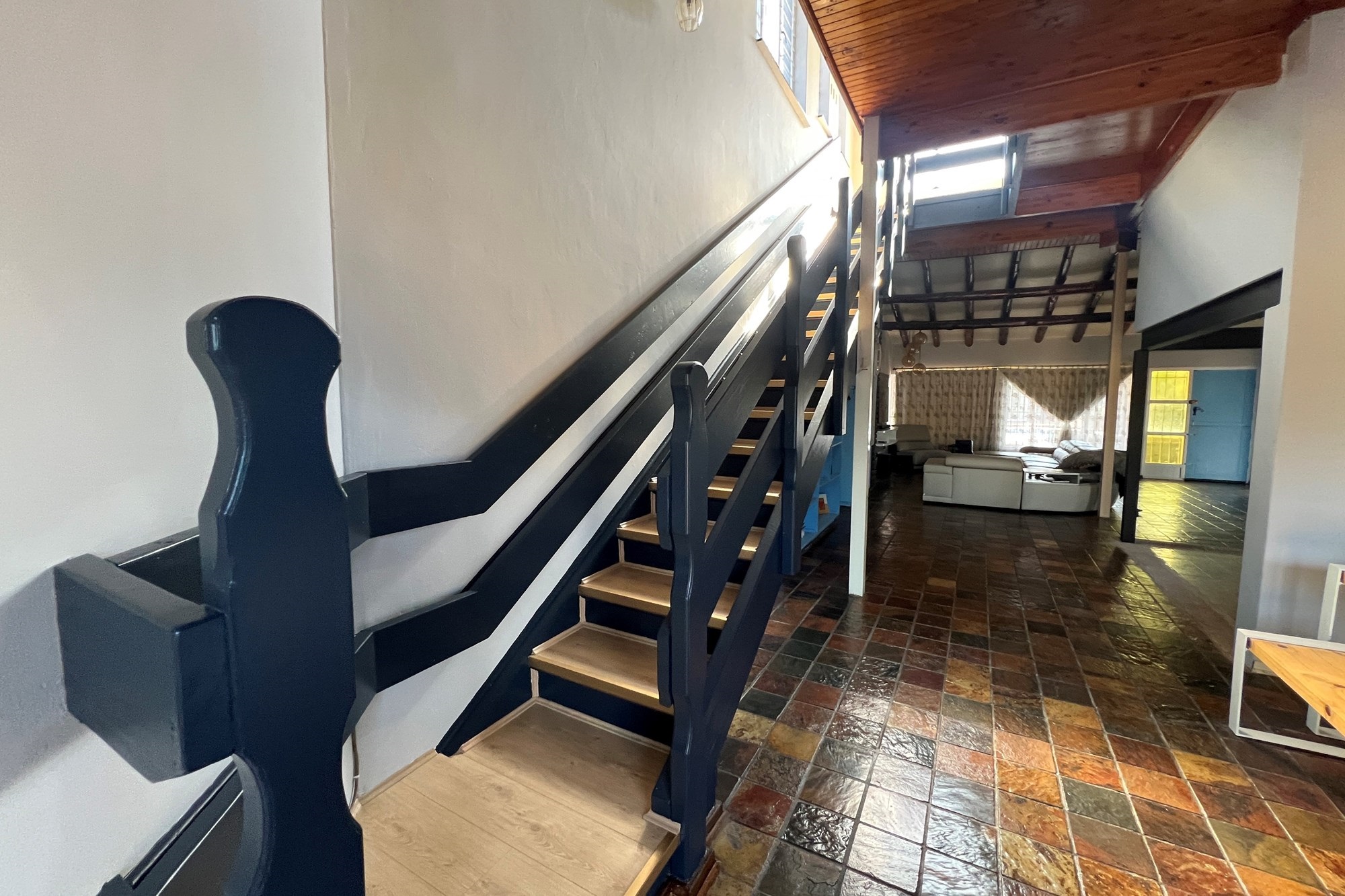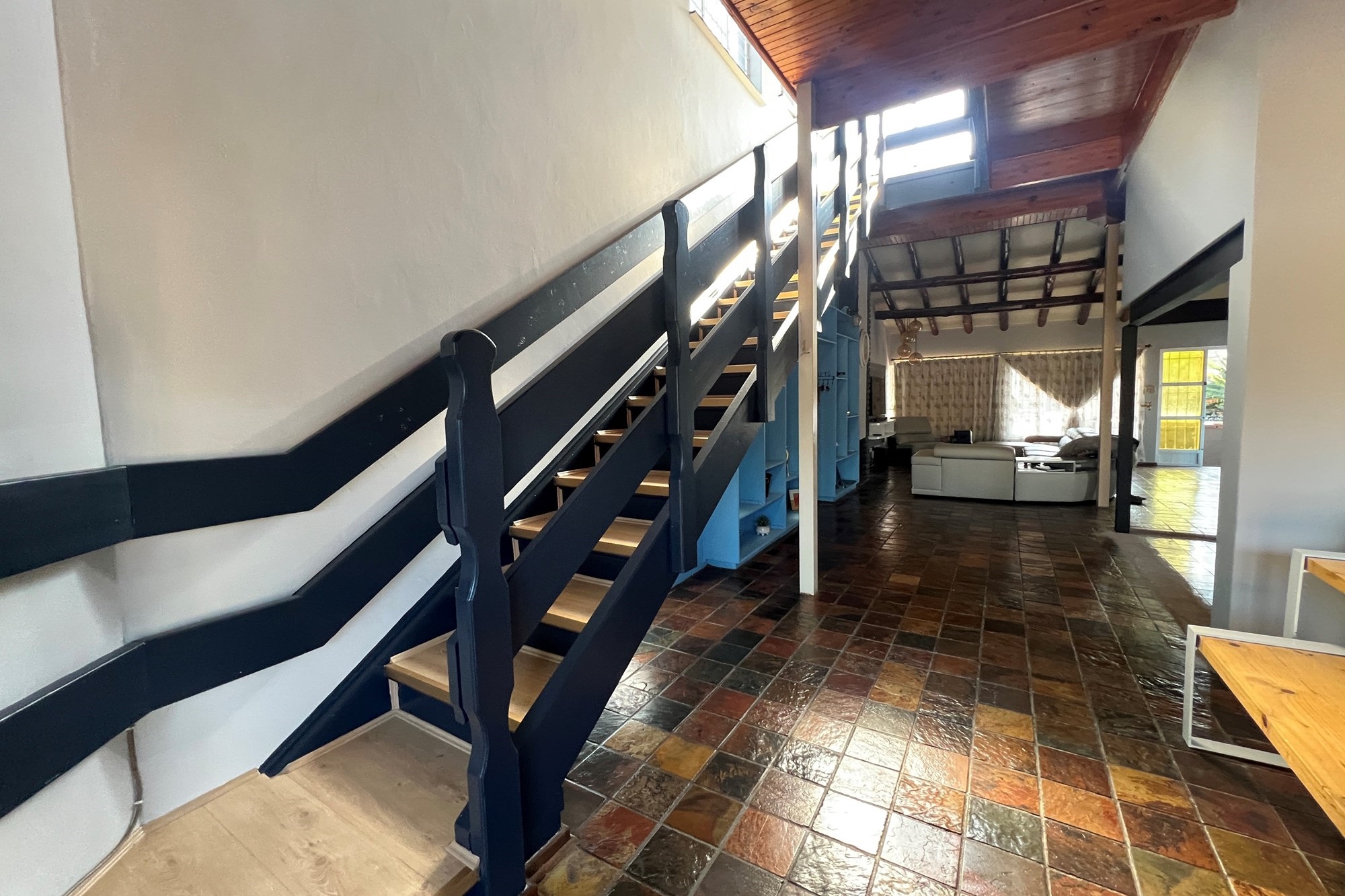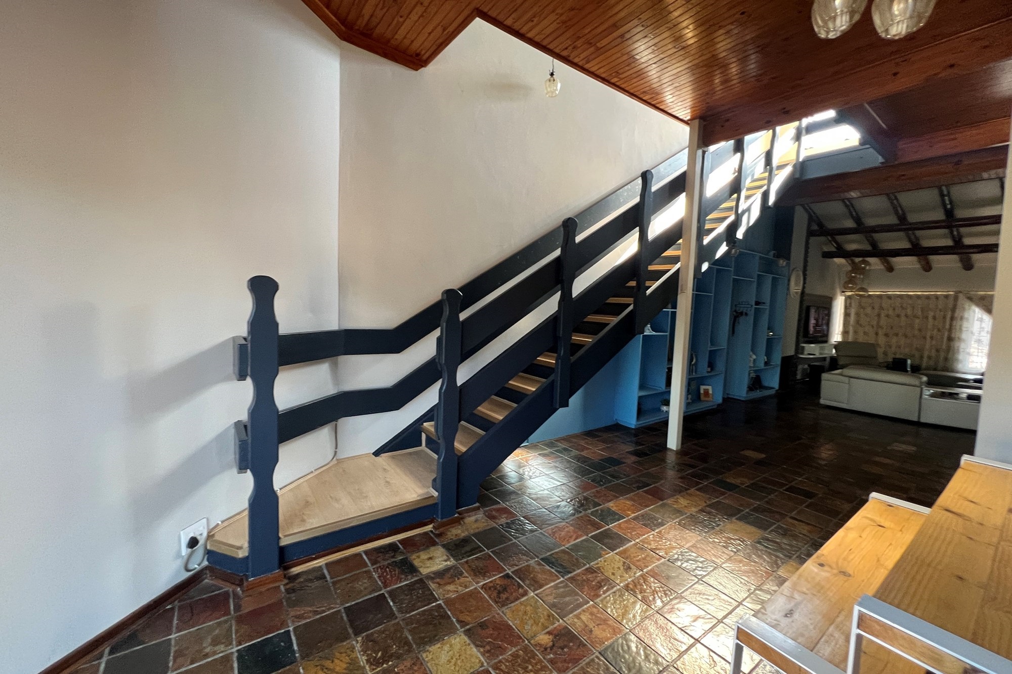 A beautiful wooden staircase leads to an upper level with wooden flooring, adding warmth and character to the home. The property also features a double automated garage for secure parking and a dedicated geyser serving the main house.