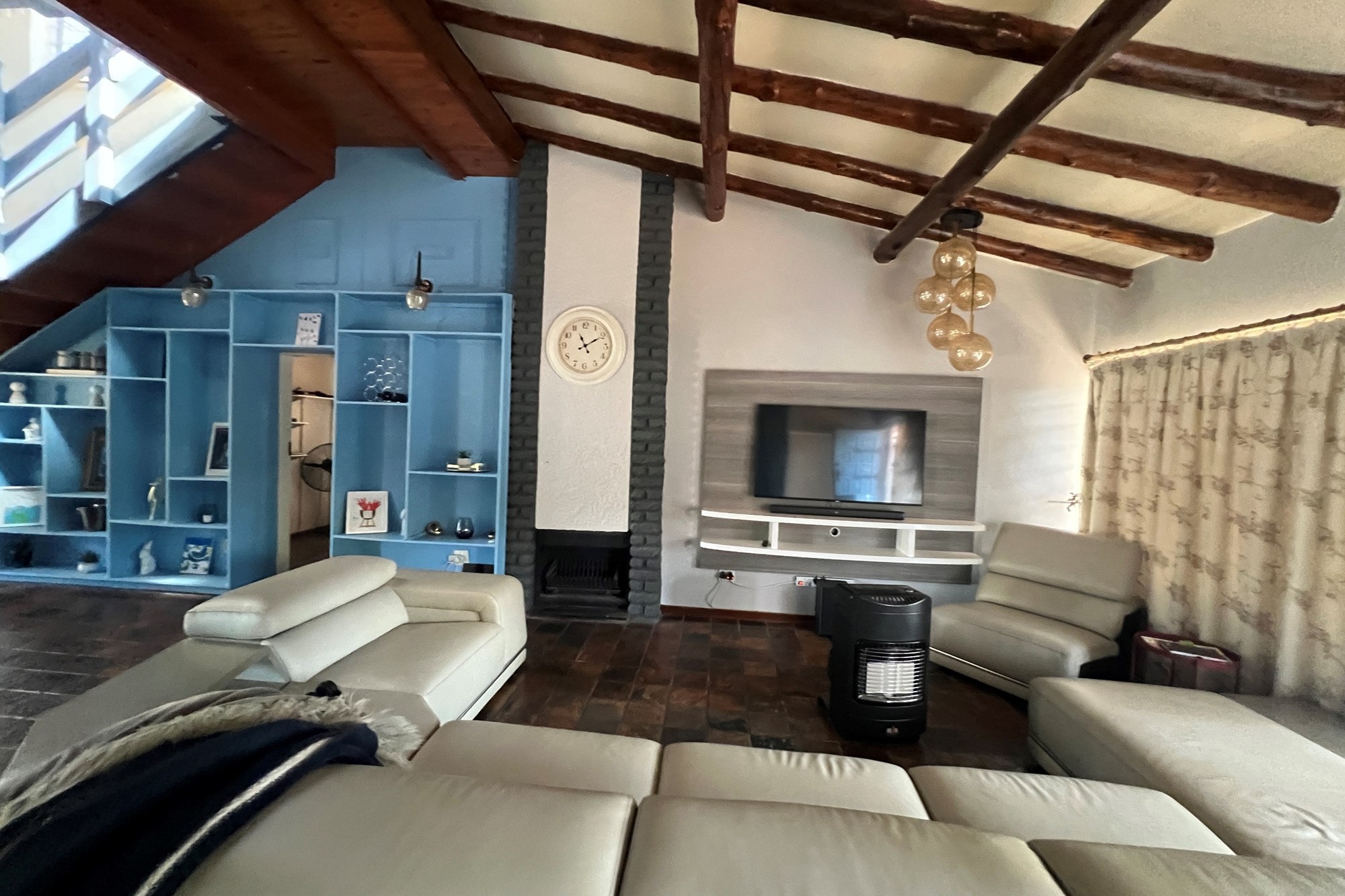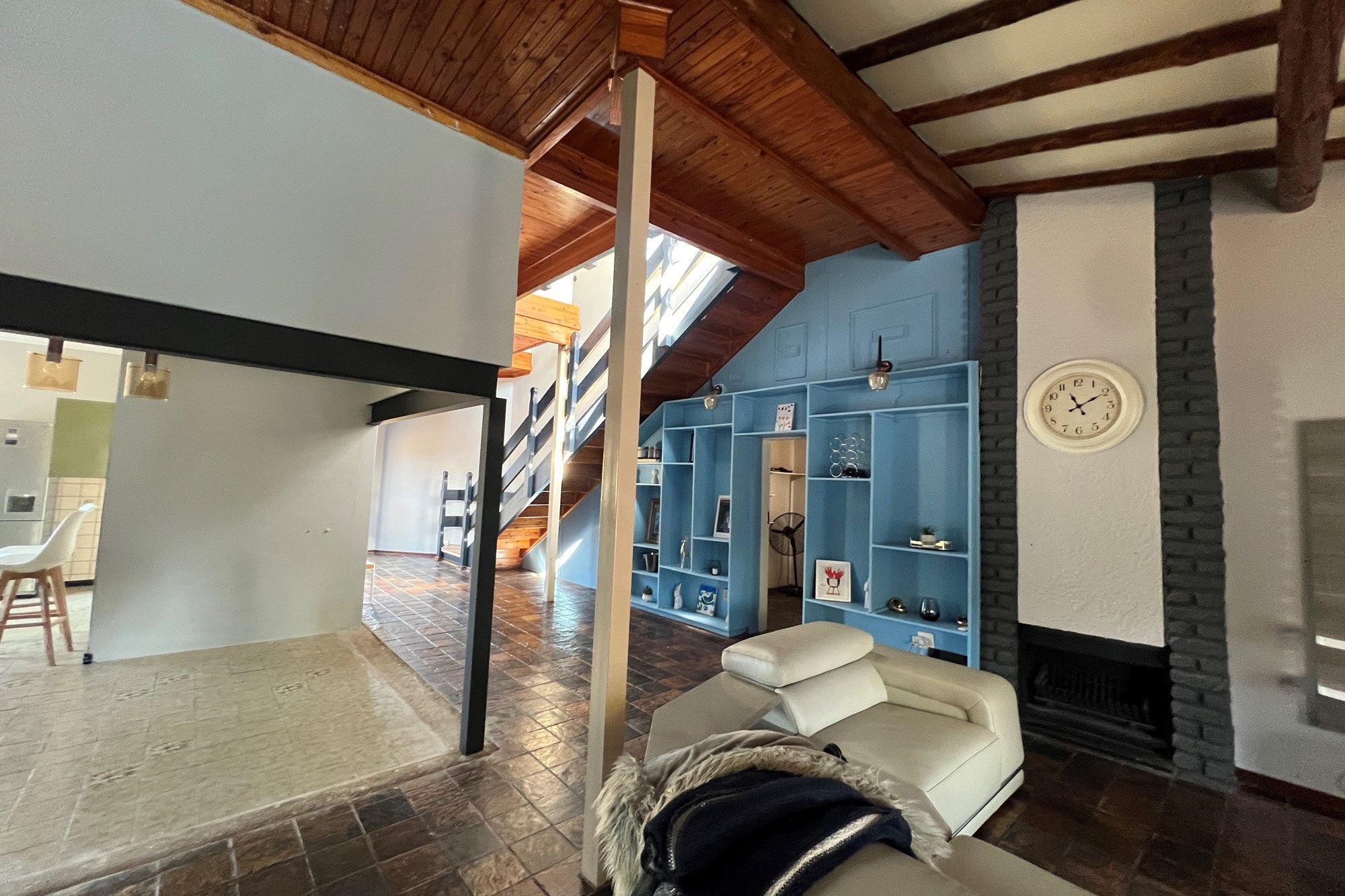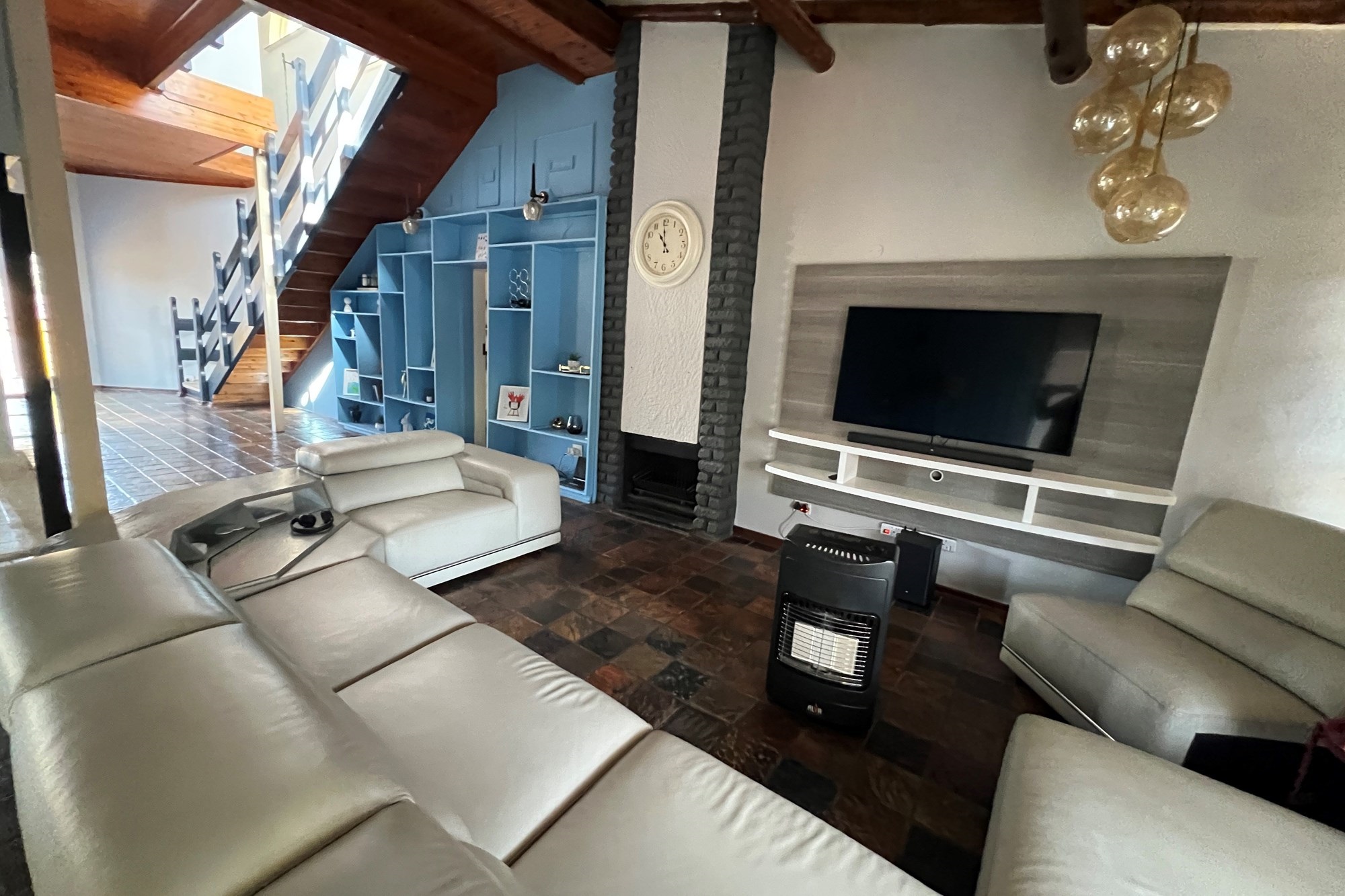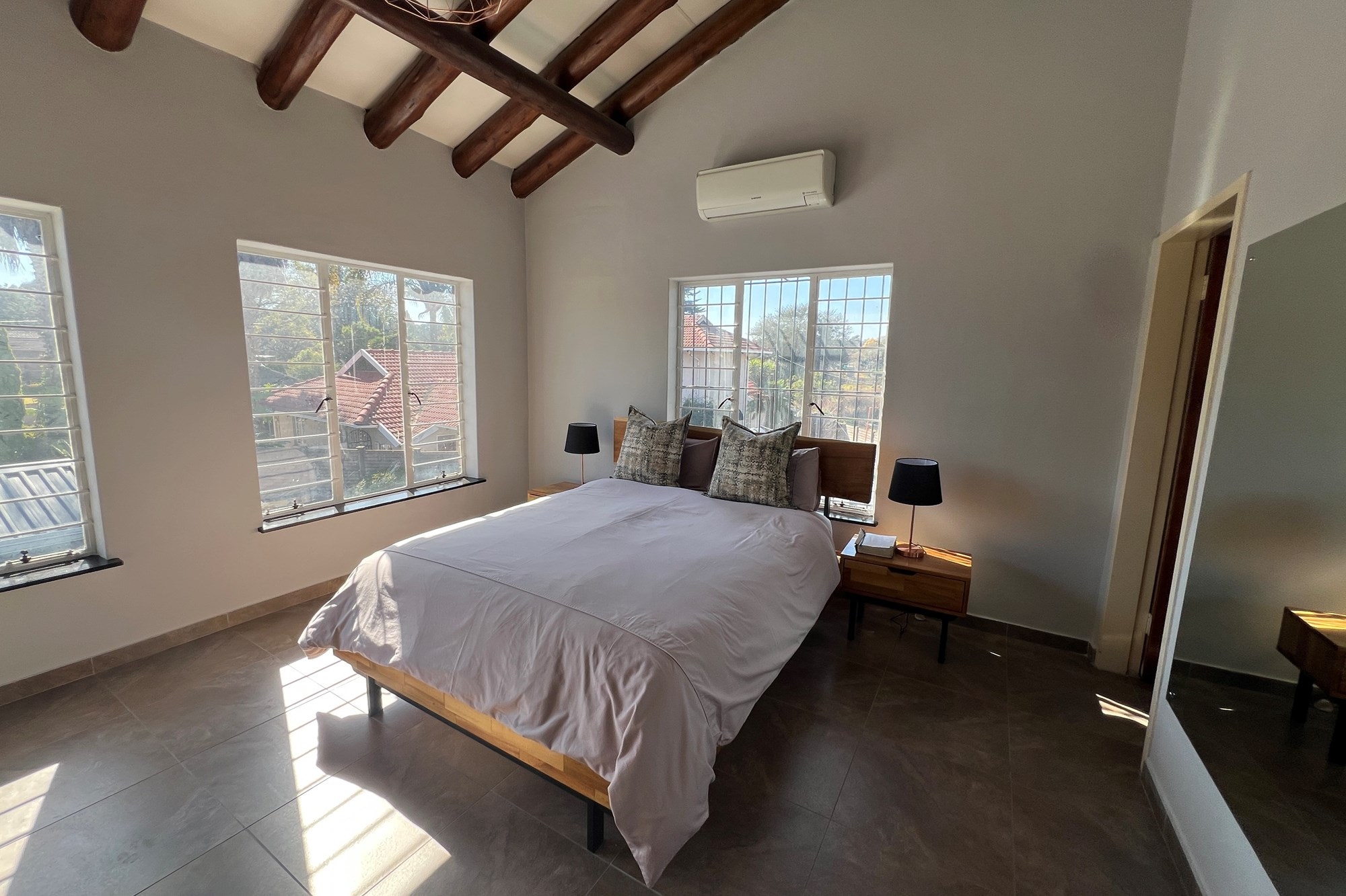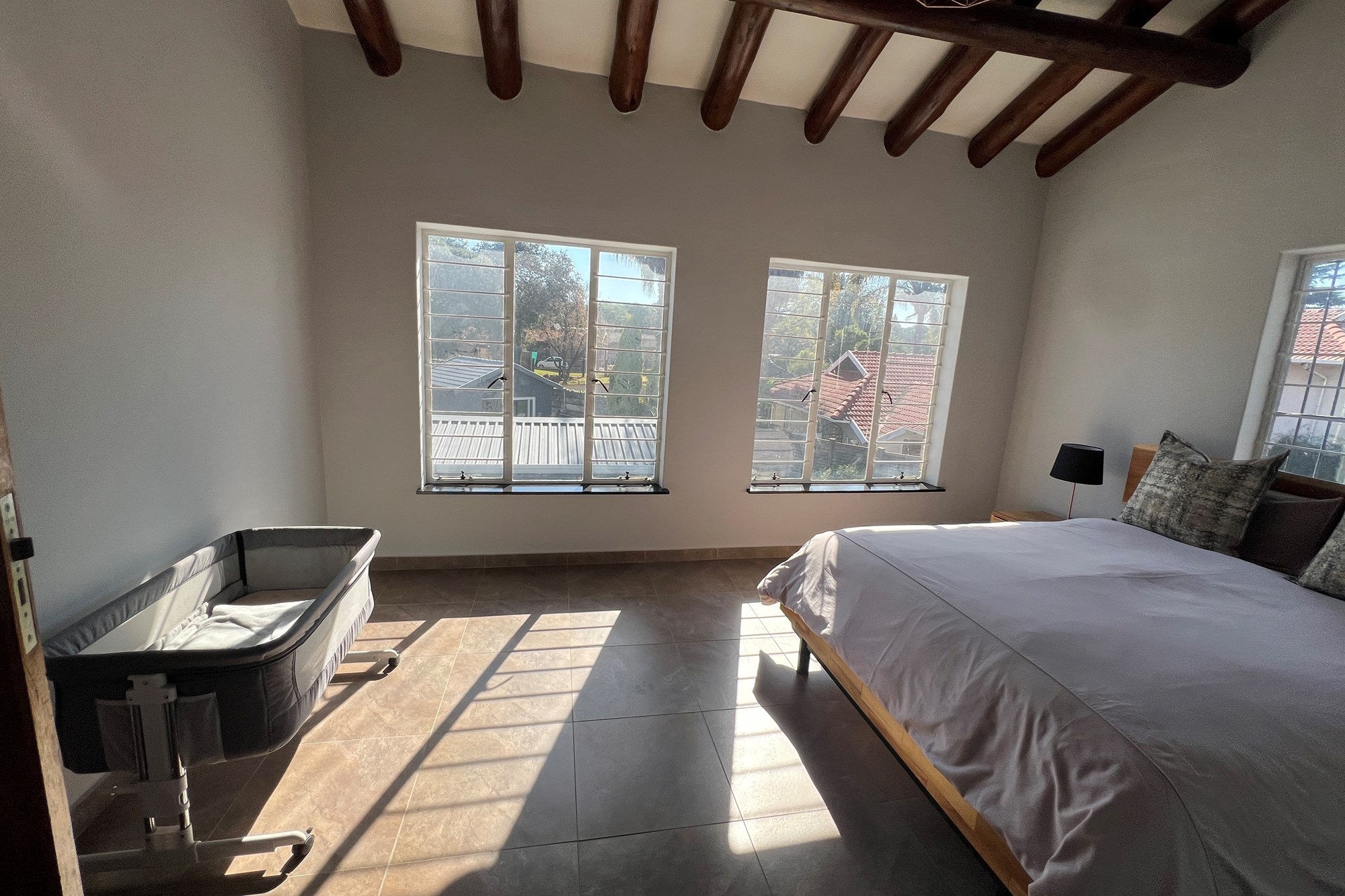 A beautiful wooden staircase leads to an upper level with wooden flooring, adding warmth and character to the home. The property also features a double automated garage for secure parking and a dedicated geyser serving the main house.