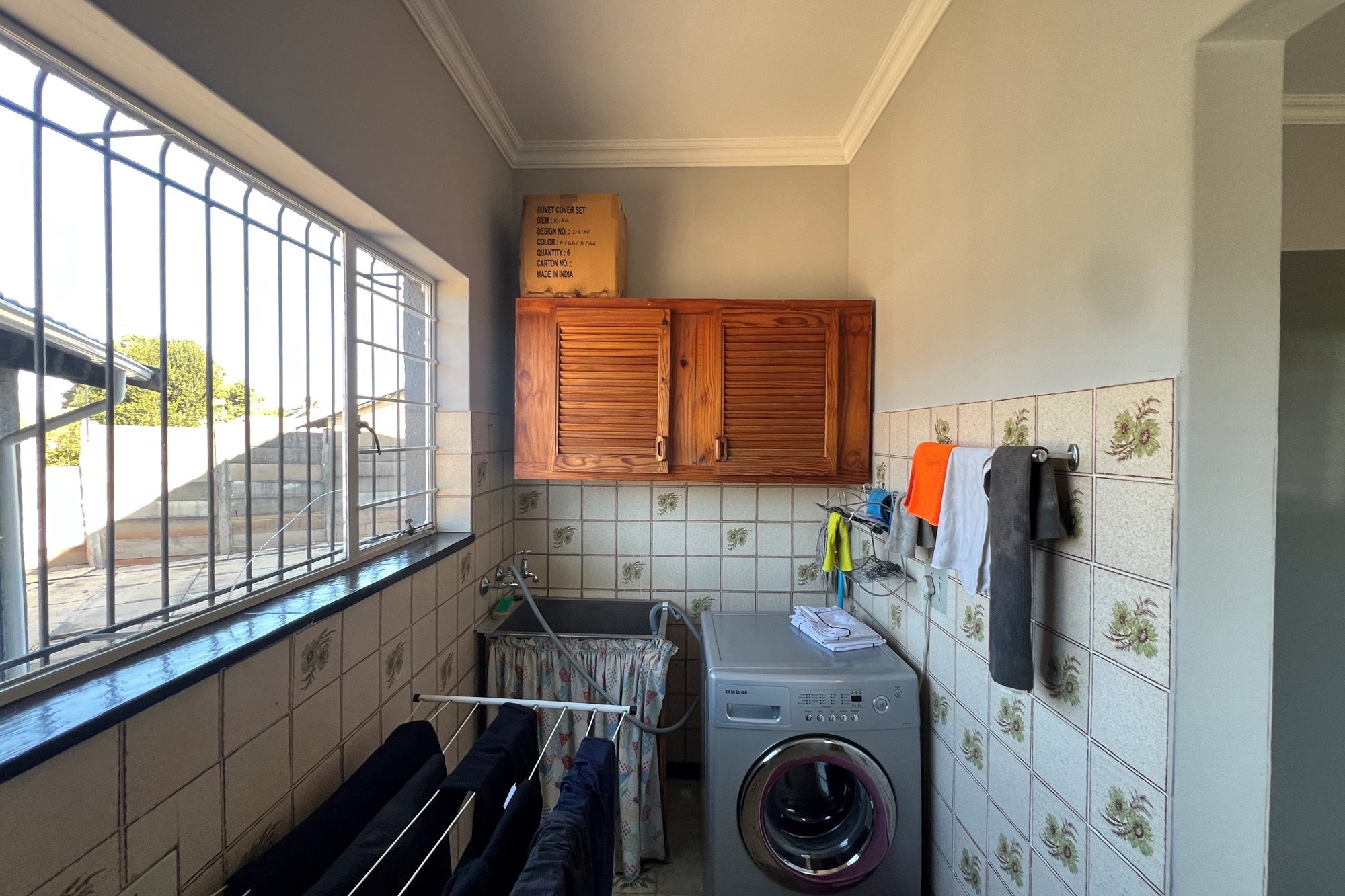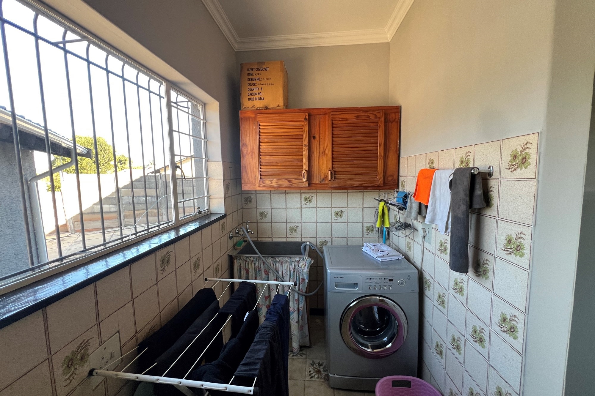 The heart of the home is the open-plan living area, which includes a tiled lounge with a cozy fireplace and a well-equipped kitchen. The kitchen features steel built-in cupboards, a double sink, hob, oven, and extractor fan, making it functional and family-friendly. Adjacent to the living space is a tiled dining room with ceiling detail, creating a welcoming space for shared meals and gatherings. A separate laundry area with its own sink and storage completes the interior utility spaces.