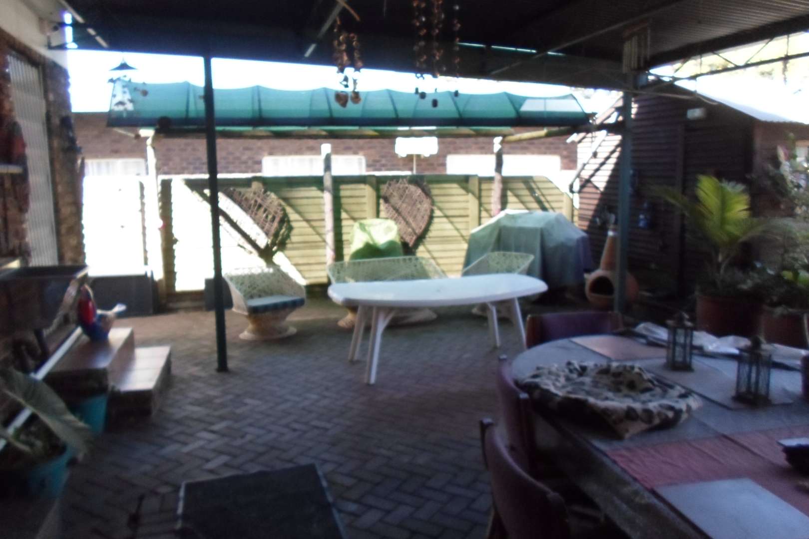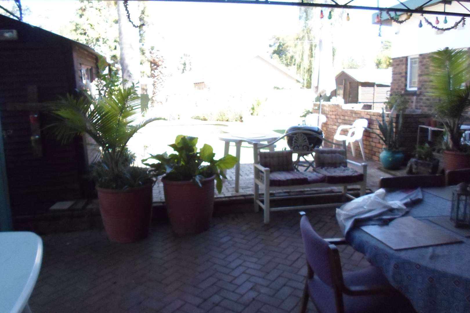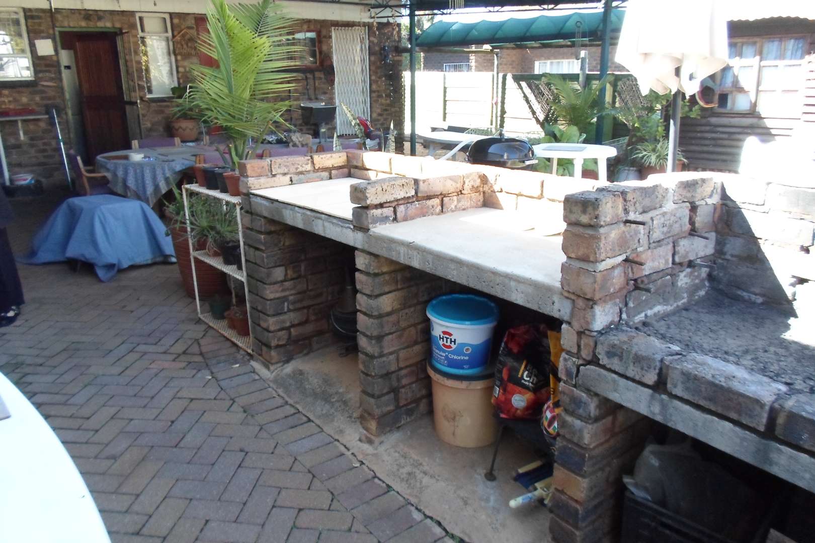 A large, covered patio/entertainment area with a built-in braai. From the entertainment area access to a beautiful, decorated pool.