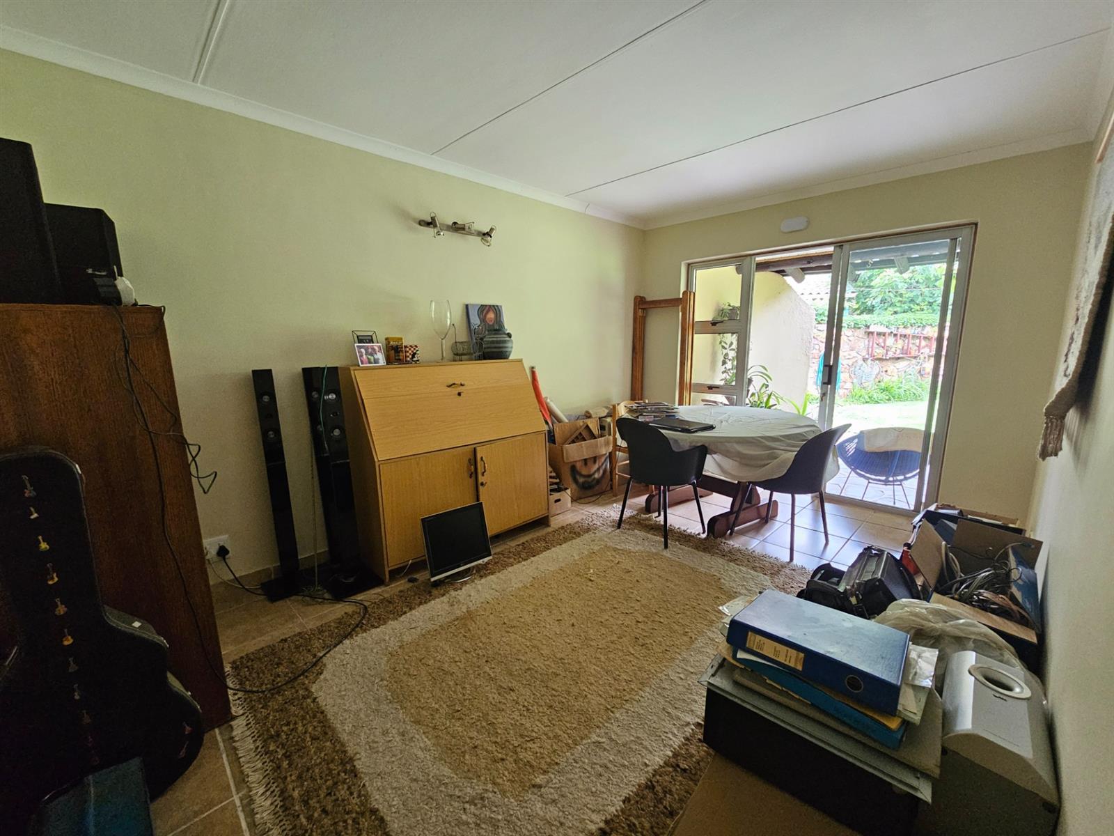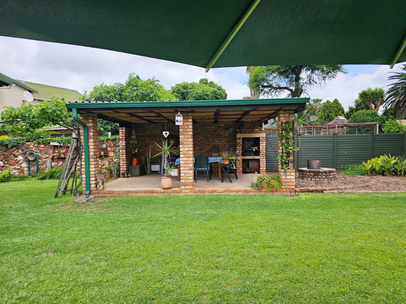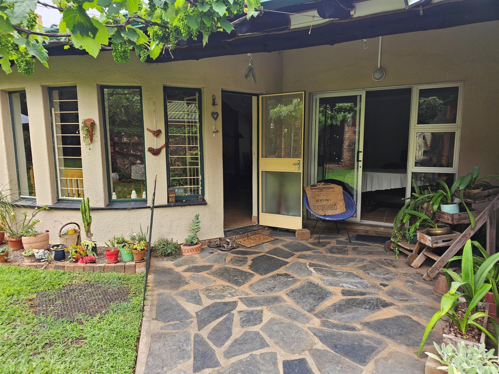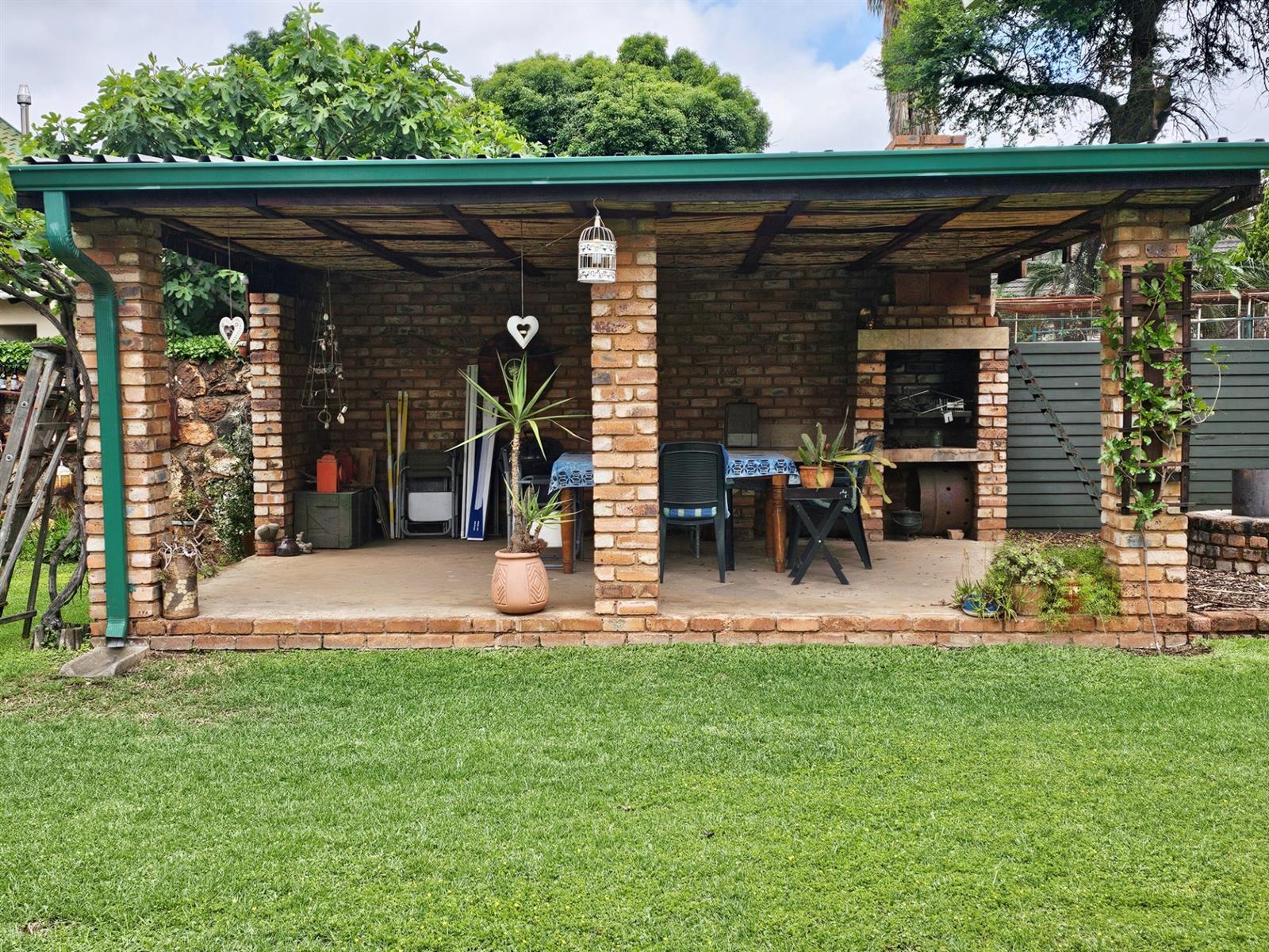 Off to the side, there’s a versatile room that works beautifully as a guest bedroom or home office. A second living area/ or an alternative as an office, spills out through sliding doors into a lush, tree-filled garden — the kind of garden that’s clearly been tended with pride, complete with mature trees, grapevines, a chicken coop , and a veggie patch tucked behind the fence. A big attraction here is also the entertainment area - spacious, open sided, zinc roof with a reed ceiling, provinding insulation, a built - in braai and a boma - setting the scene for memorable evenings with friends and family.