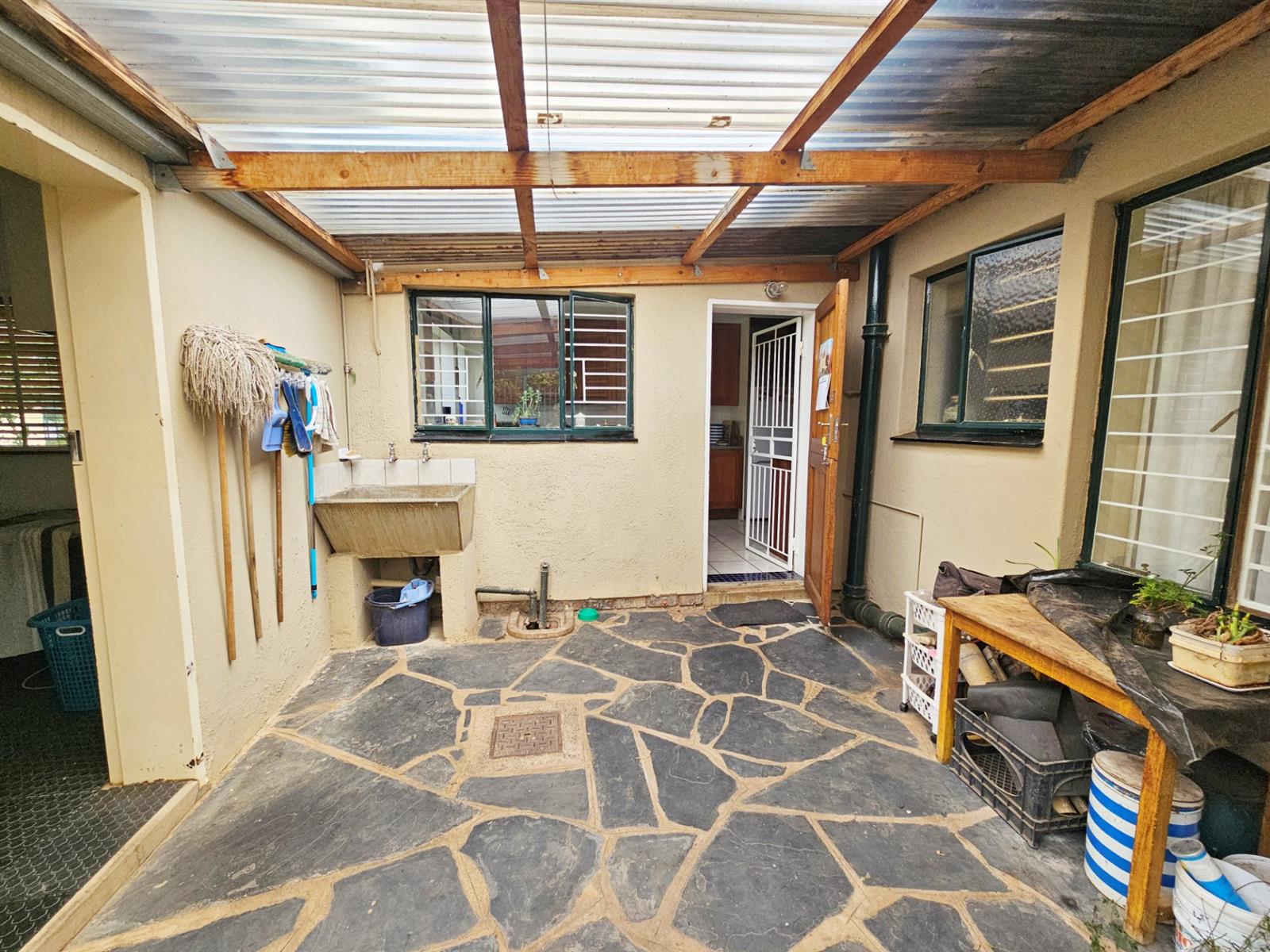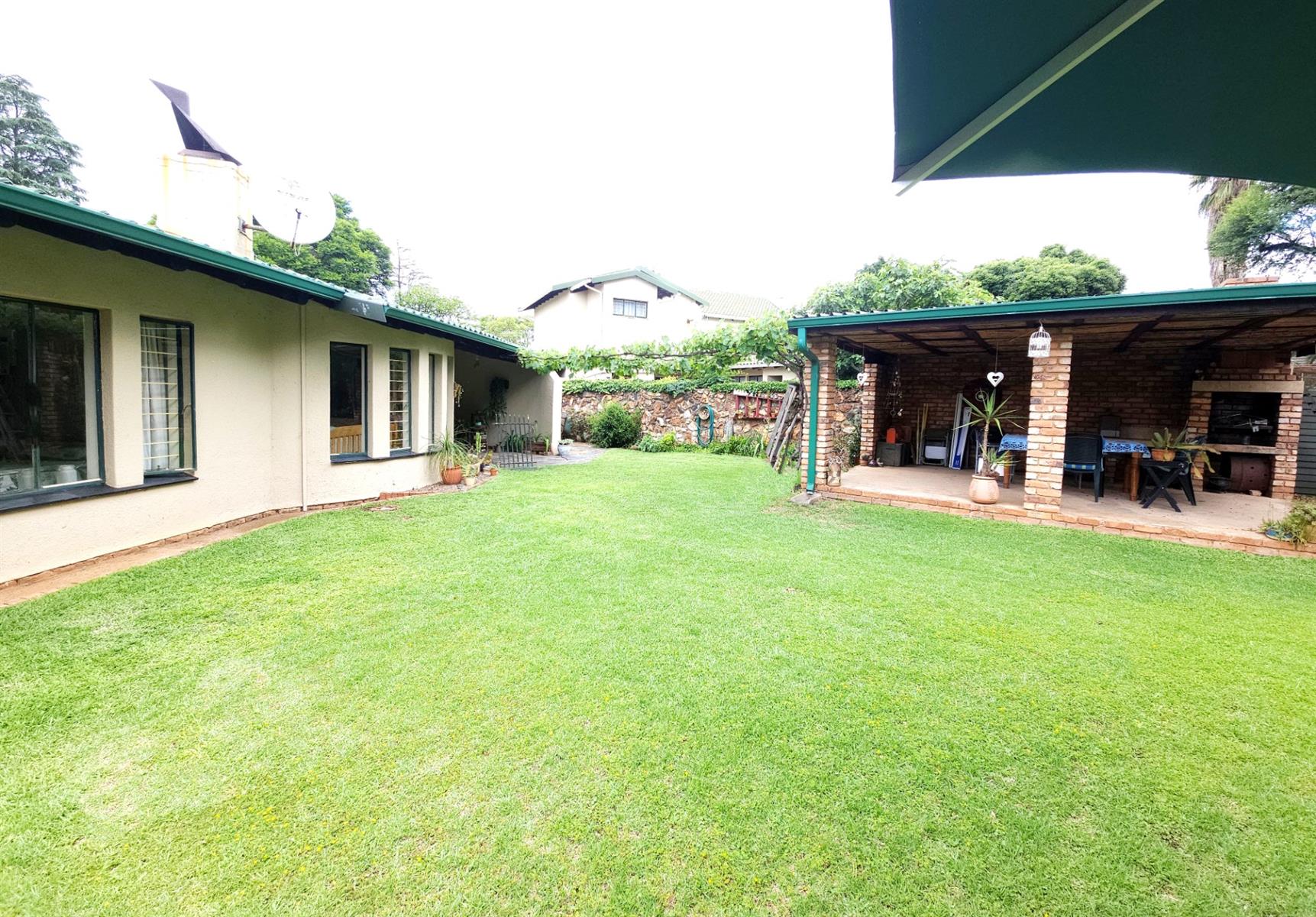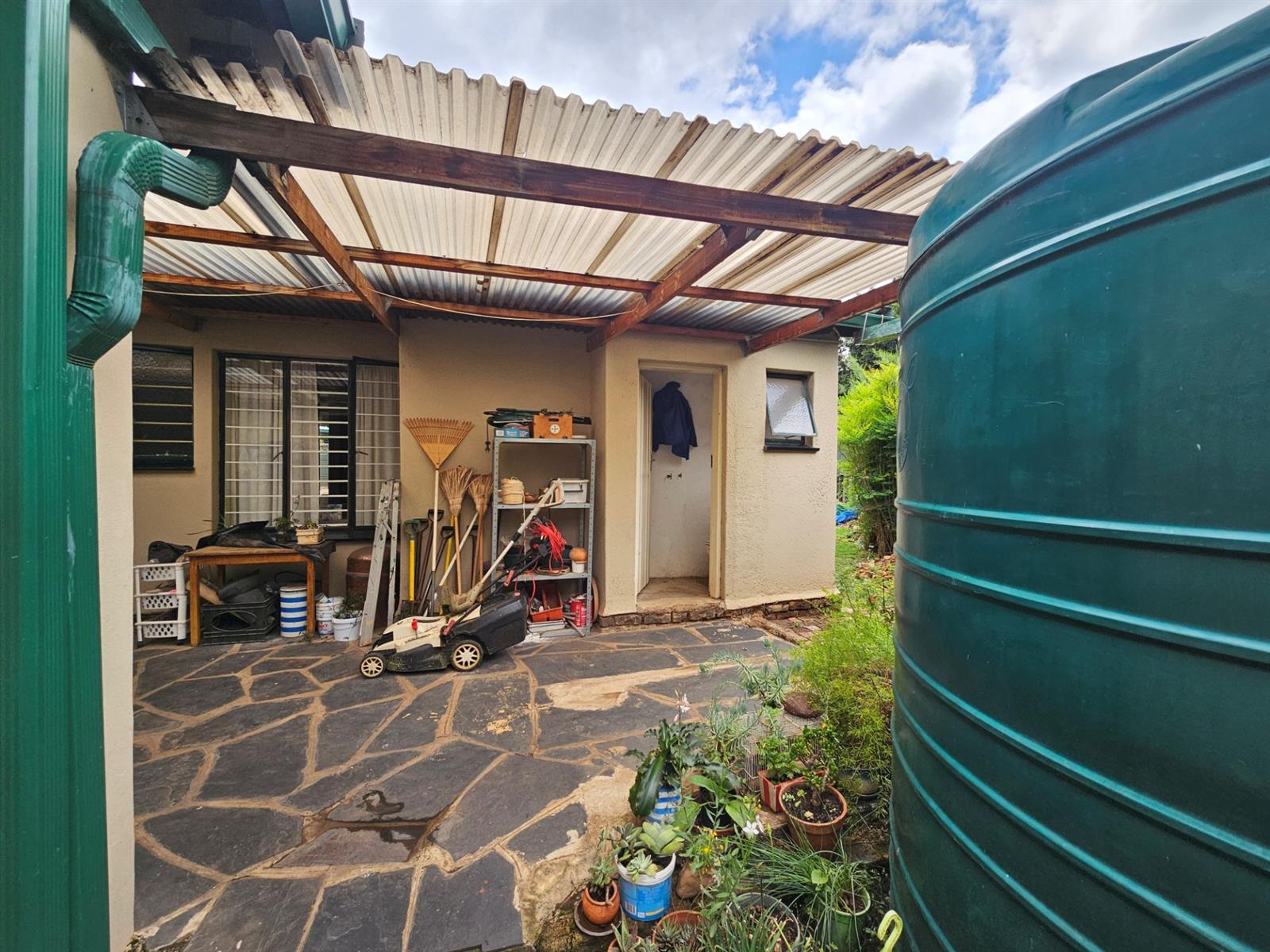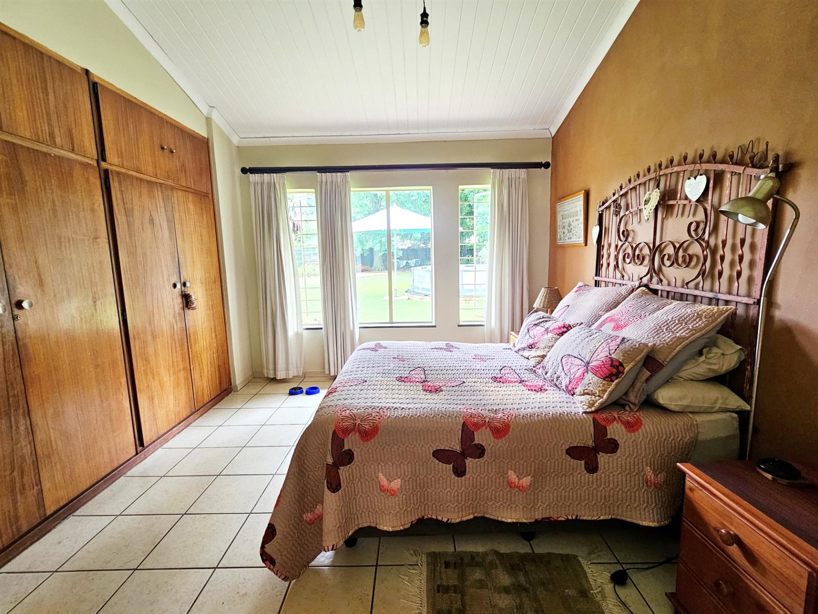 Off to the side, there’s a versatile room that works beautifully as a guest bedroom or home office. A second living area/ or an alternative as an office, spills out through sliding doors into a lush, tree-filled garden — the kind of garden that’s clearly been tended with pride, complete with mature trees, grapevines, a chicken coop , and a veggie patch tucked behind the fence. A big attraction here is also the entertainment area - spacious, open sided, zinc roof with a reed ceiling, provinding insulation, a built - in braai and a boma - setting the scene for memorable evenings with friends and family.