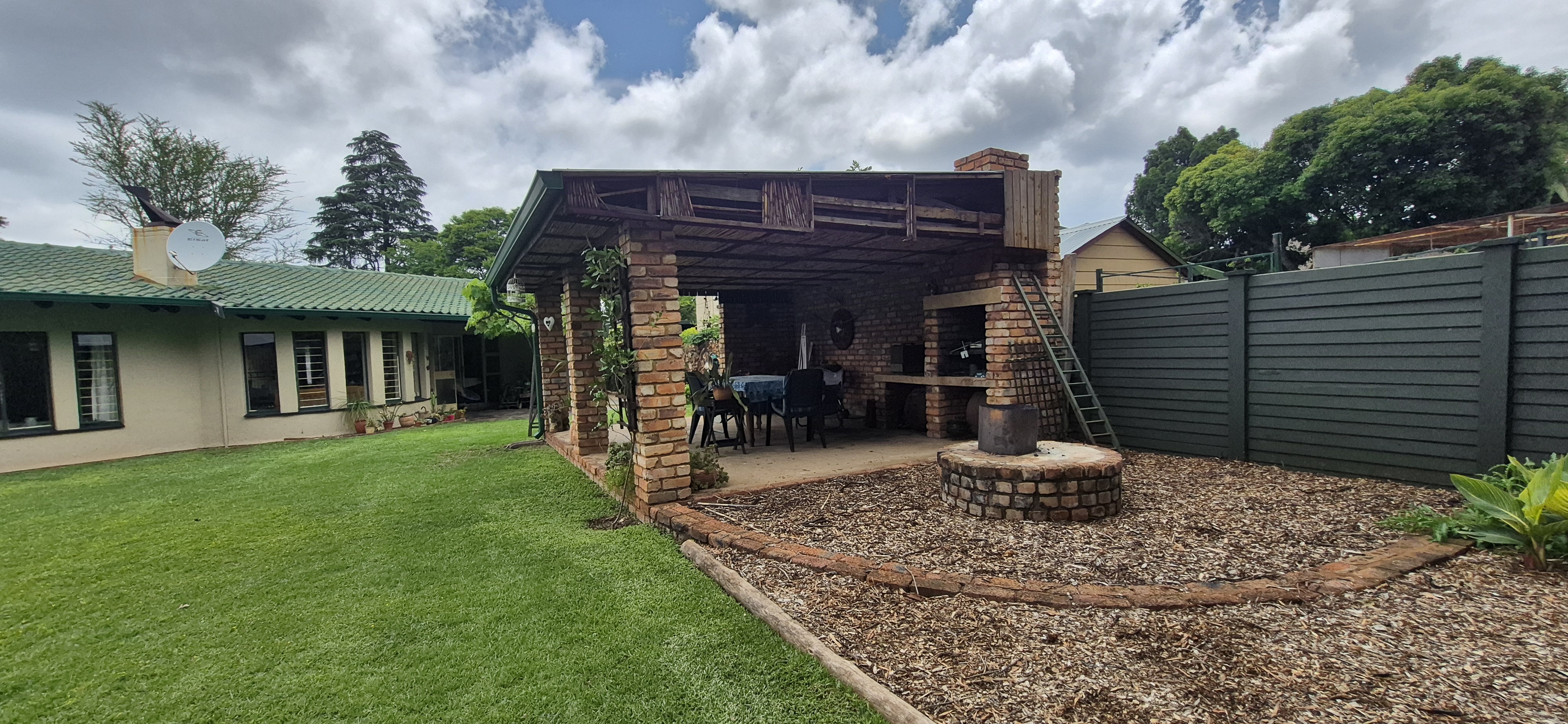 The backyard exudes a tranquil, farm-style charm with mature trees, a grape vineyard, lush green lawns, and a beautifully landscaped garden equipped with a sprinkler system. The covered entertainment area includes a built-in braai, complemented by a boma for additional outdoor enjoyment.