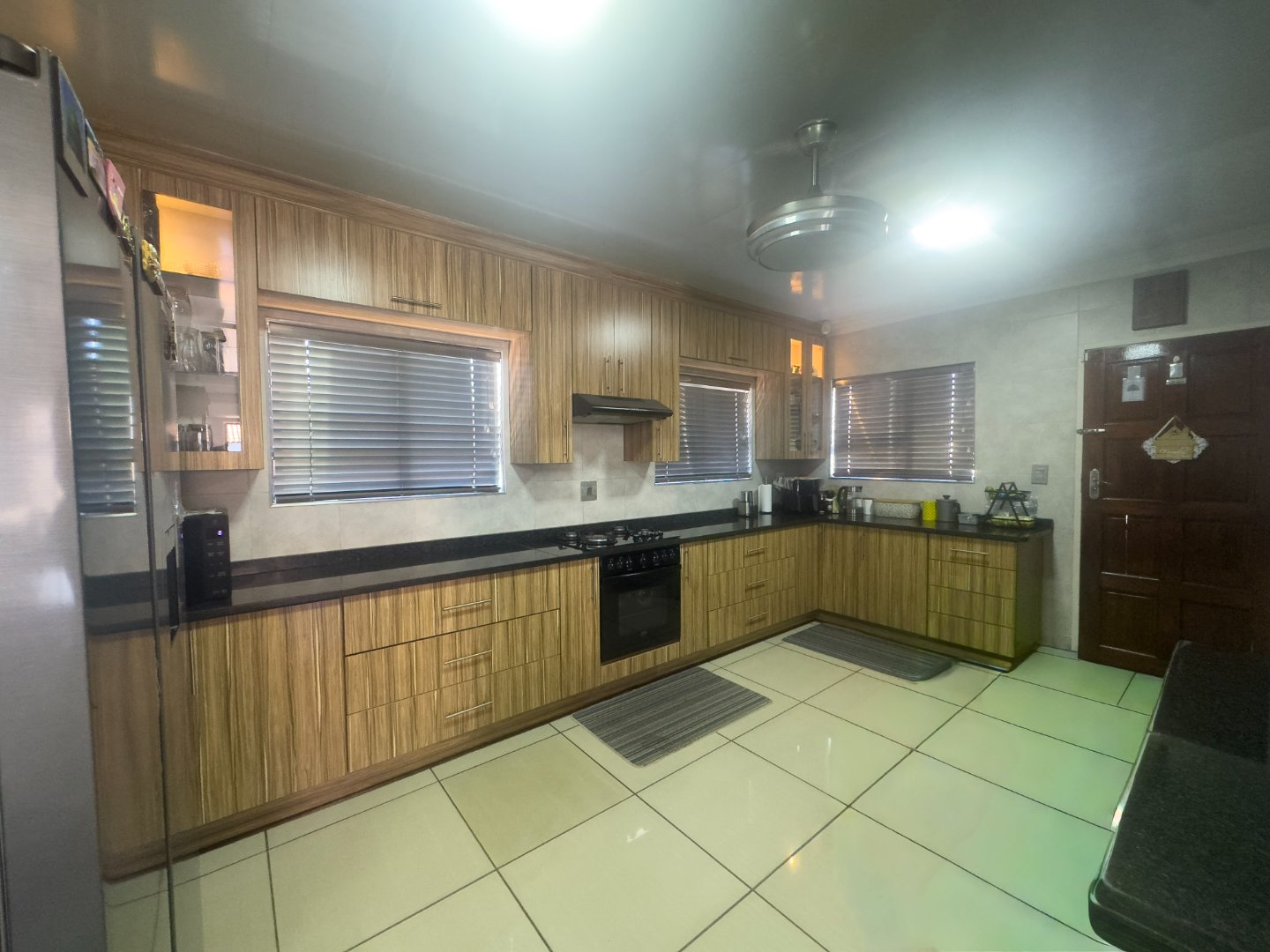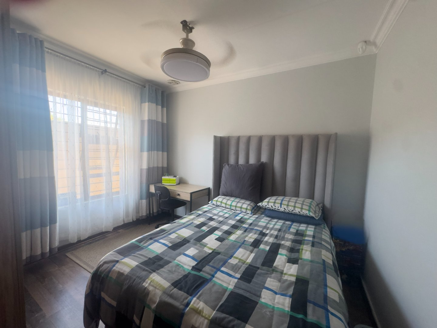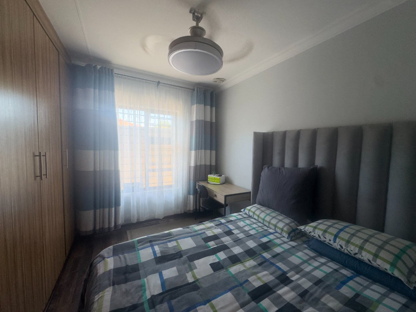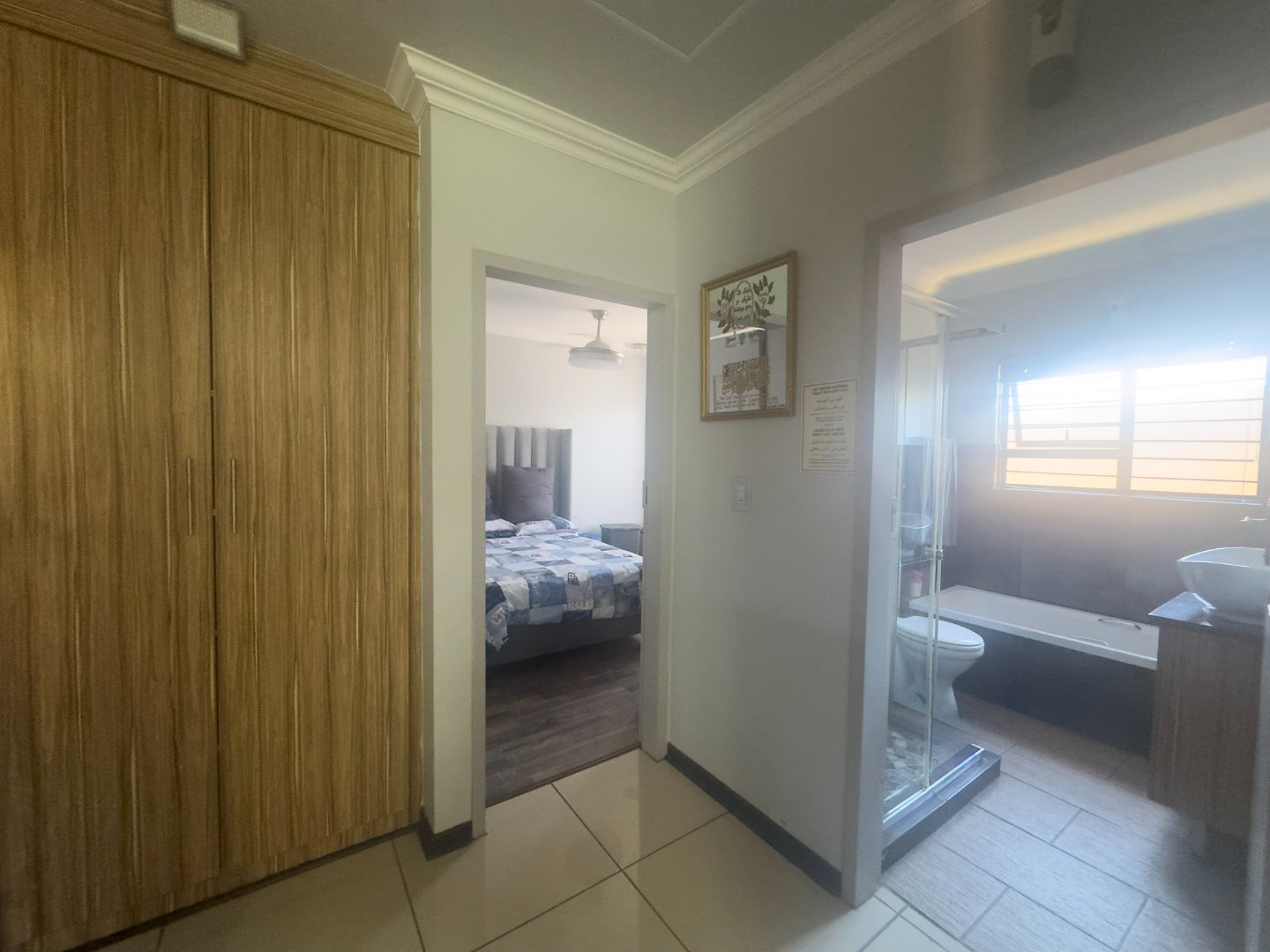 The home offers three generously sized bedrooms, all fitted with built-in cupboards and ceiling fans, along with two neat bathrooms. The main bedroom includes a private en-suite bathroom for added convenience.